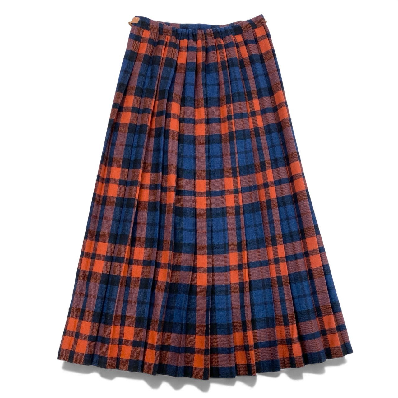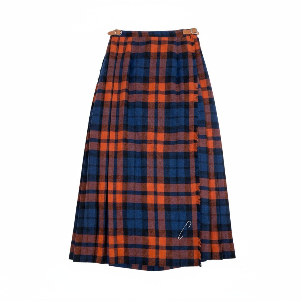 ブルー×オレンジのタータンチェックが美しく映える、O’NEIL OF DUBLIN の巻きスカートです。柔らかなウール素材で、見た目にもあたたかいマットな質感が魅力。サイドのレザーベルトと大きめクリップがアクセントになり、伝統的なキルトの雰囲気をしっかり楽しめます。ロング丈シルエットで上品にまとまり、ニットやブーツとの相性も抜群。秋冬シーズンのトラッドコーデに取り入れたい一着です。