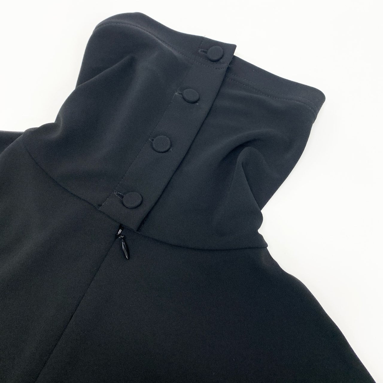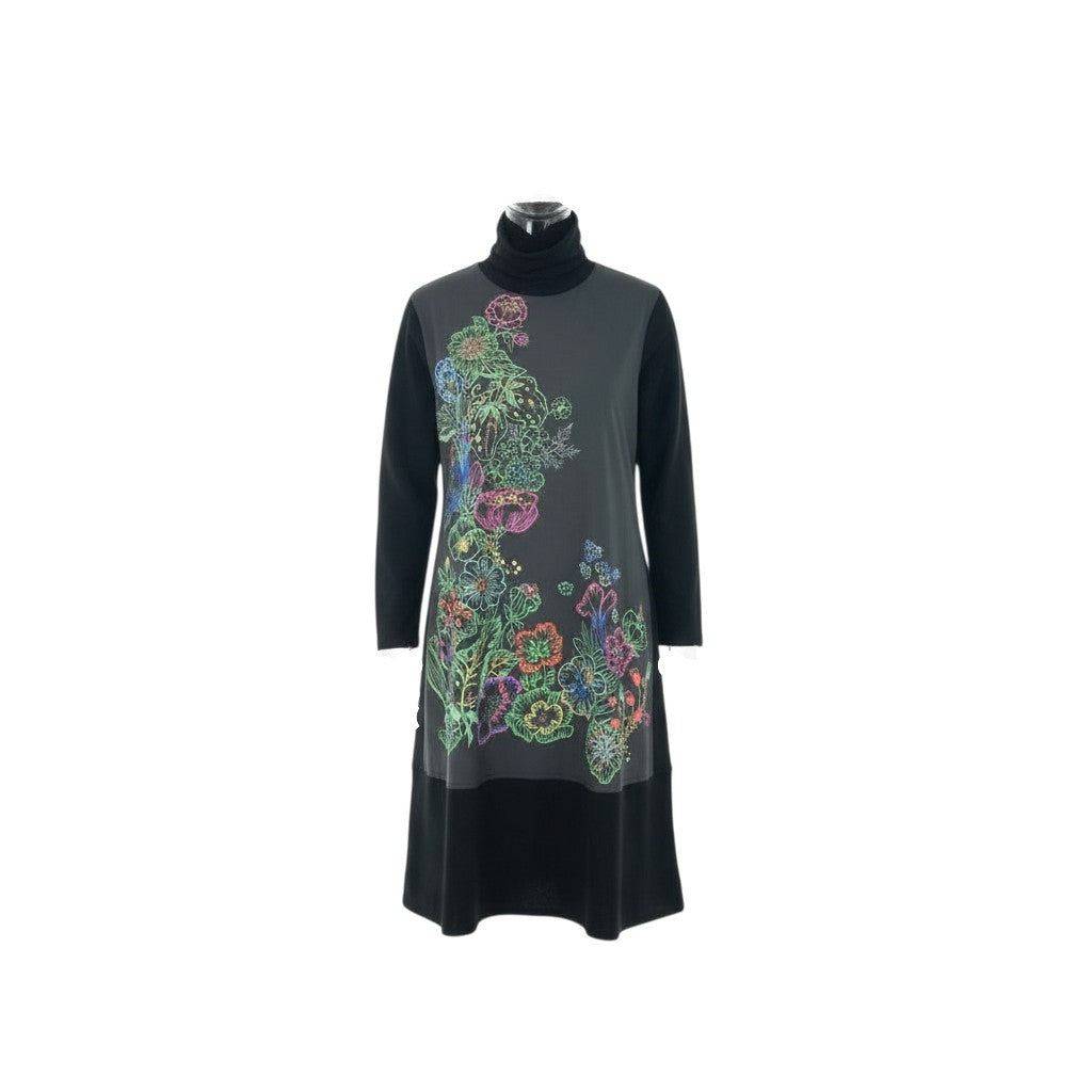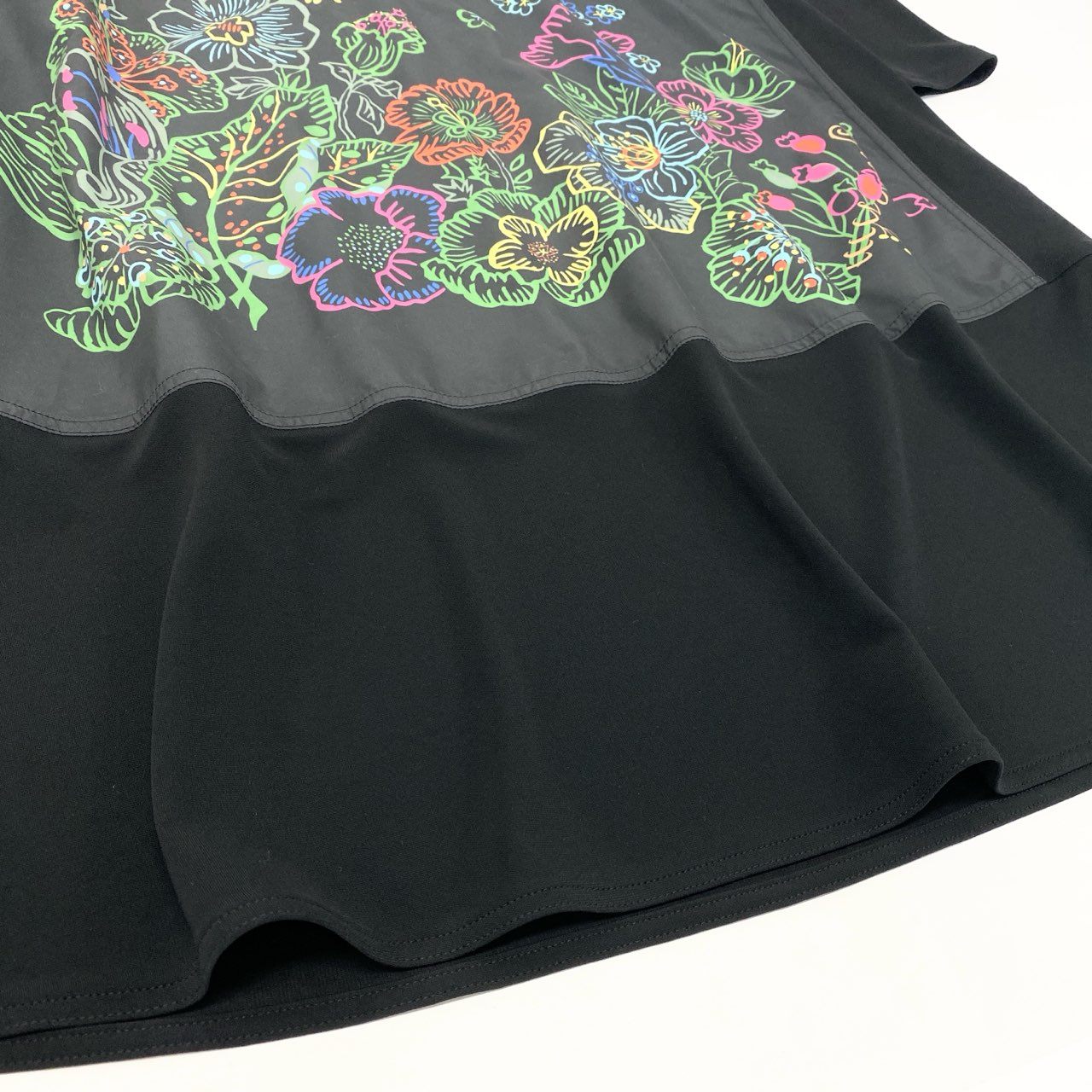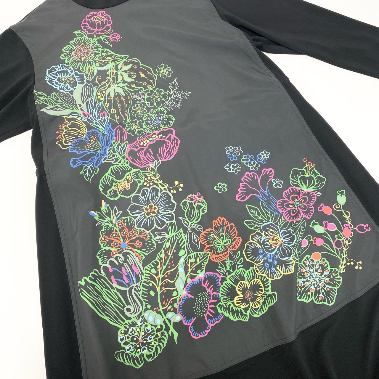 深みのあるブラック×チャコールグレーをベースに、マルチカラーのボタニカルプリントを大胆に配したアート感あふれるロングワンピースです。花々が流れるように配置され、ピンク・ブルー・グリーンなどの彩りが映える華やかなデザイン。身頃はマットなジャージー素材、袖と裾は柔らかなニット調素材で切り替えられ、表情のあるシルエットに仕上がっています。ハイネックデザインが季節感を引き立て、1枚で主役級コーデが完成。日常のお出かけから舞台衣装まで幅広く活躍するTOKUKO 1er VOLらしい一着です。