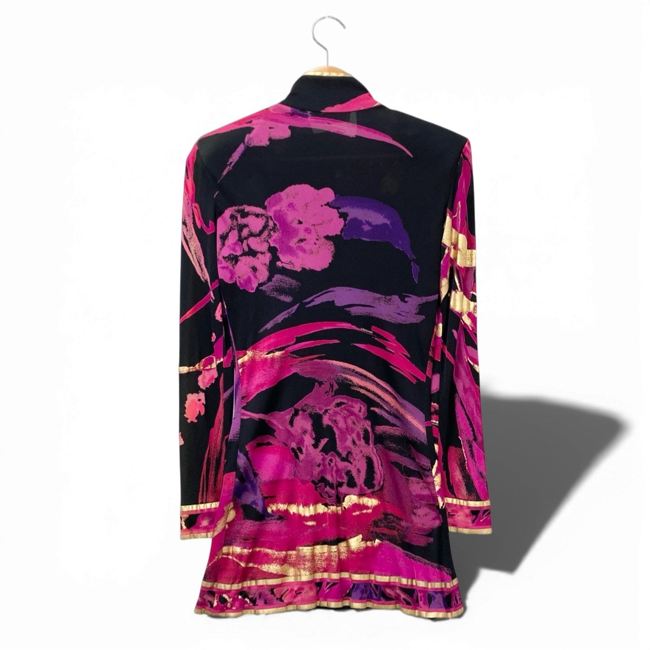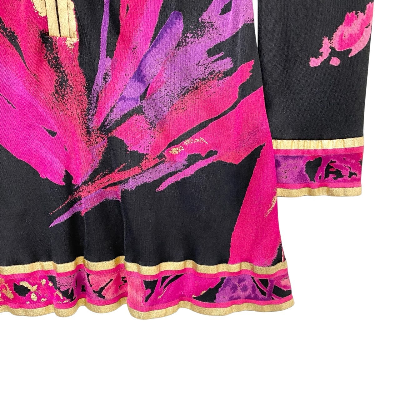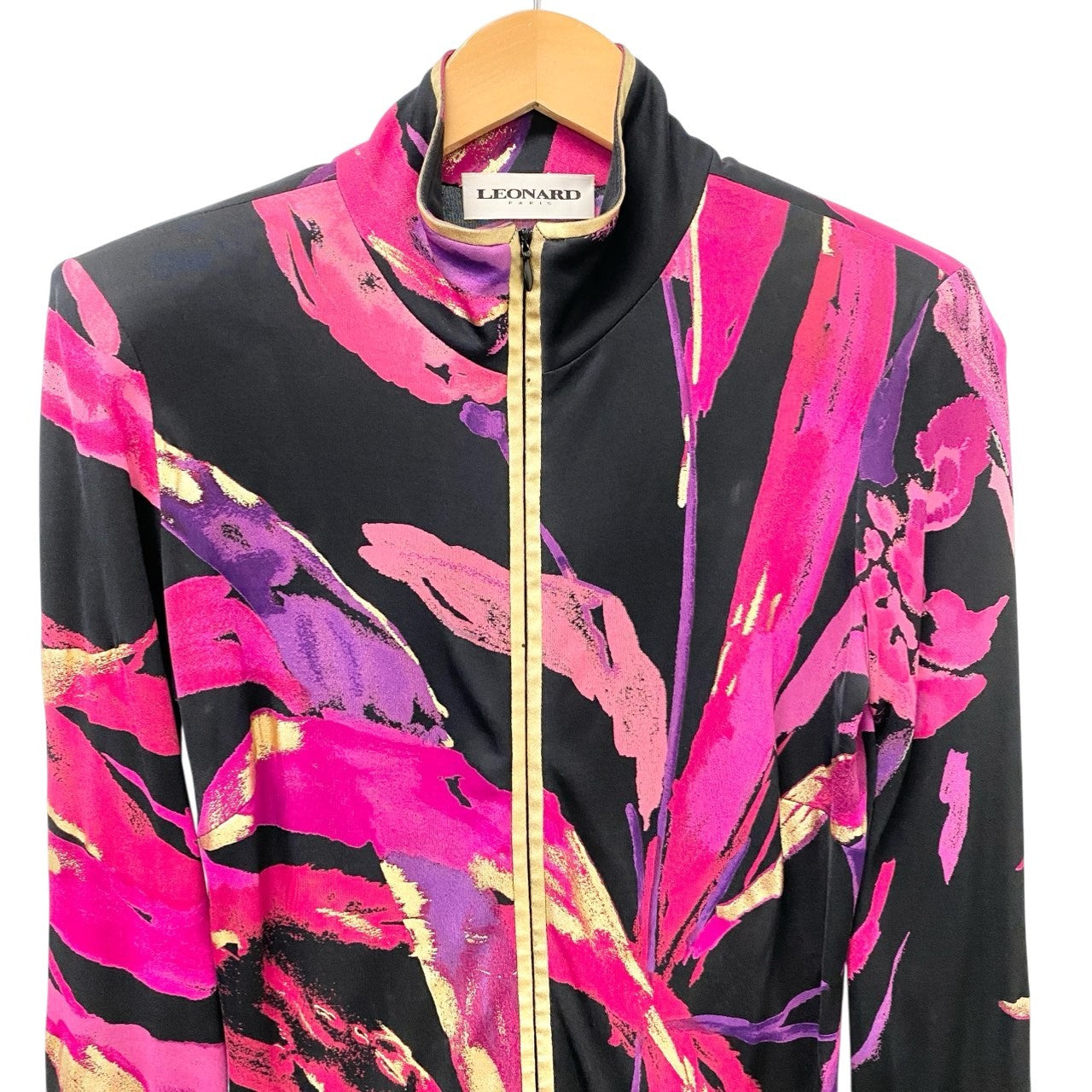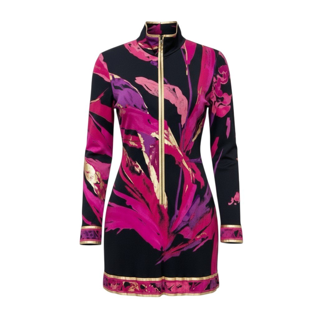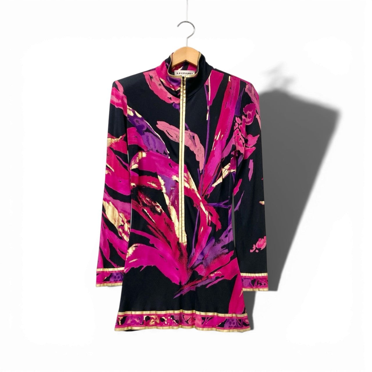 LEONARD らしい華やかなプリントが目を引くチュニックワンピースです。ブラックをベースにフューシャピンクやパープル、ゴールド系のボタニカル調アートプリントが大胆に施されたデザイン。素材は滑らかな光沢感のあるシルク生地で、軽やかで高級感のある着心地が魅力です。フロントのゴールドハーフジップがアクセントになり、レギンスやスキニーパンツと合わせたエレガントなカジュアルスタイルにもおすすめの一着です。