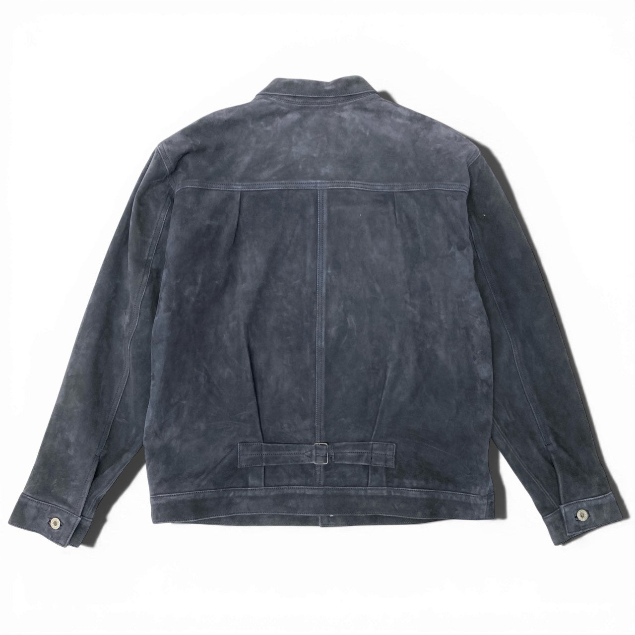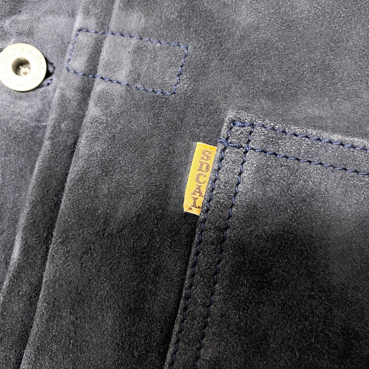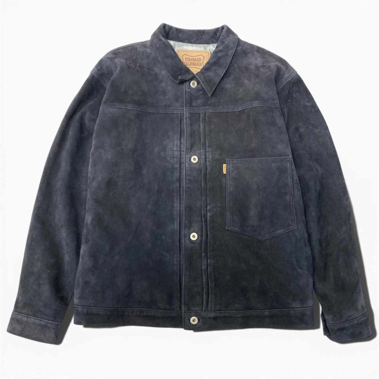 STANDARD CALIFORNIAのS996レザージャケットです。落ち着いたミッドナイトネイビーの山羊革スウェードレザーを使用し、マットで柔らかな質感が特徴です。フロントのメタルボタンとシンプルな胸ポケットがワークテイストを演出し、ヴィンテージ感のある表情に仕上がっています。ゆったりしたシルエットでデニムやチノパンと合わせたカジュアルスタイルにおすすめの一着です。長く愛用できる上質なレザージャケットとなっています。