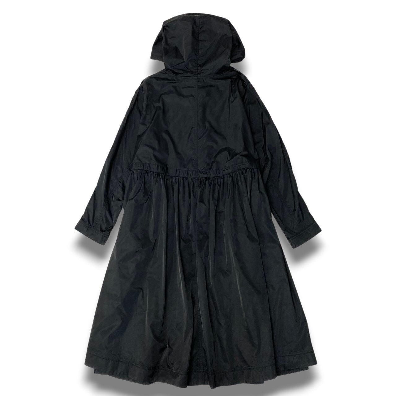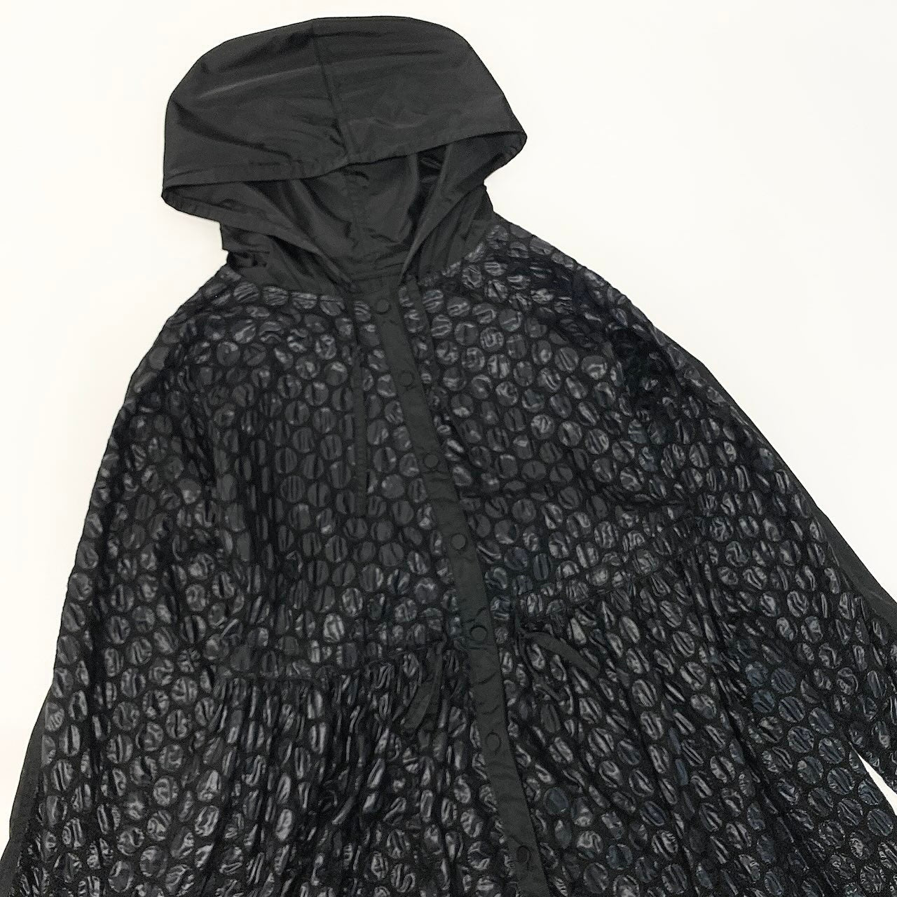 トクコプルミエヴォルのフーデットスプリングコートです。ブラックを基調にしたドット柄(水玉模様)が全体に施され、華やかでアート性のあるデザインが特徴。軽やかな薄手素材で、春や秋の羽織りとして活躍するロング丈コートです。フード付きデザインとゆったりとしたシルエットがリラックス感を演出し、デイリーからモードスタイルまで幅広く取り入れられる一着です。