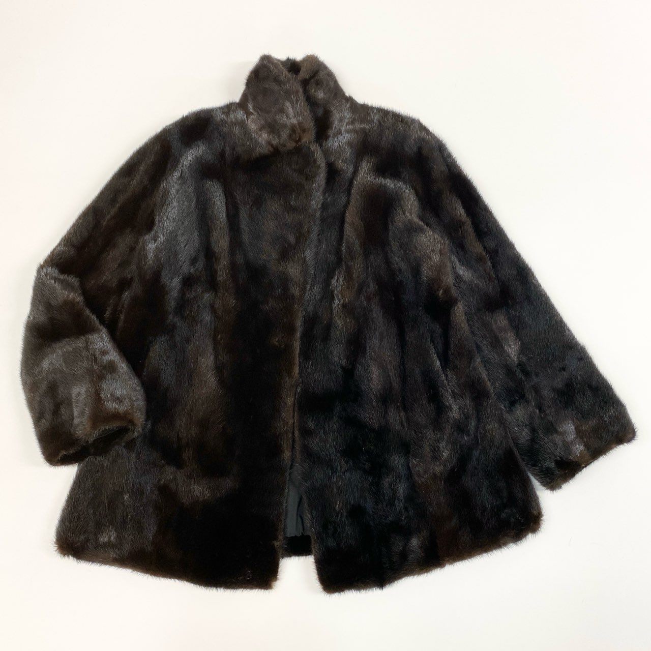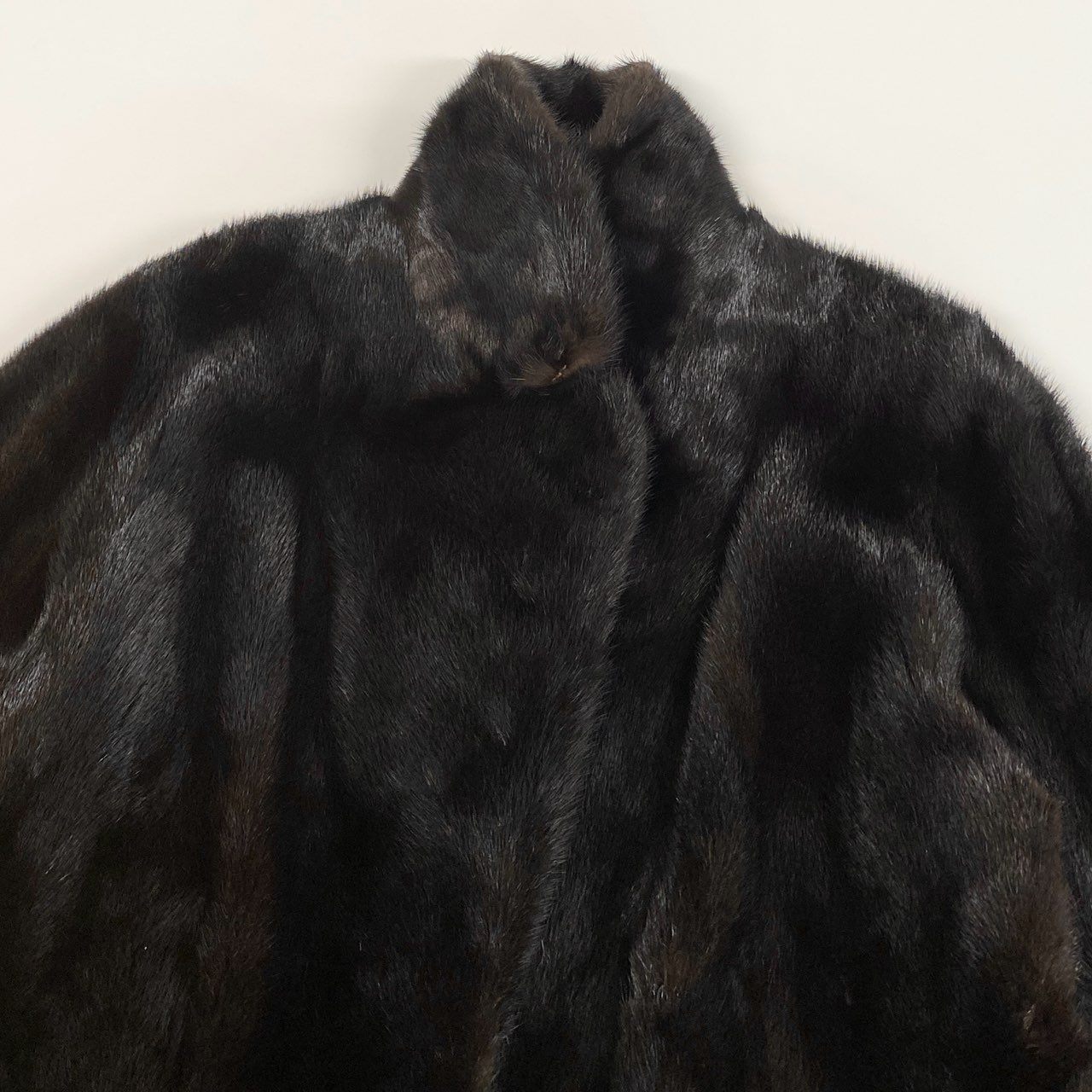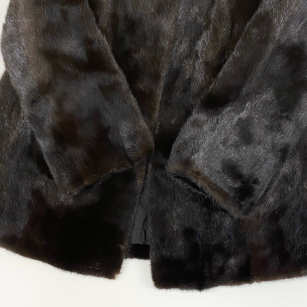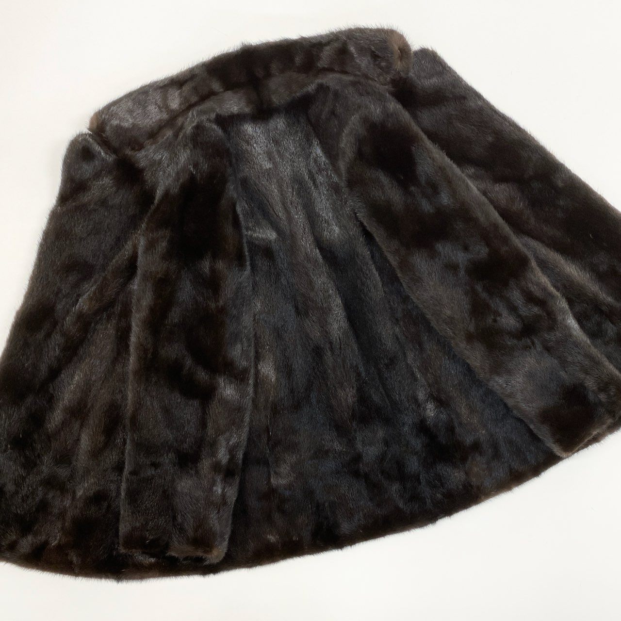 ブラックグラマのマホガニーミンクコート。深みのあるダークブラウンカラーで、上品な光沢感が魅力です。柔らかく滑らかな毛並みがラグジュアリーな雰囲気を演出し、シンプルなデザインながら高級感漂う仕上がり。ミドル丈で使いやすく、フォーマルなシーンはもちろん、特別なお出かけやディナーにも映える一着です。裏地付きで保温性と快適さを兼ね備えています。