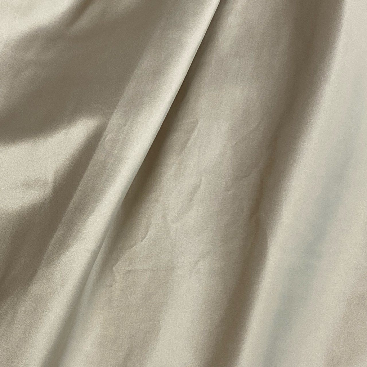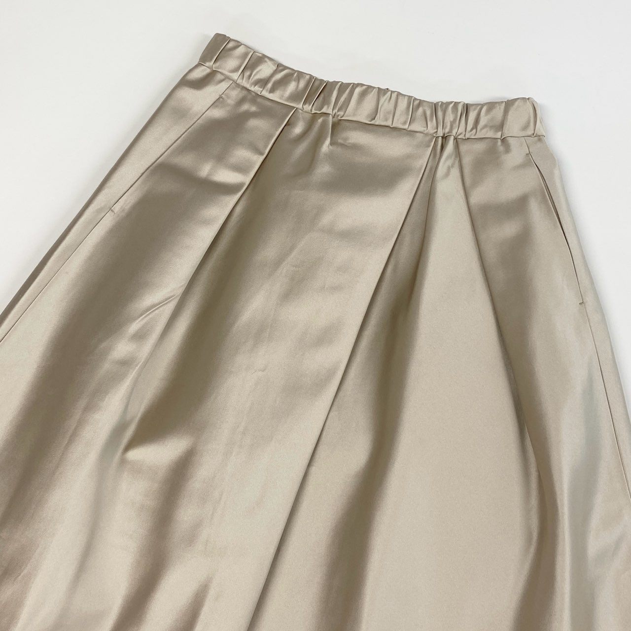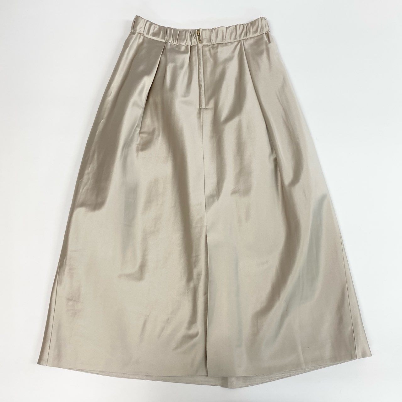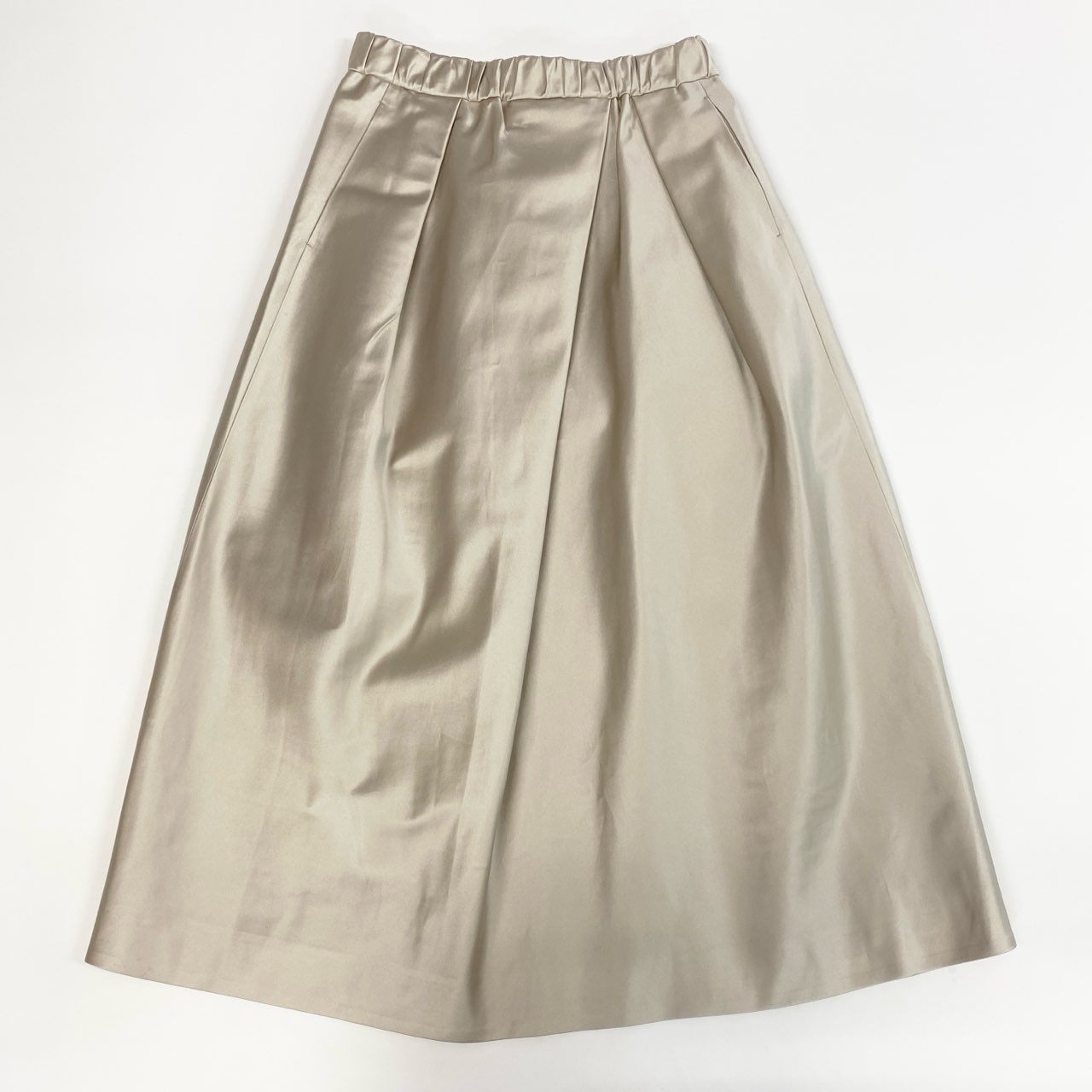 ドゥロワー(Drawer)のエレガントなシルクフロントタックフレアスカート。柔らかな光沢を持つベージュカラーが上品で、フロントに入ったボックスプリーツが立体感と動きを演出します。さらりとしたシルク混素材で落ち感が美しく、シーズンを問わず快適に着用可能。ブラウスやニットを合わせるだけで洗練された大人のスタイルが完成します。オン・オフ問わず活躍する、タイムレスな一着です。