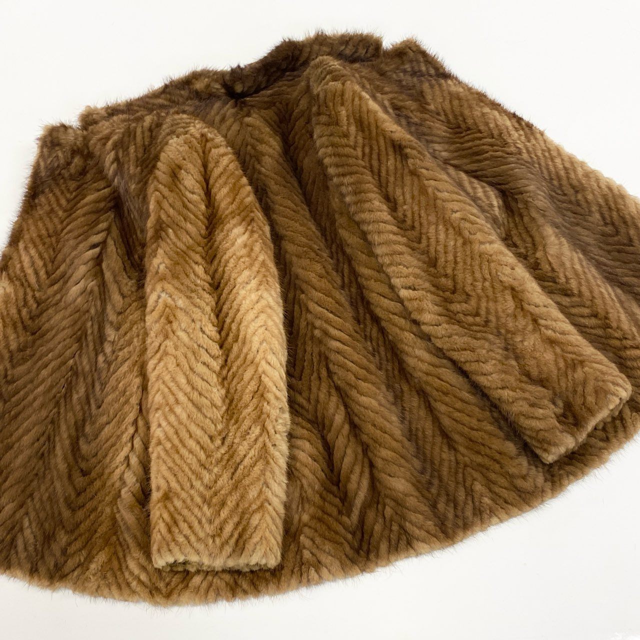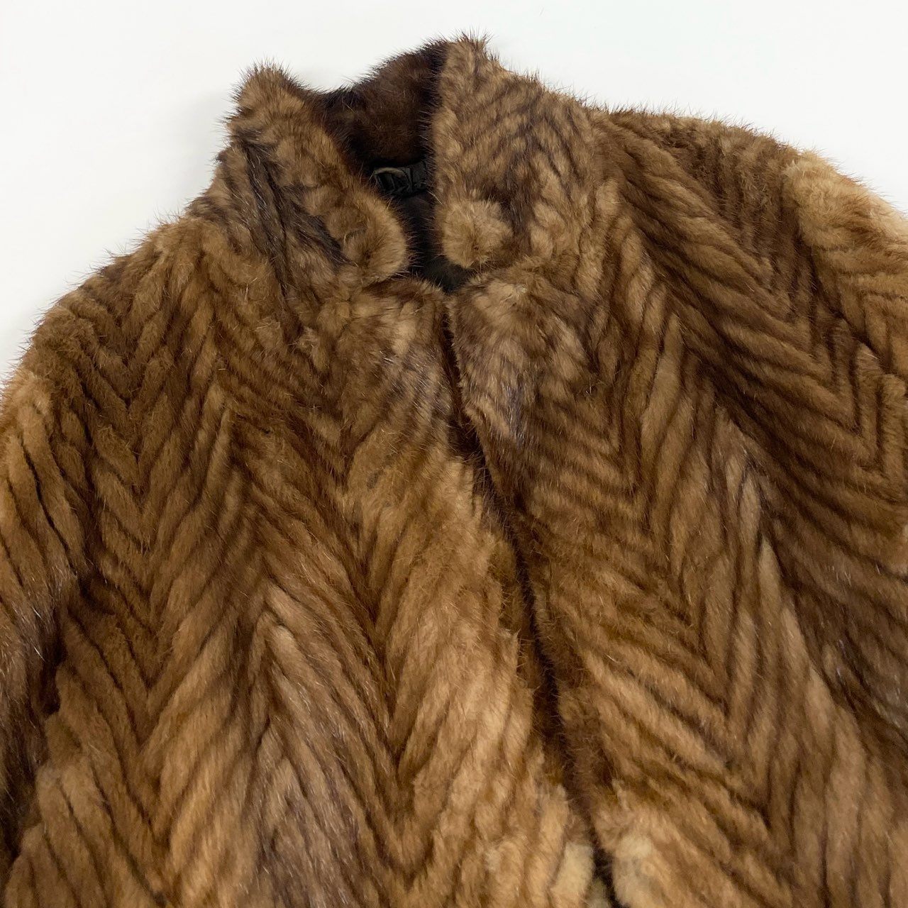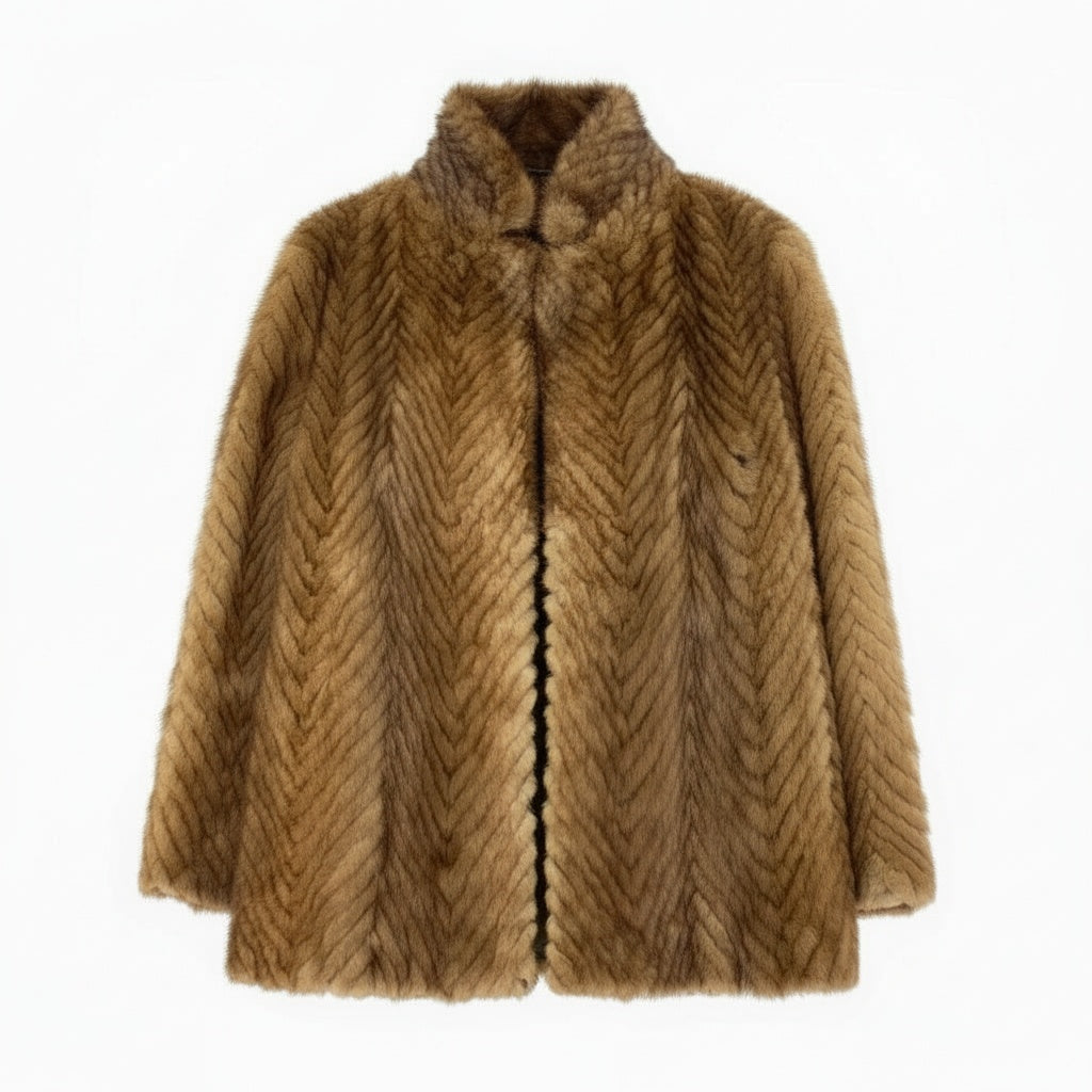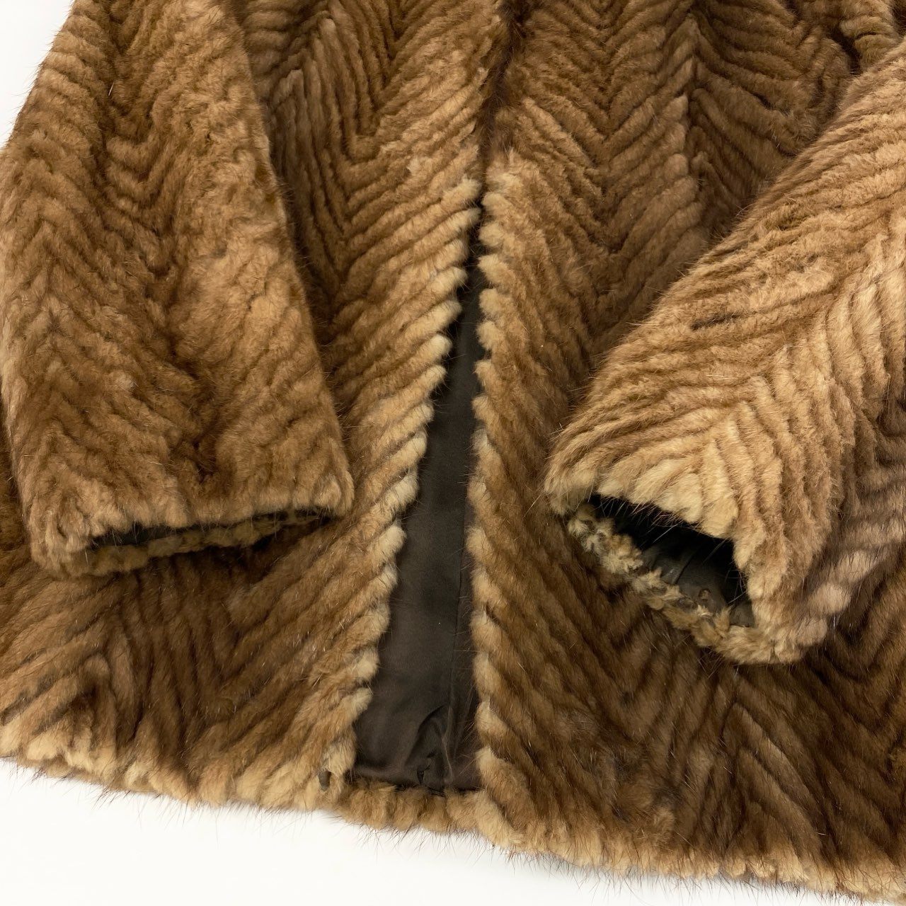やわらかなライトブラウンカラーが上品な印象の、パステルミンクを使用した毛皮コートです。毛並みを活かしたヘリンボーン調のパターンが立体感を生み、クラシックで高級感のある仕上がりになっています。ミンク特有のなめらかな手触りと自然な艶感が、装いを格上げしてくれます。フォーマルなお出かけから、上質感を取り入れた大人のデイリーコーデまで幅広く活躍する一着です。