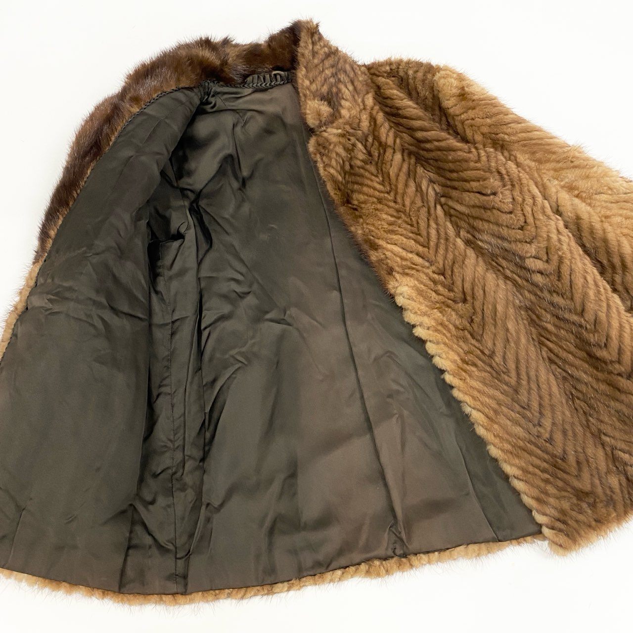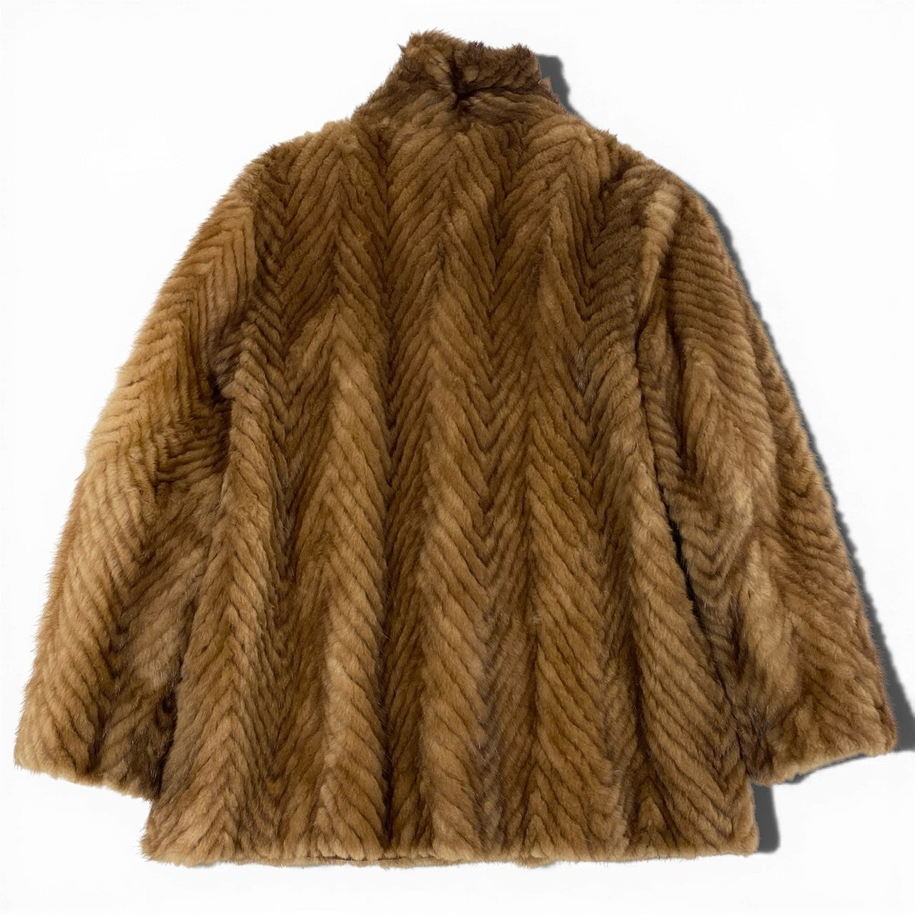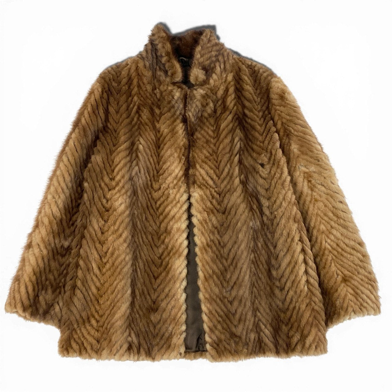 やわらかなライトブラウンカラーが上品な印象の、パステルミンクを使用した毛皮コートです。毛並みを活かしたヘリンボーン調のパターンが立体感を生み、クラシックで高級感のある仕上がりになっています。ミンク特有のなめらかな手触りと自然な艶感が、装いを格上げしてくれます。フォーマルなお出かけから、上質感を取り入れた大人のデイリーコーデまで幅広く活躍する一着です。