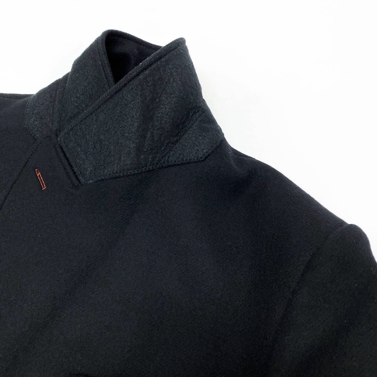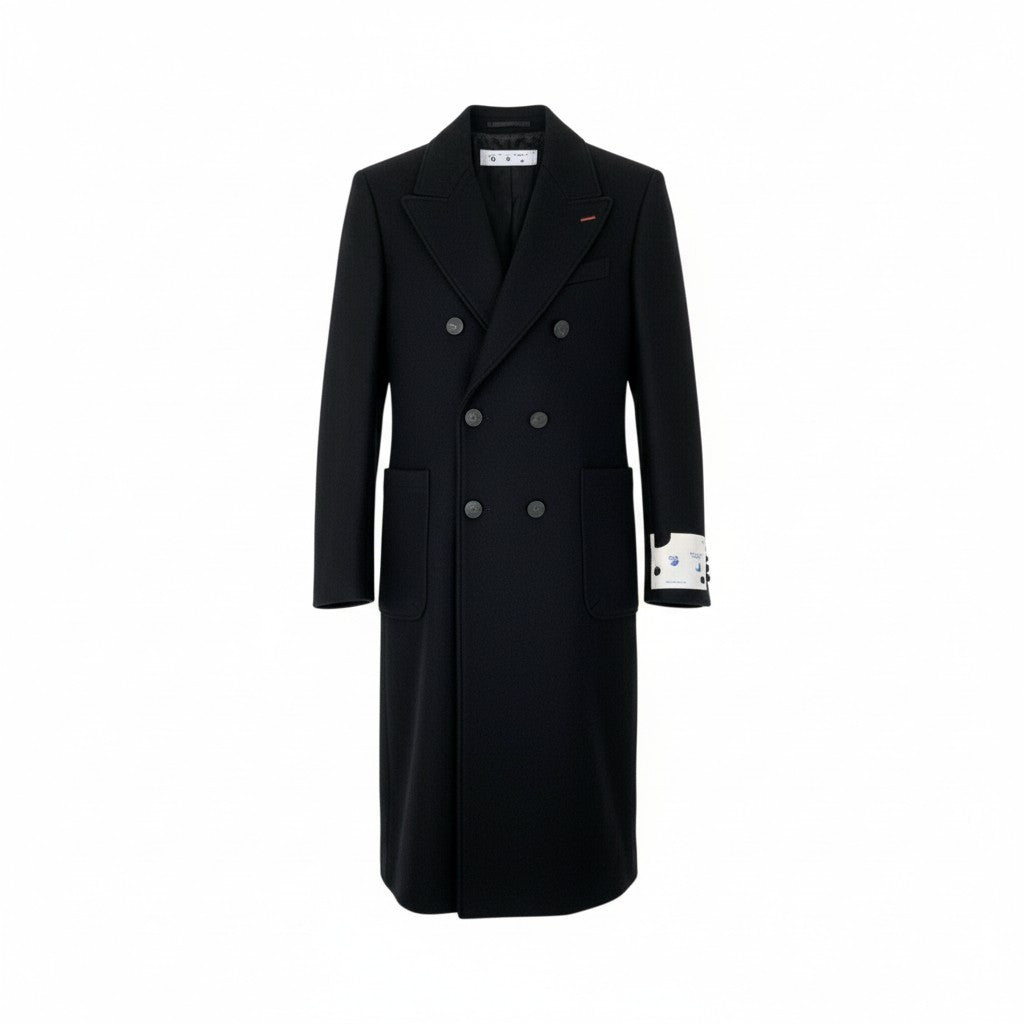 深みのあるブラックに、ダブルブレストの重厚なデザインが映えるオフホワイトのロングウールコートです。マットな質感のウールが上品で、存在感のあるピークドラペルがクラシックな印象を演出します。袖口のブランドらしいタグディテールがアクセントになり、シンプルながらモード感のある一着です。身幅にゆとりがあるため厚手ニットとの相性も良く、冬場のタウンユースやドレススタイルのアウターとしても活躍します。高級感と防寒性を兼ね備えた、汎用性の高いロングコートです。