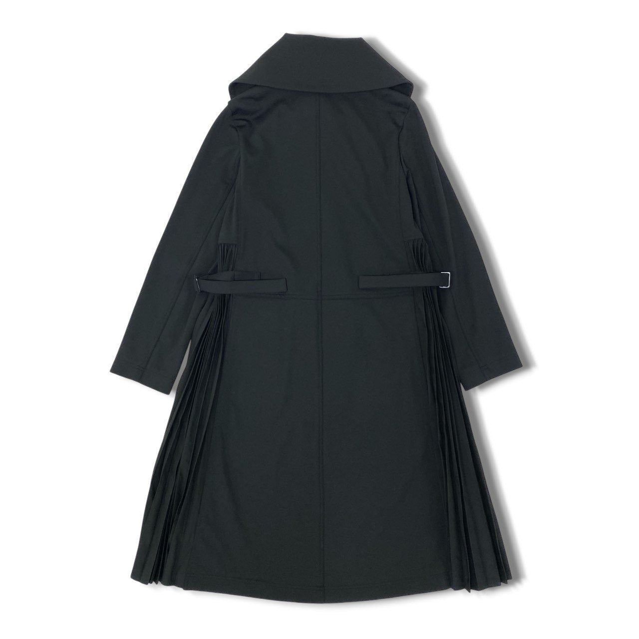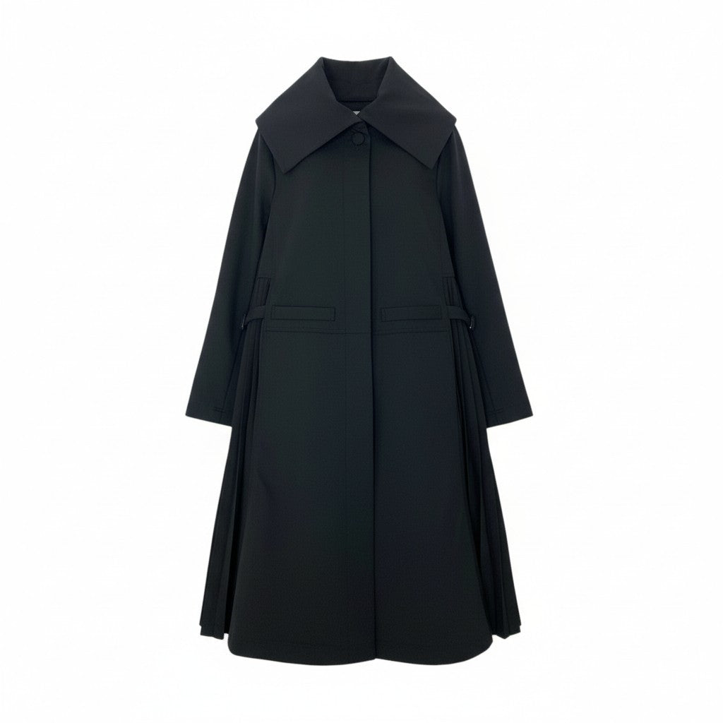 上品なマットブラックをベースに、サイドへ大きく広がるプリーツ切り替えが特徴的なTOKUKO 1er VOLのロングコートです。存在感のあるビッグカラーがアクセントとなり、顔まわりに華やかさをプラス。両サイドのプリーツが動きに合わせて広がり、エレガントで立体的なシルエットを演出します。ウエストにはバックル付きベルトが配され、スタイル調整もしやすい万能デザイン。普段のお出かけからフォーマルなシーンまで幅広く活躍する、上質な一着です。