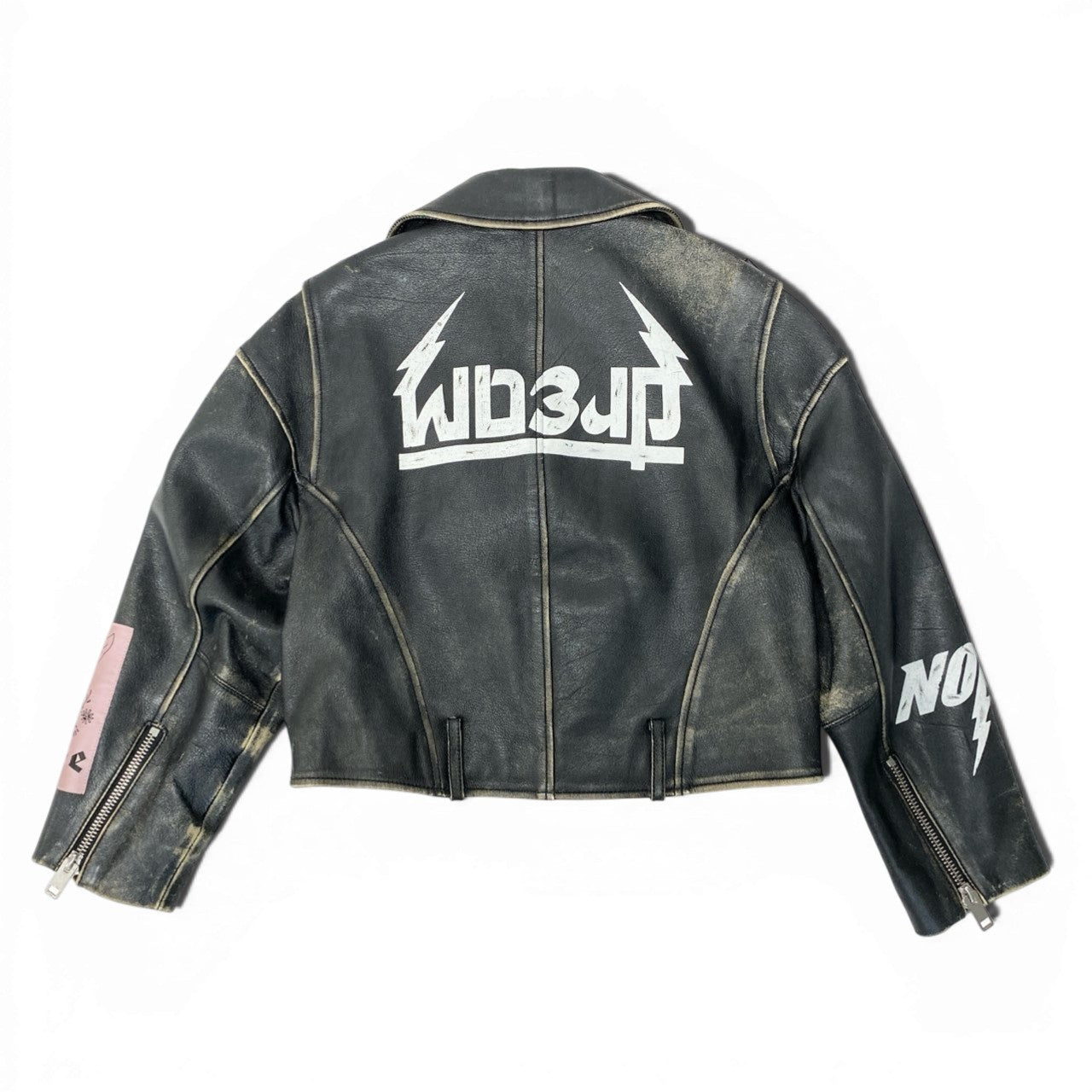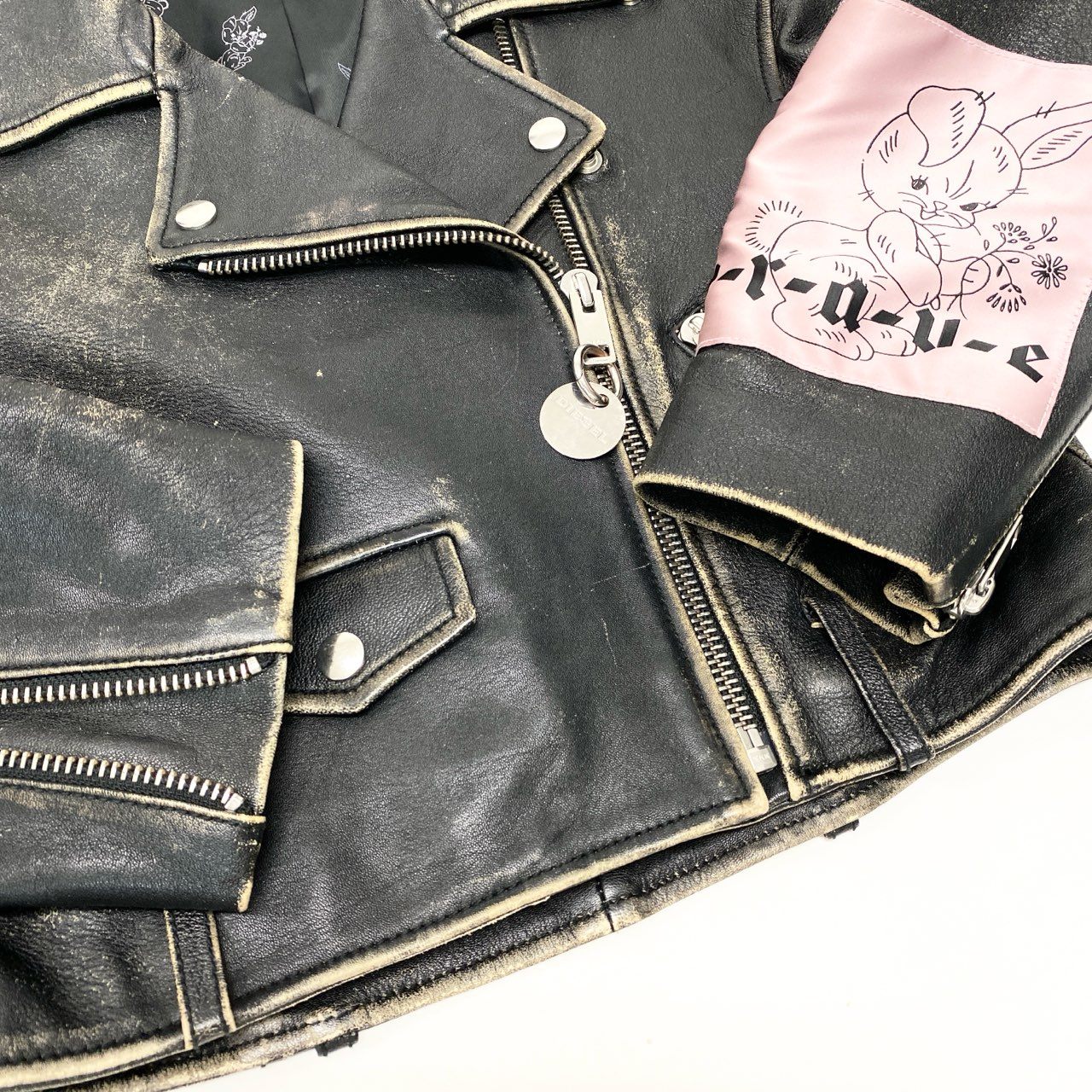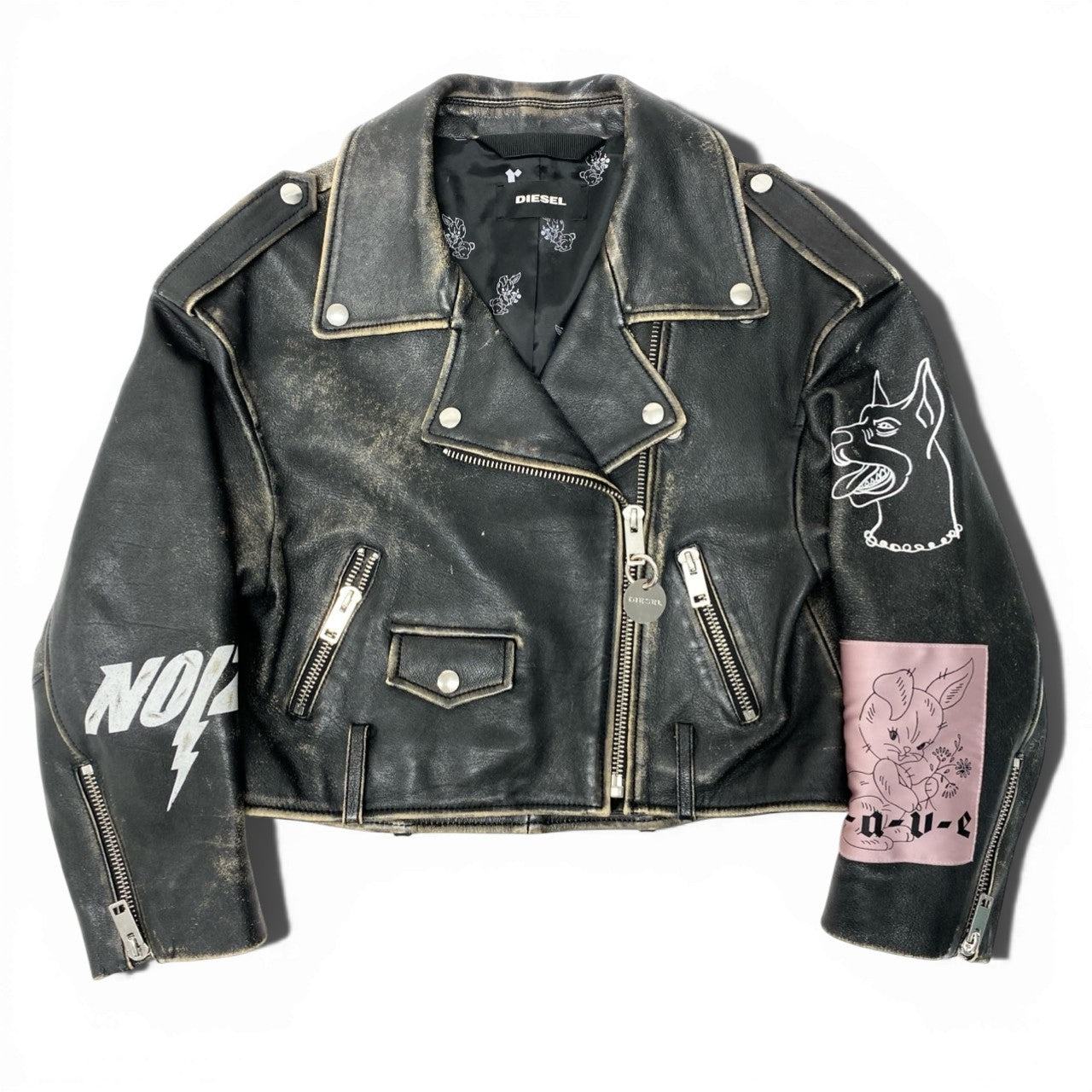 DIESELのダブルライダースジャケットです。ブラックの羊革レザーにダメージ加工を施し、ヴィンテージ感のある風合いが特徴です。袖には犬モチーフのグラフィックやピンクのワッペン、NOIZEロゴプリントなど個性的な装飾がデザインされています。メタルジップやエポレットなど本格的なライダースディテールも魅力です。コンパクトなショート丈で、デニムやスカートと合わせたロックテイストのコーディネートにおすすめの一着です。