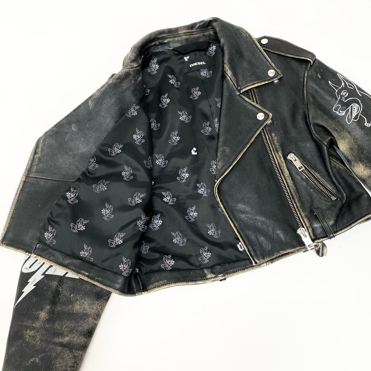 83c3 DIESEL ディーゼル ダブルライダースジャケット レザージャケット ダメージ加工 ペイント ワッペンデザイン XXSサイズ ブラック 羊革 レディース 女性用o07t