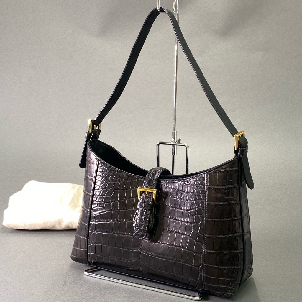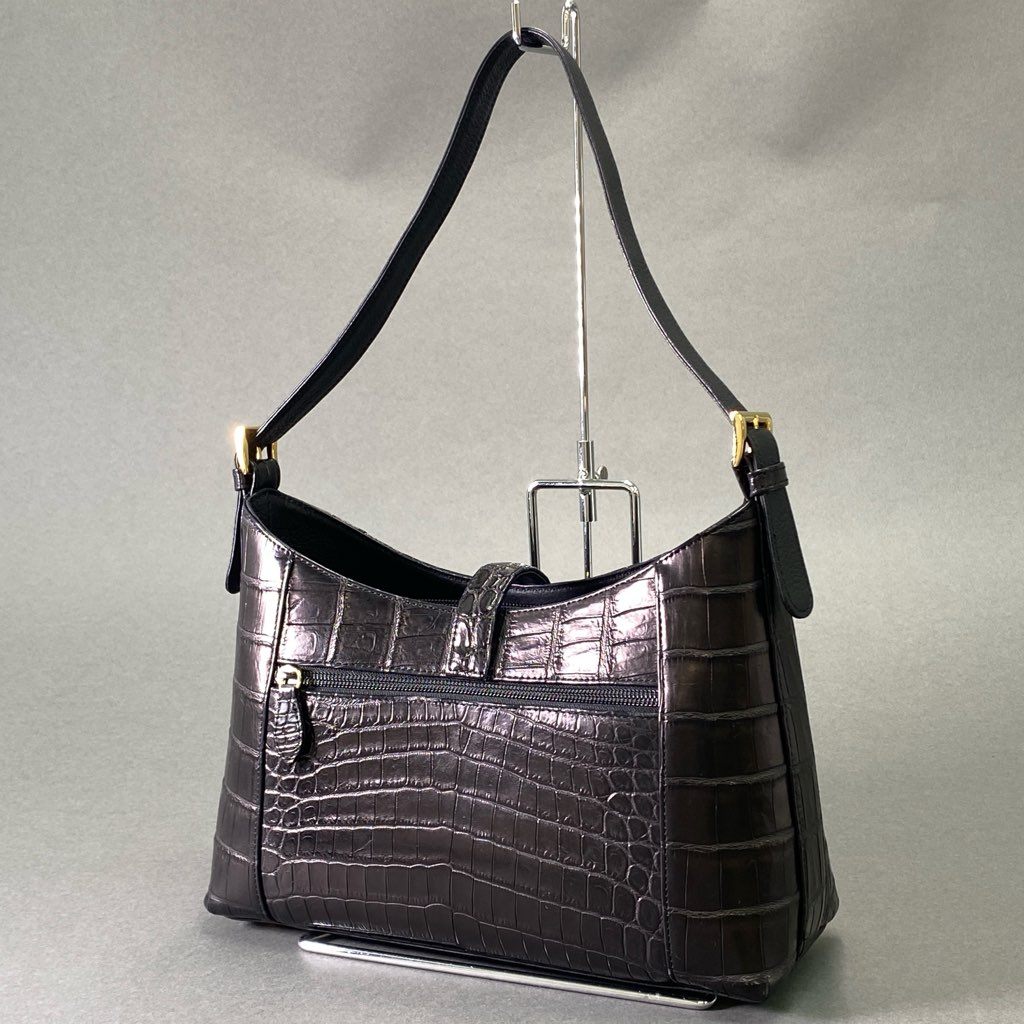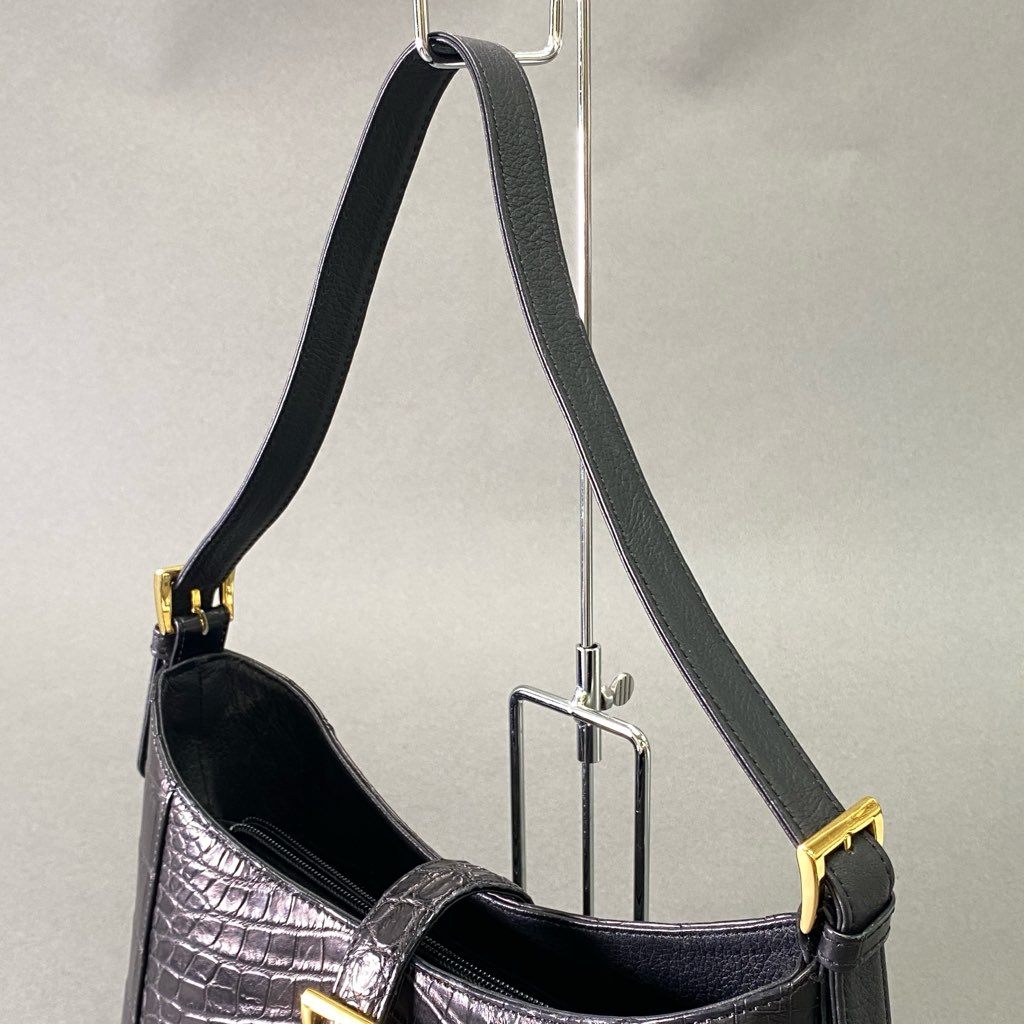 De17 【美品】 本革 クロコダイルレザー センター取り ワンショルダーバッグ ブラック マットクロコ レディース 女性用 鞄 ゴールド金具