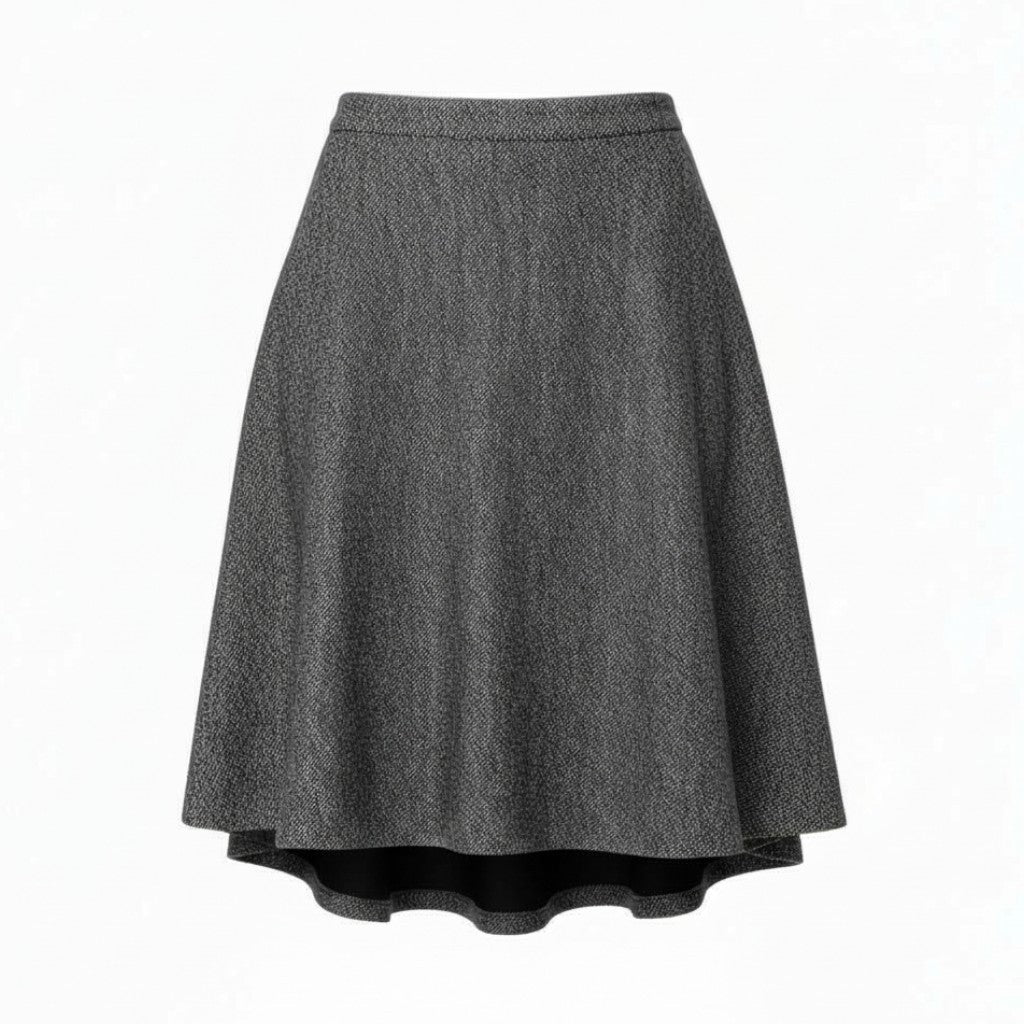 セリーヌらしい端正でミニマルな印象のフィッシュテールスカートです。ダークグレーのメランジカラーが上品で、無地ながら奥行きのある表情を演出します。マットなウール調素材感で、秋冬スタイルに自然に馴染む一着です。バックジップ仕様ですっきりとしたウエストラインを保ちつつ、裾に向かって美しく広がるシルエットが魅力で、通勤からお出かけまで幅広く活躍します。