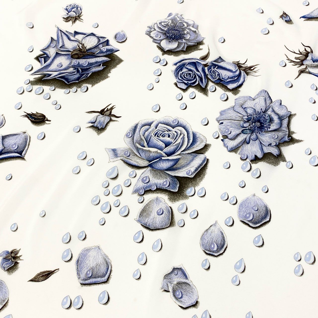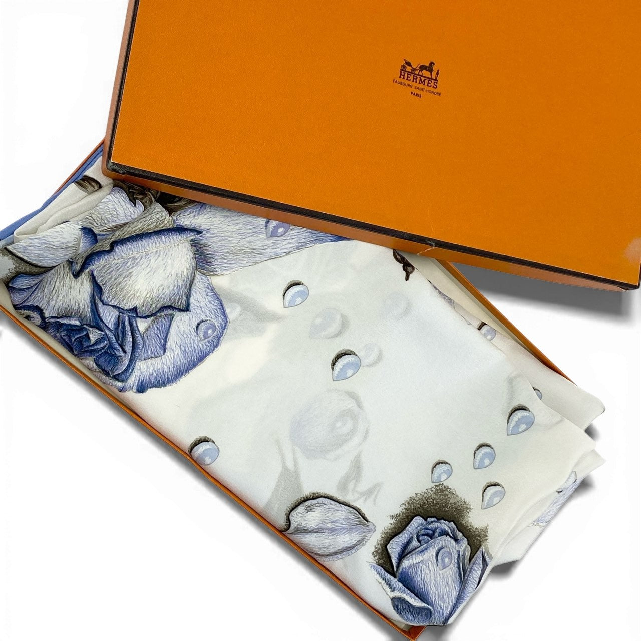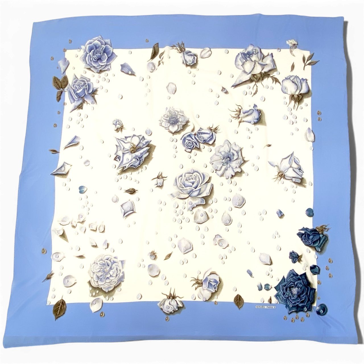 優しいスカイブルーの縁取りに、アイボリーホワイトのベースが映えるエレガントなデザインです。 淡いブルーからネイビーまでグラデーションの薔薇モチーフと、雫のようなドット柄が繊細に描かれています。 なめらかで上質な質感が感じられ、エルメスらしい芸術性の高い一枚です。 ショールとしてドレススタイルに合わせたり、コーディネートの主役として華やかさを演出できるラグジュアリーなスカーフです。