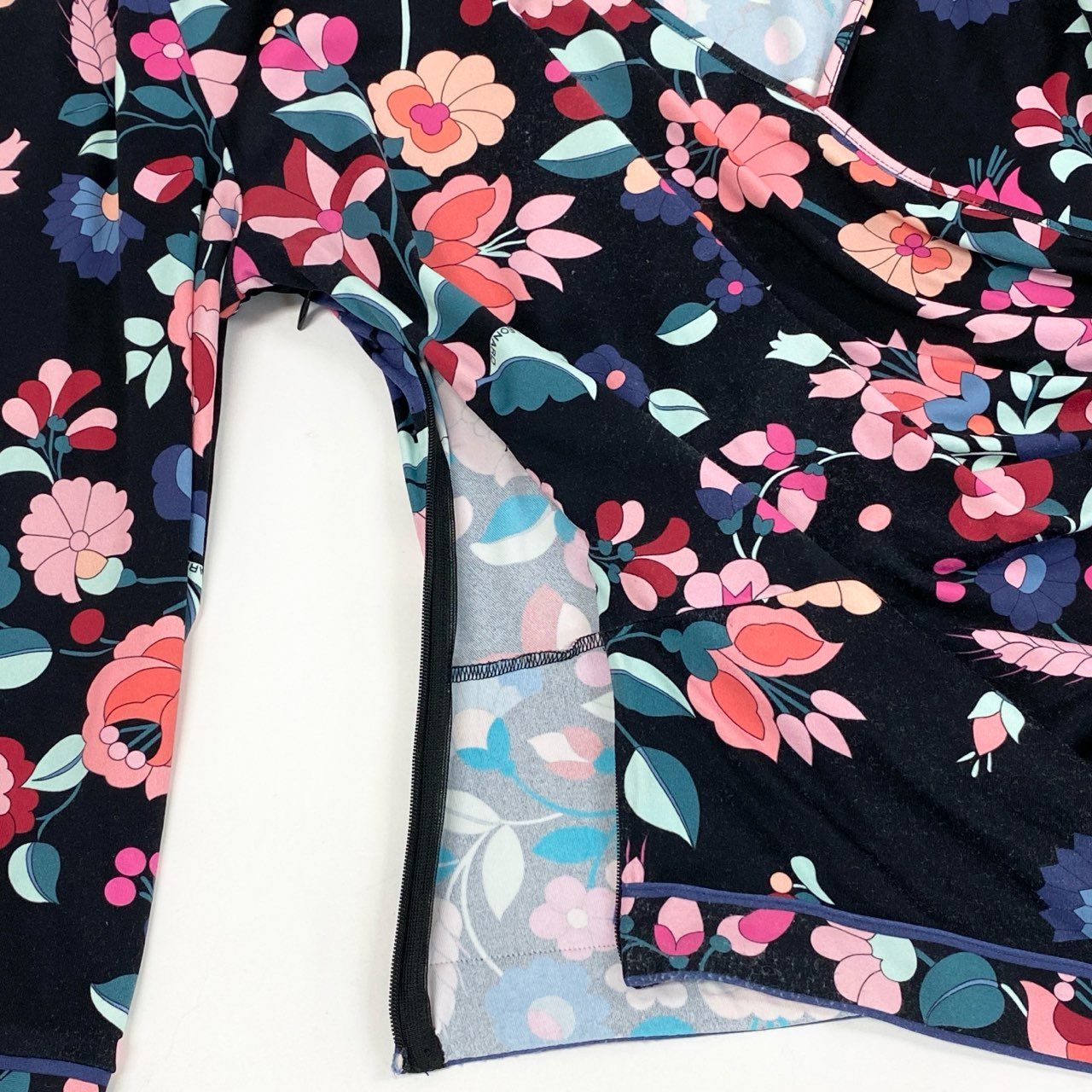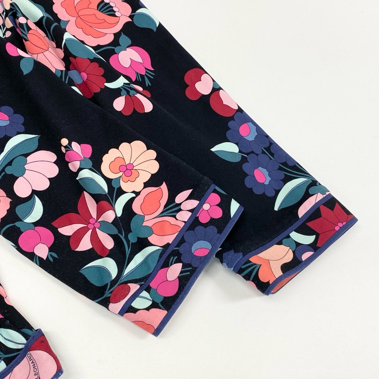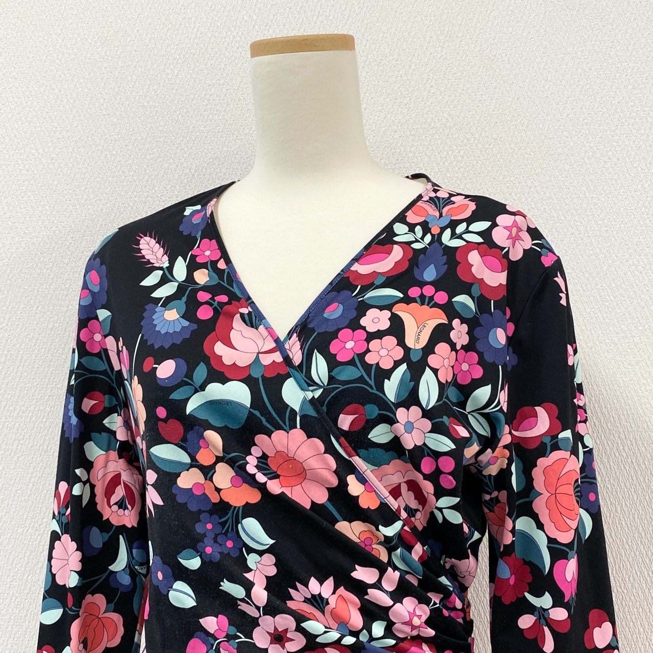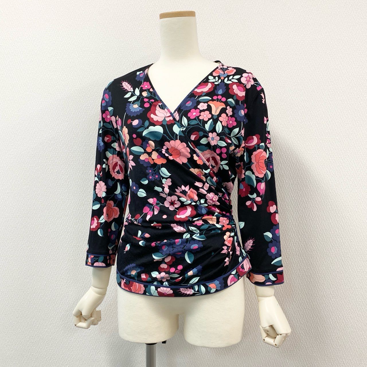 こちらはレオナールのカシュクールカットソーで、ベースカラーはブラックに、ピンク・レッド・ブルー・パープルなど鮮やかなフラワープリントが全面に施されています。伸縮性のあるジャージー素材で、しなやかなドレープと光沢感があり、動きに合わせて美しい表情を見せます。カシュクールのデザインが女性らしいシルエットを引き立て、華やかな印象を演出。普段使いからお食事会、ちょっとしたフォーマルシーンまで幅広く活躍する一枚です。