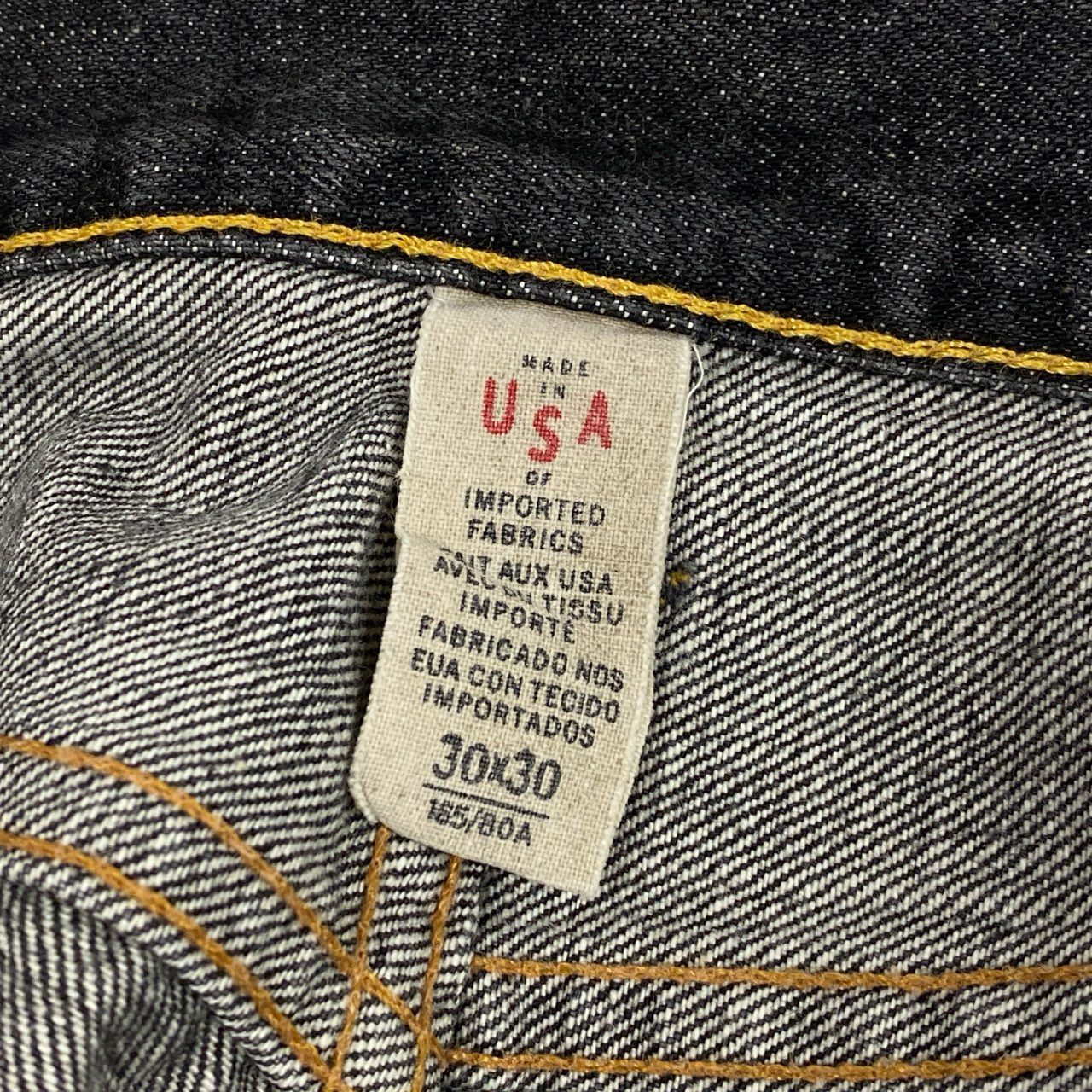 表記30×30、実寸ウエスト40cm(約80cm)・股下79.5cmのため、身長170〜175cm前後でフルレングスの標準的な丈感です。