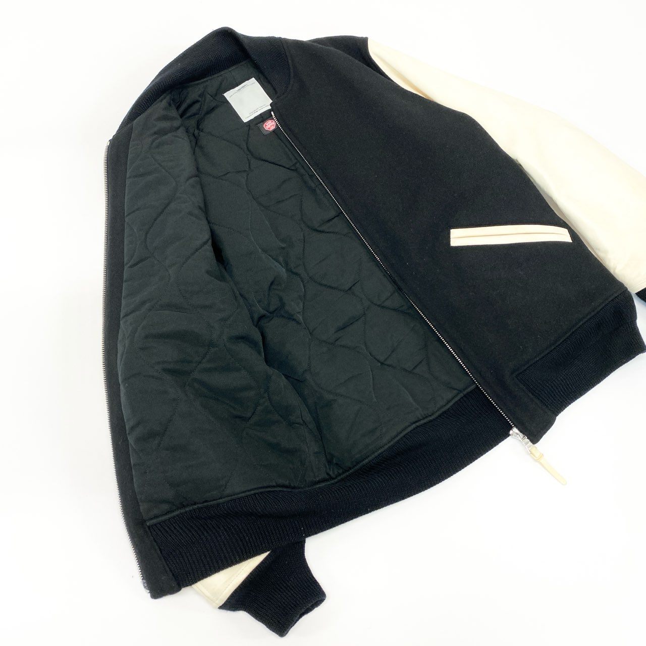 ブラック×アイボリーのコントラストが映えるバーシティジャケットです。身頃はマットなウール系素材感、袖はスムースなレザーで切り替えたクラシックな配色。リブ付きネック・袖口・裾、ジップフロント、配色パイピングのポケットなど正統派ディテールが魅力。デニムやチノとの相性が良く、秋冬のデイリーから週末スタイルまで活躍します。