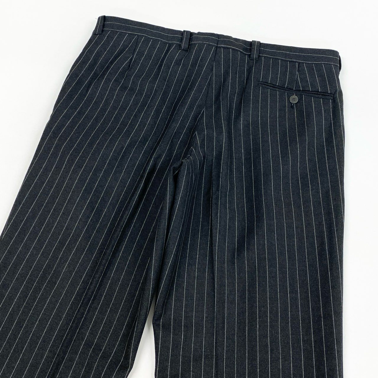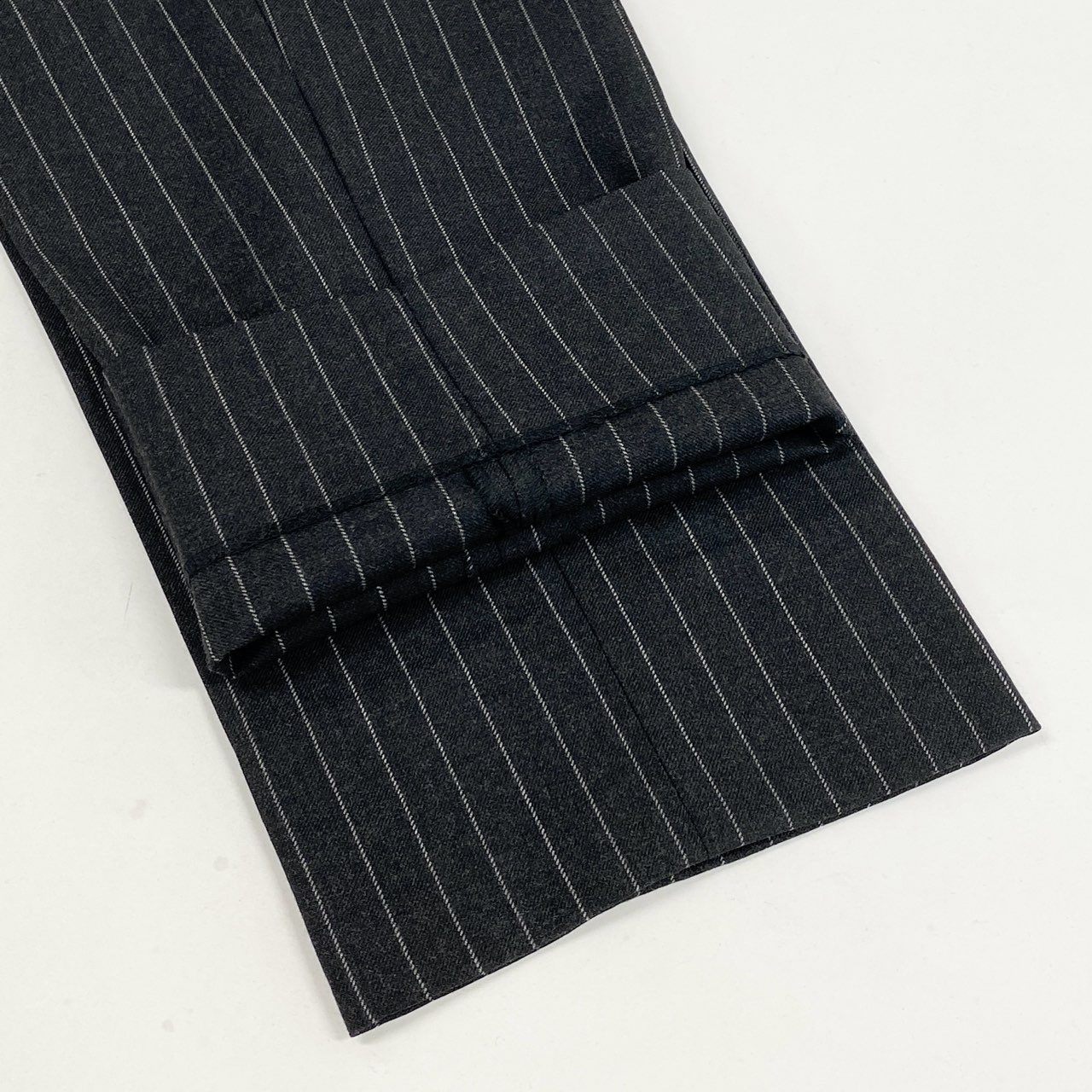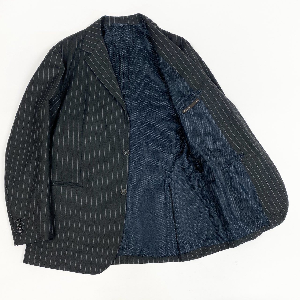 表記サイズ52、実寸はジャケット着丈77cm・肩幅48cm・身幅58cm・袖丈63cm、パンツはウエスト46cm(平置き)・股下82cmのため、身長175〜185cm前後、体格がしっかりした方に適したサイズ感です。