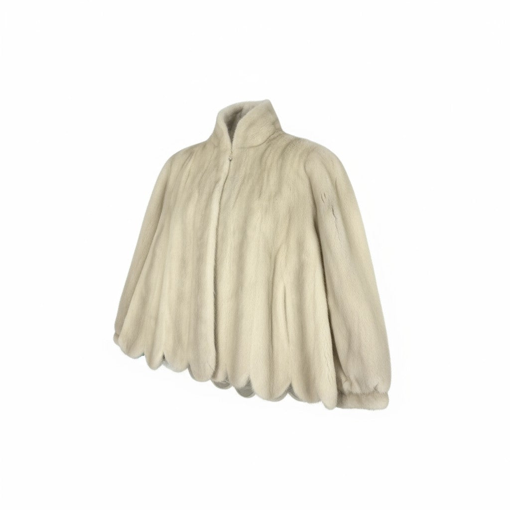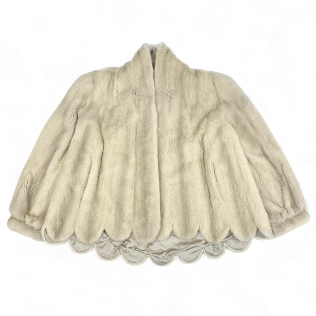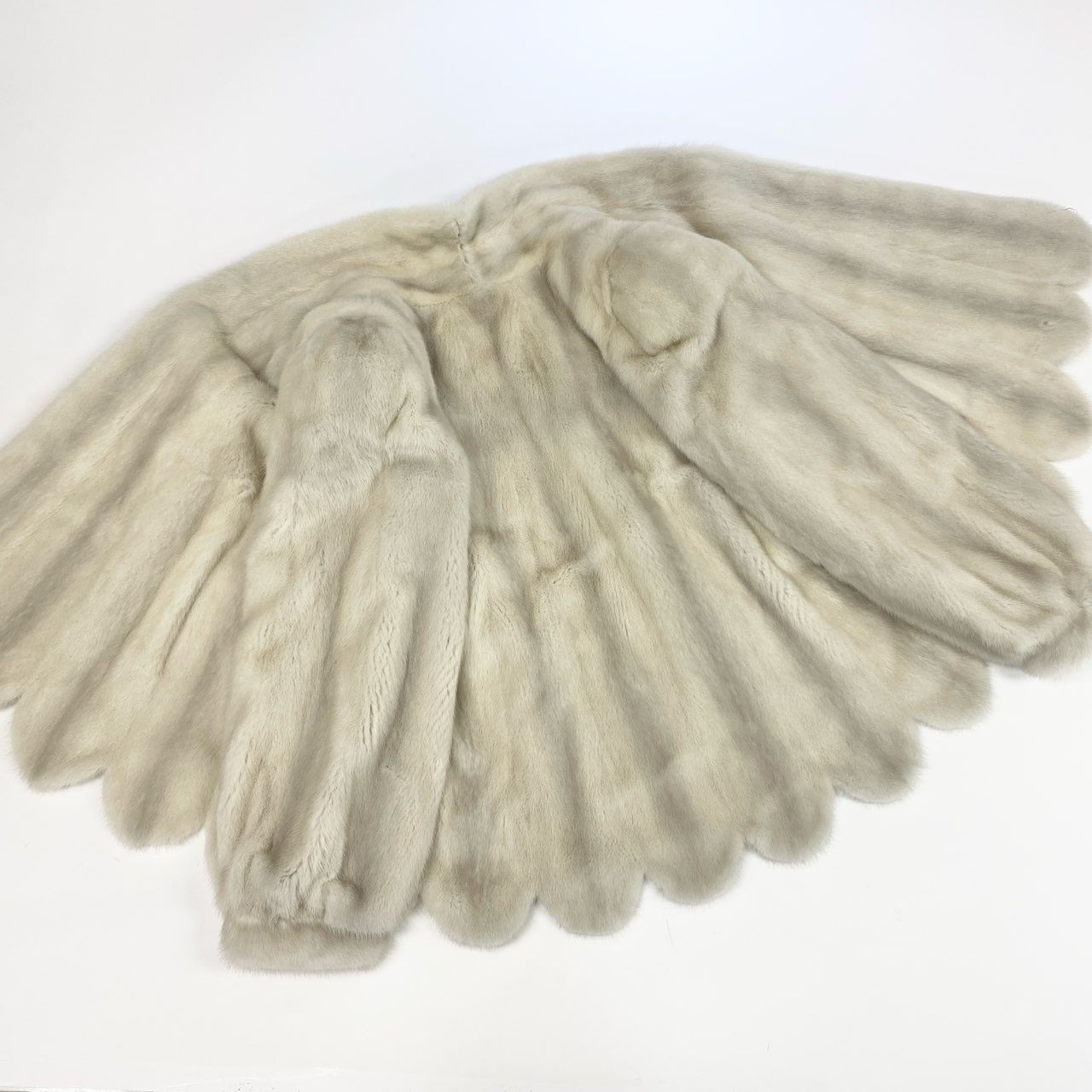 柔らかなアイボリーカラーが上品なパールミンクの毛皮コートで、自然な光沢としっとりとした毛足が高級感を演出します。裾にはスカラップ状のカッティングが施され、エレガントさを引き立てるディテールが魅力です。ふんわりとしたボリューム感がありながら軽く羽織れ、フォーマルシーンやパーティー、冬のお出かけコーデの格上げにも最適です。内側は滑らかなサテン調の裏地で、ドレスや繊細な素材のインナーとも相性良く着用できます。上質な毛並みのミンクを探している方におすすめの一着です。
