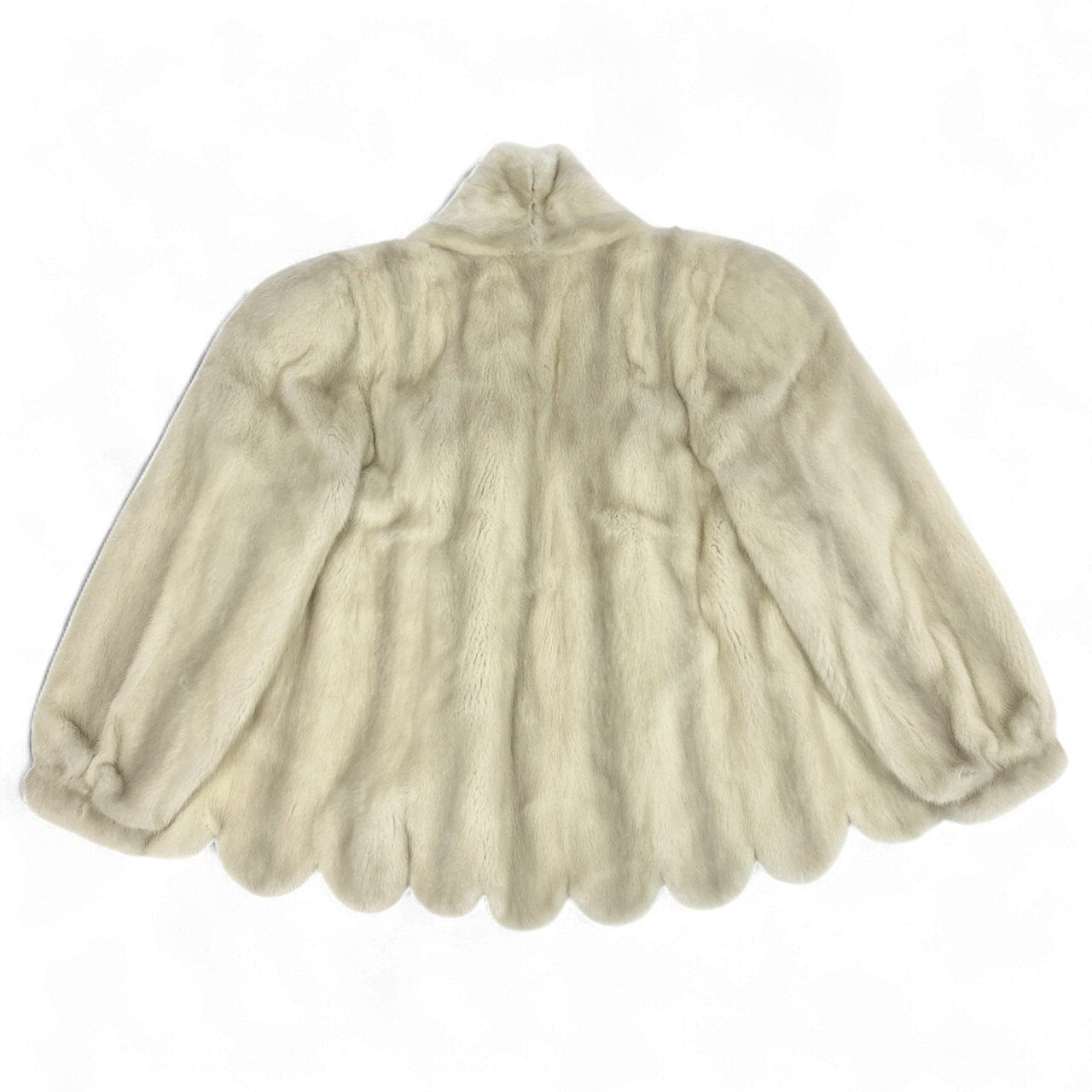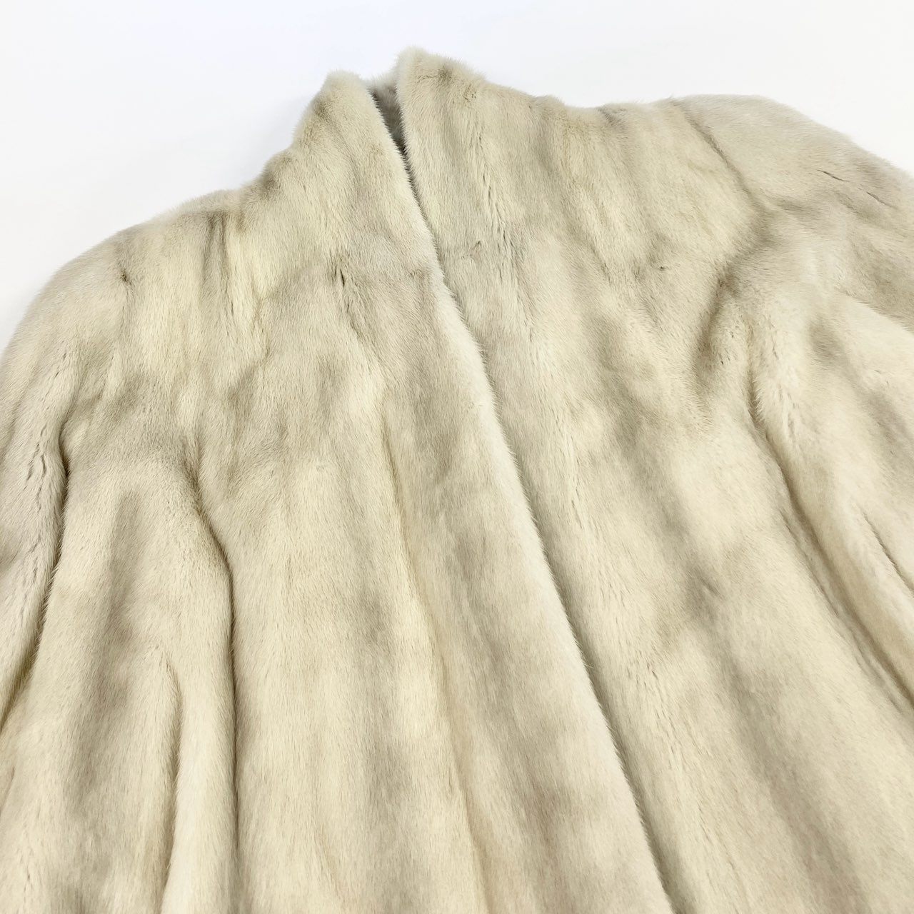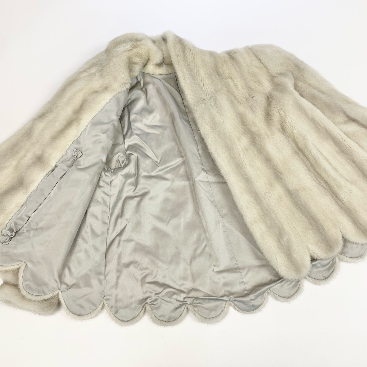柔らかなアイボリーカラーが上品なパールミンクの毛皮コートで、自然な光沢としっとりとした毛足が高級感を演出します。裾にはスカラップ状のカッティングが施され、エレガントさを引き立てるディテールが魅力です。ふんわりとしたボリューム感がありながら軽く羽織れ、フォーマルシーンやパーティー、冬のお出かけコーデの格上げにも最適です。内側は滑らかなサテン調の裏地で、ドレスや繊細な素材のインナーとも相性良く着用できます。上質な毛並みのミンクを探している方におすすめの一着です。