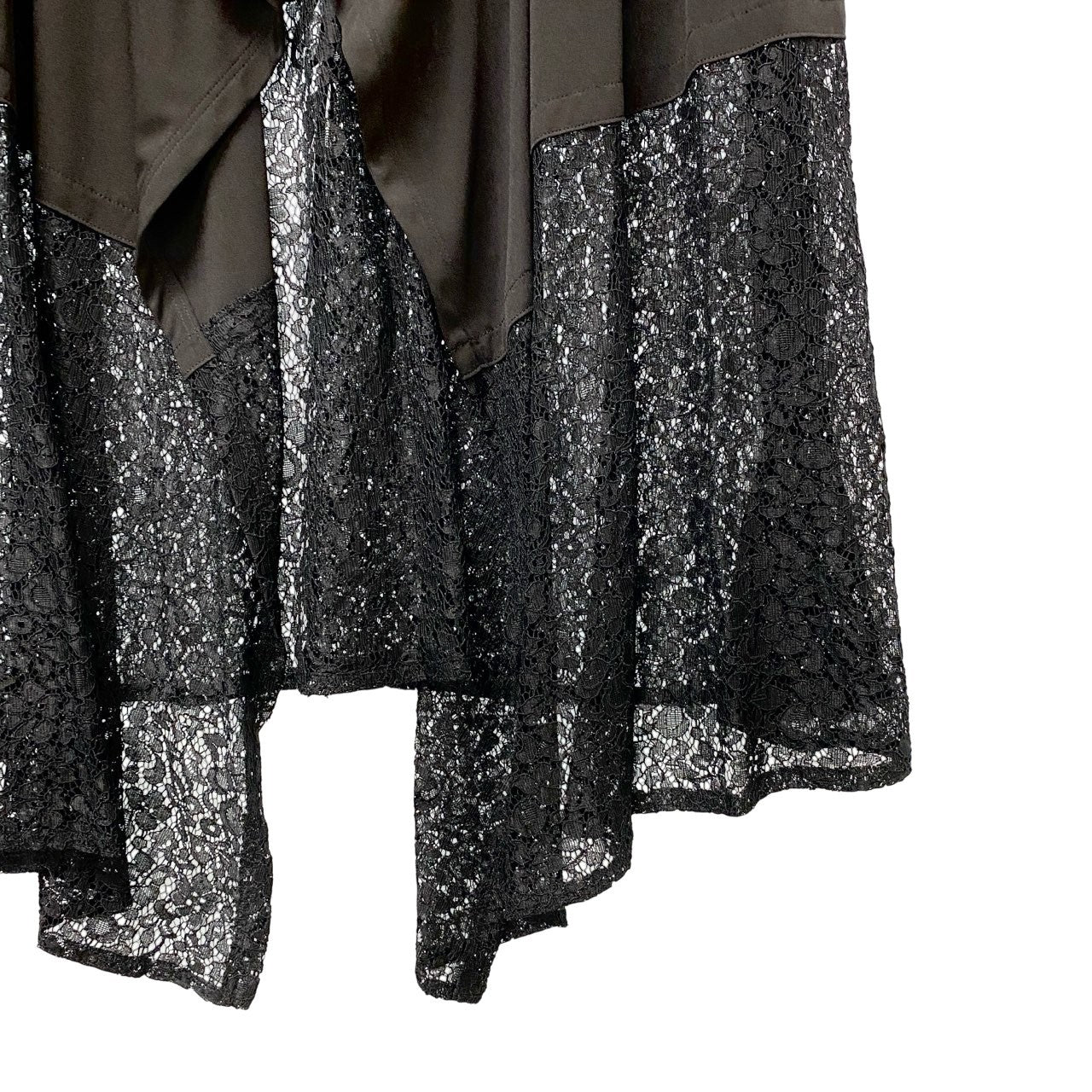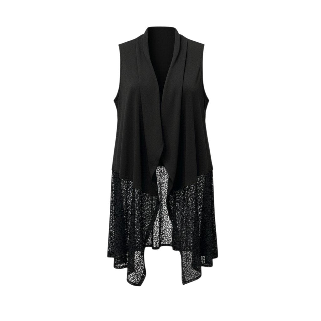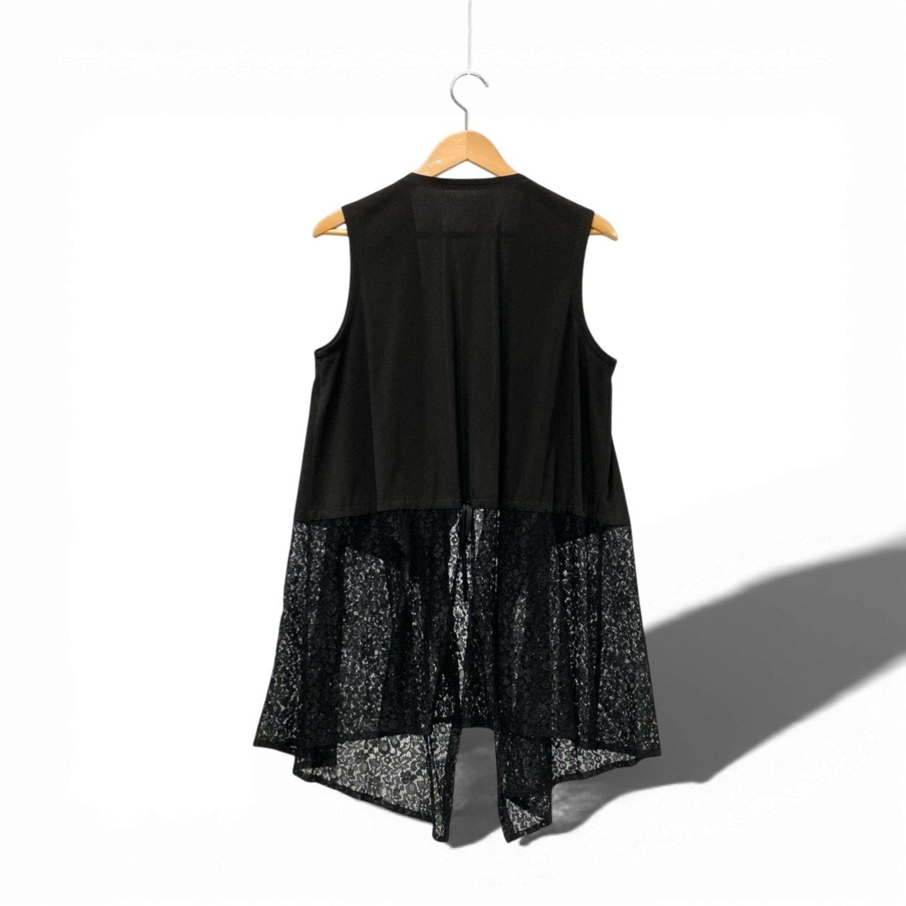 TOKUKO 1er VOL のノースリーブロングジレベストです。カラーはシックで合わせやすいブラックで、裾部分には繊細なレース切替デザインが施され、軽やかでエレガントな印象を演出します。素材はマットなポリエステル系生地とレース素材の組み合わせで、動きのあるドレープシルエットが特徴です。ワンピースやカットソーに重ねるだけでコーディネートのアクセントになる、デザイン性の高い一着です。