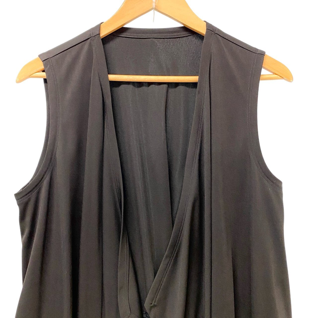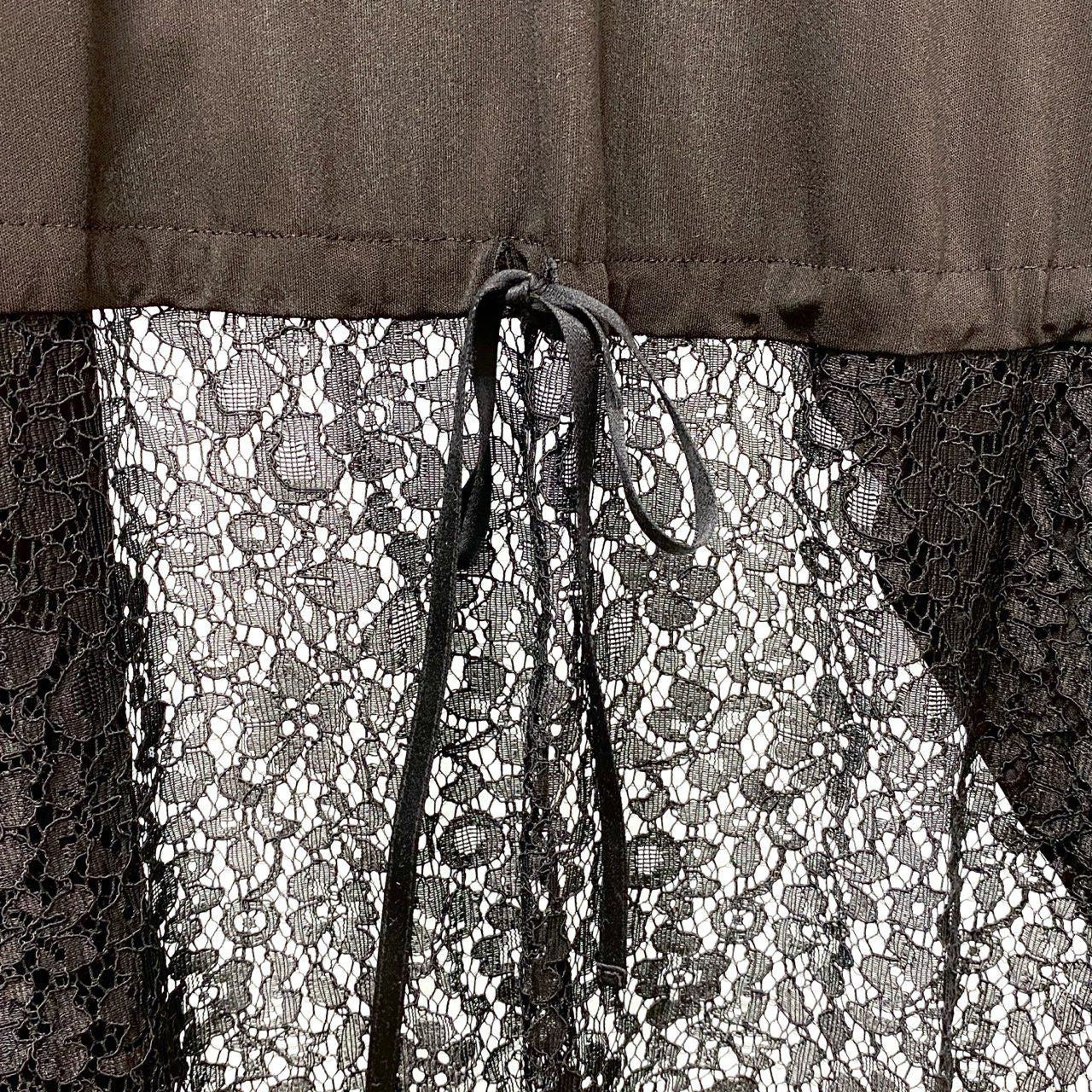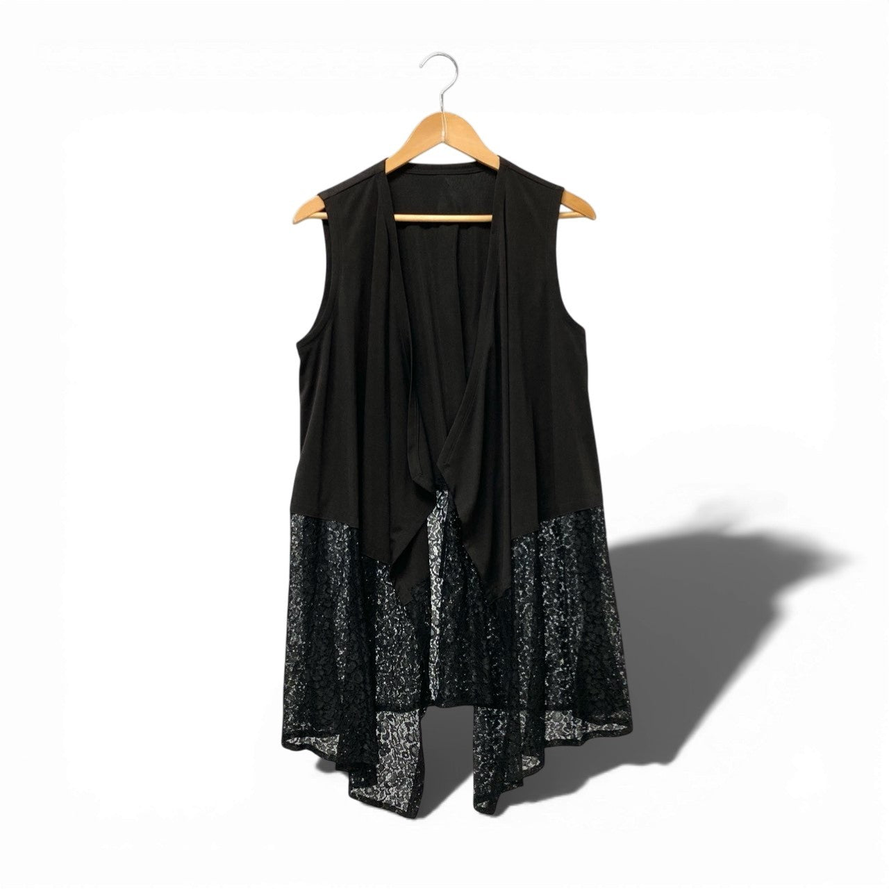 TOKUKO 1er VOL のノースリーブロングジレベストです。カラーはシックで合わせやすいブラックで、裾部分には繊細なレース切替デザインが施され、軽やかでエレガントな印象を演出します。素材はマットなポリエステル系生地とレース素材の組み合わせで、動きのあるドレープシルエットが特徴です。ワンピースやカットソーに重ねるだけでコーディネートのアクセントになる、デザイン性の高い一着です。