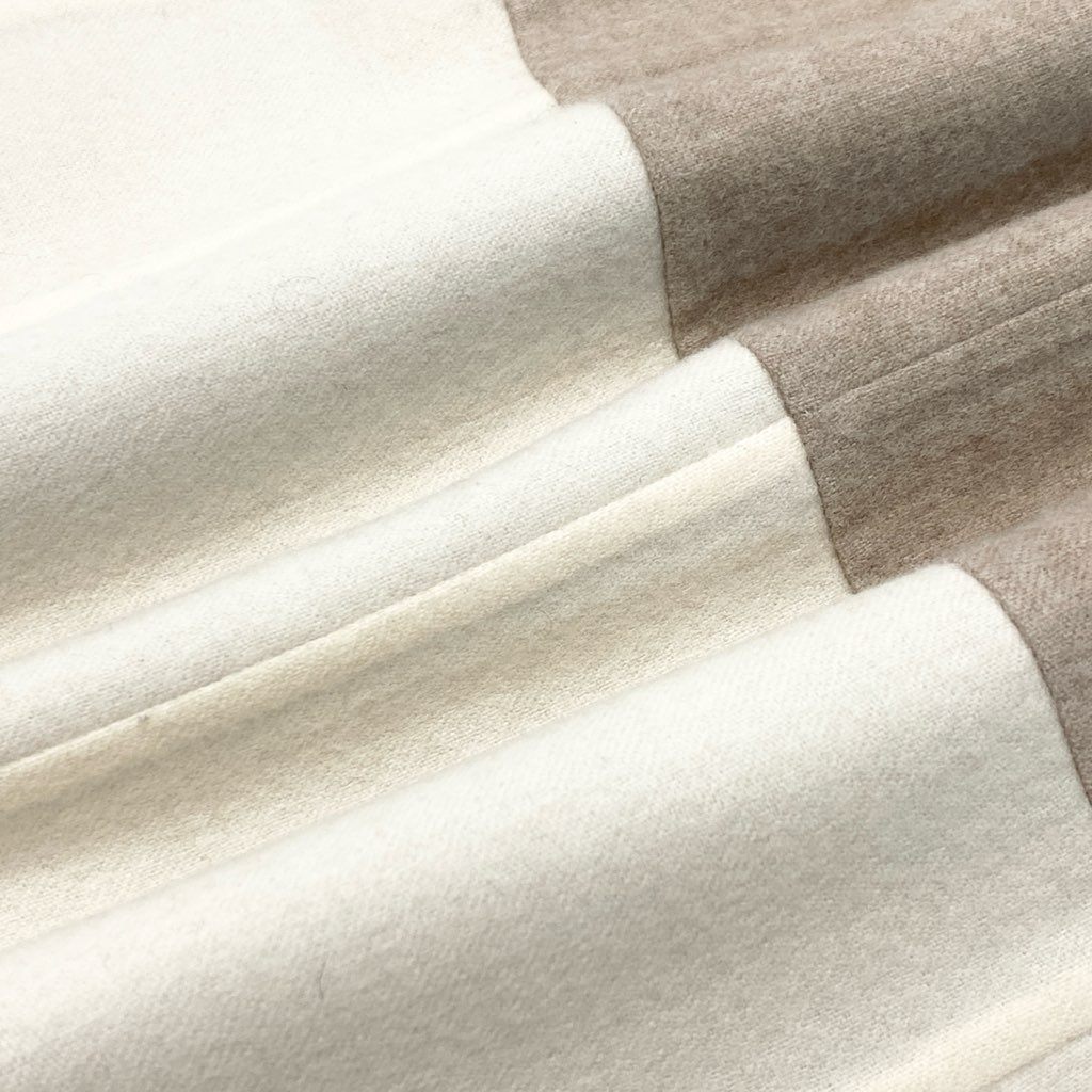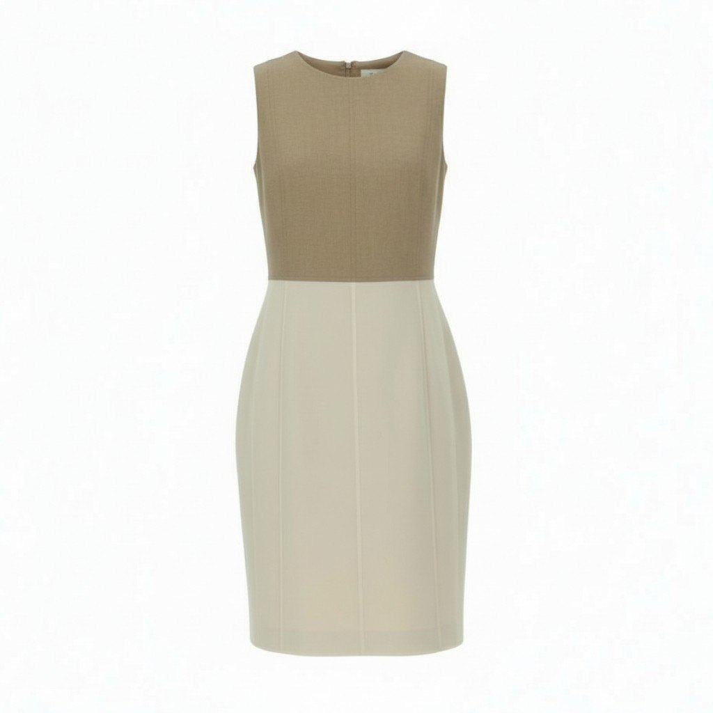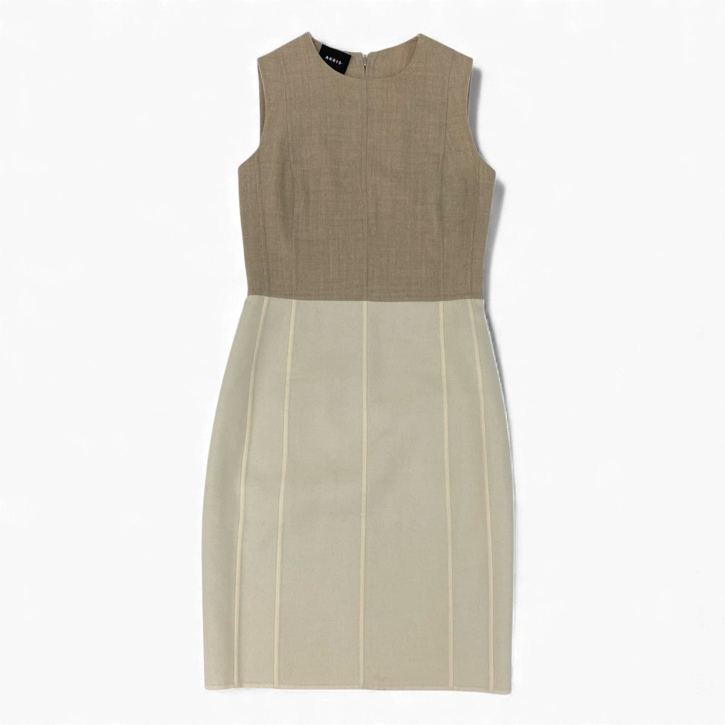 AKRISらしい端正で上品な佇まいの、バイカラーデザイン・ノースリーブワンピースです。上身頃はグレージュ系、スカート部分はアイボリー系の無地切替で、落ち着きのある洗練された配色が魅力です。素材はマットで上質感のあるウール素材で、ハリと滑らかさを兼ね備えています。縦の切替ラインが美しいIラインを演出し、通勤やフォーマル寄りのお出かけ、セミオケージョンまで幅広く活躍する一着です。