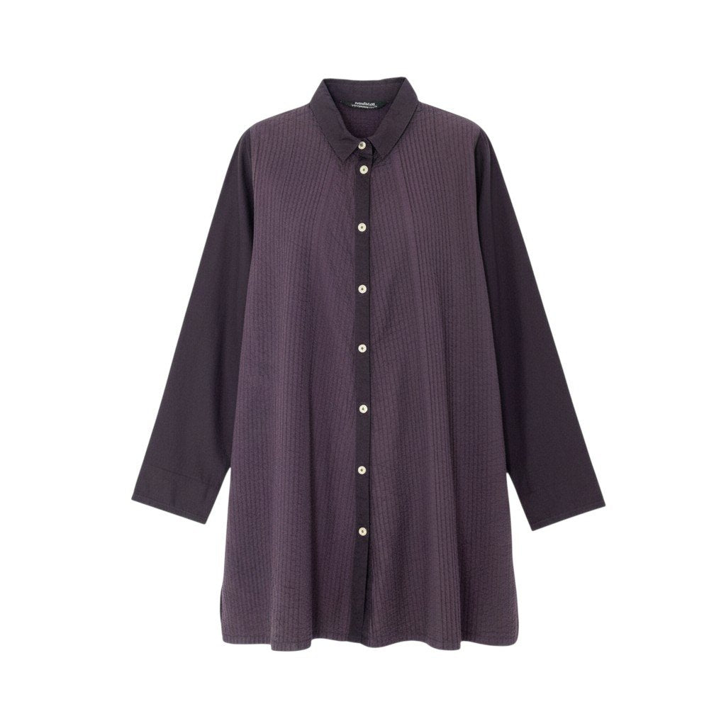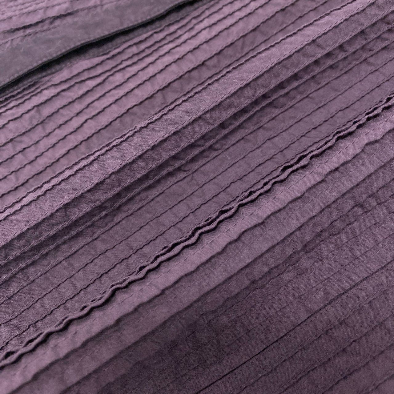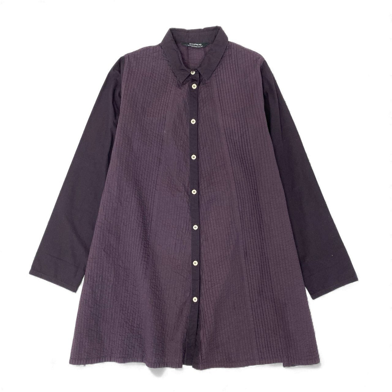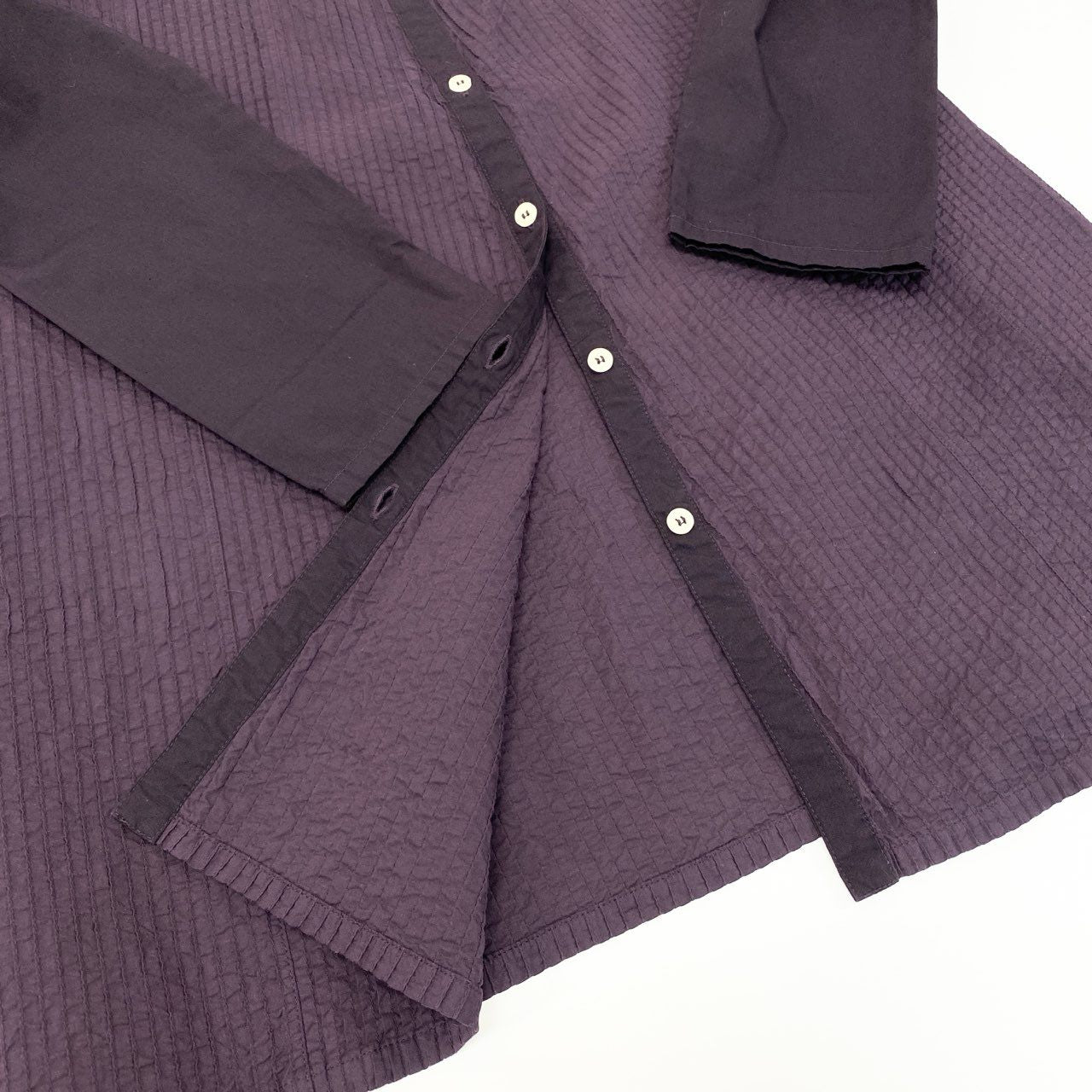 深みのある ダークパープル を基調とした、YACCO MARICARD(ヤッコマリカルド)のコットンチュニックです。前身頃には細かな ピンタック(細プリーツ) が施され、ブランドらしい立体的で上品な表情が魅力。背面と袖は無地のマットコットンで切り替えられており、軽やかな薄手素材でロングシーズン活躍します。ゆったり広がるAラインが体型をふんわりカバーし、日常使いからきれいめカジュアルまで幅広くコーデ可能な一着です。