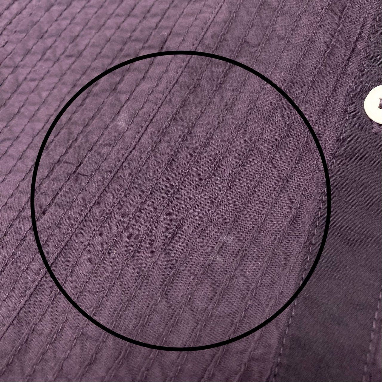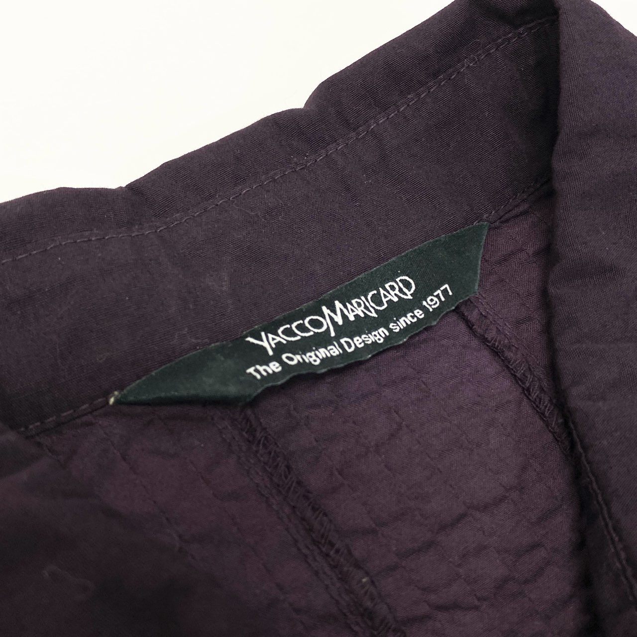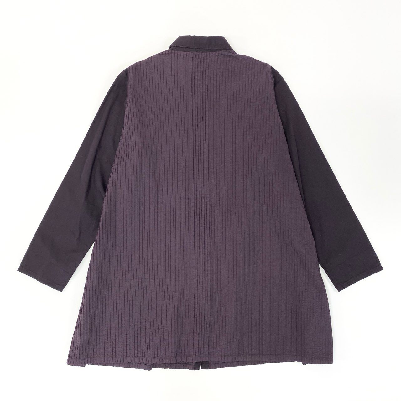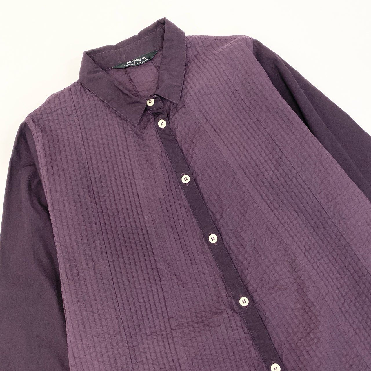 深みのある ダークパープル を基調とした、YACCO MARICARD(ヤッコマリカルド)のコットンチュニックです。前身頃には細かな ピンタック(細プリーツ) が施され、ブランドらしい立体的で上品な表情が魅力。背面と袖は無地のマットコットンで切り替えられており、軽やかな薄手素材でロングシーズン活躍します。ゆったり広がるAラインが体型をふんわりカバーし、日常使いからきれいめカジュアルまで幅広くコーデ可能な一着です。