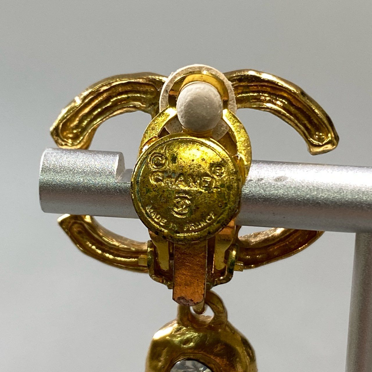 CHANEL(シャネル)のヴィンテージ ココマーク ゴールドイヤリング。艶やかなアンティークゴールドの質感に、ブランドを象徴するダブルCモチーフとコインモチーフが組み合わされたクラシックなデザインです。中央にはクリスタルストーンをあしらい、上品な輝きをプラス。立体的なハンマード仕上げが高級感を際立たせています。ドレススタイルやフォーマルシーンに映える、タイムレスなアイテムです。