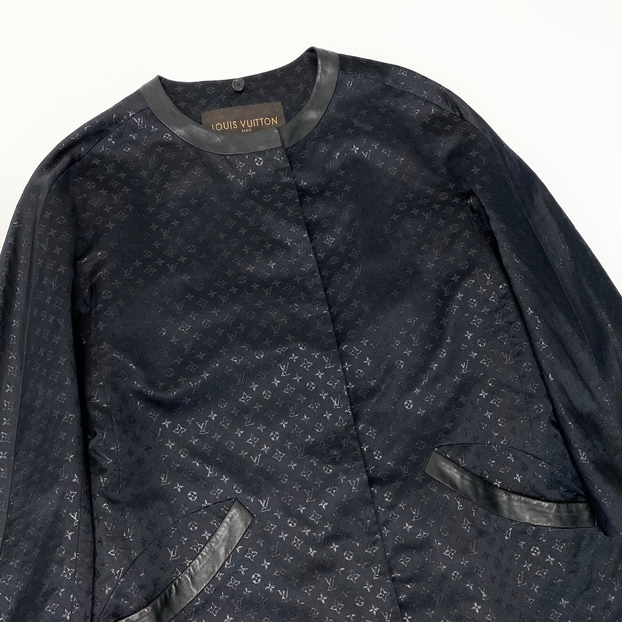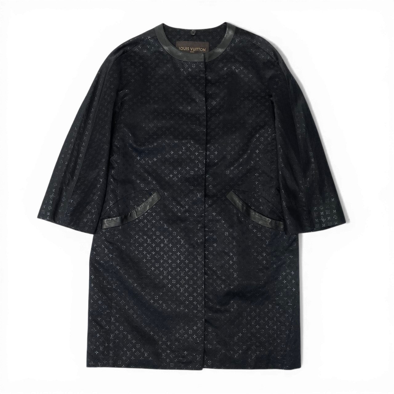 深みのあるブラックにさりげないモノグラム柄が全面に施された、LOUIS VUITTONのロングコートです。しなやかで軽やかな素材感に、襟元やポケット部分のマットなレザーパイピングが高級感を演出。ミニマルなノーカラーデザインで、洗練された大人のスタイルに仕上がります。オンオフ問わず活躍する、上品でラグジュアリーな一着です。