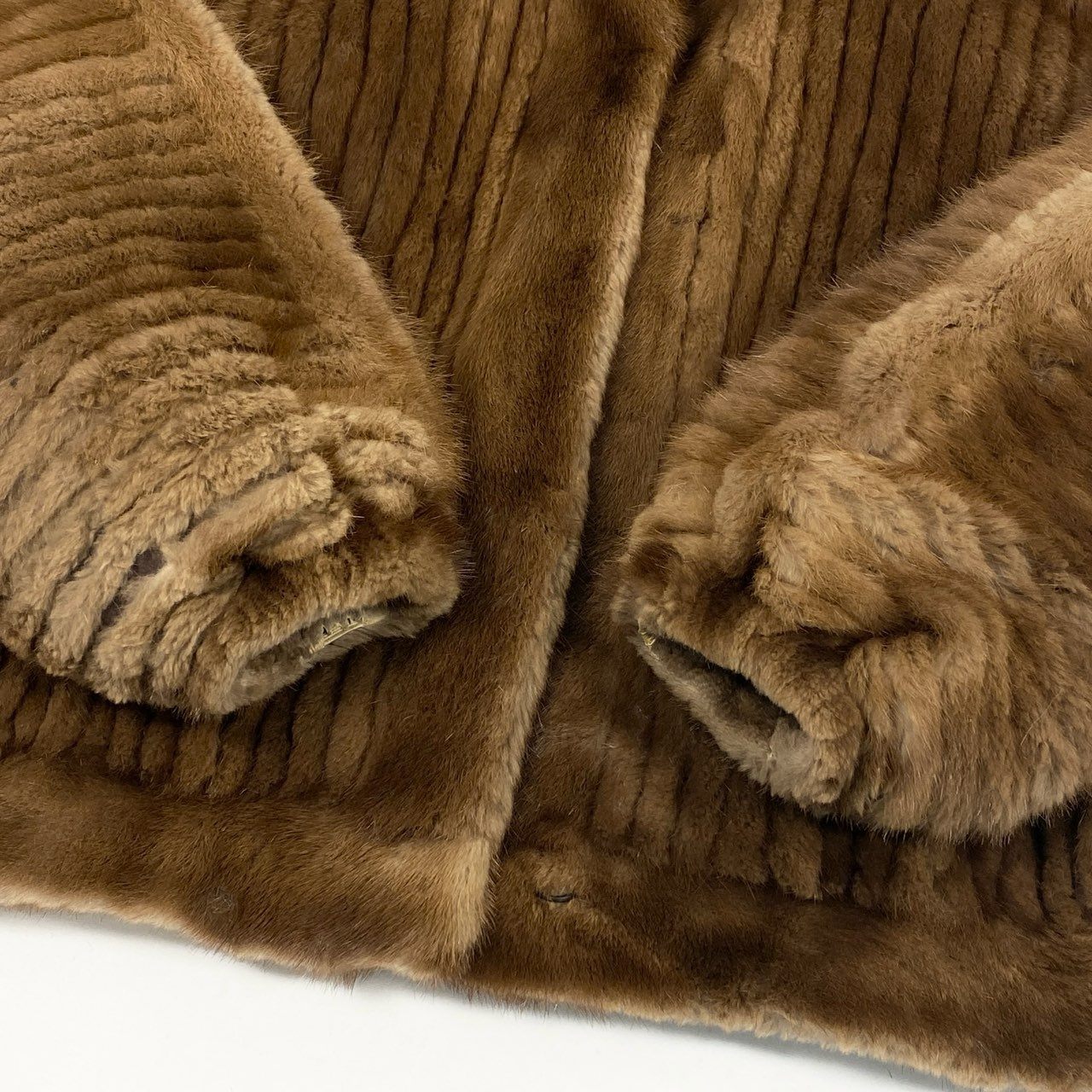 深みのあるブラウン系のパステルミンクを使用した、サガミンク〈銀サガ〉の高級ファーコートです。毛足は短く均一で、シェアードミンク特有のしっとりとした光沢と柔らかい手触りが魅力です。全体には縦に走るパネル状のデザインが施され、立体的な陰影が上品な表情を生み出しています。ショールカラー風の襟元が首元を暖かく包み、冬のスタイリングに品格を添える一着です。ショート丈で軽快に羽織れるため、普段使いから特別なシーンまで幅広く活躍します。