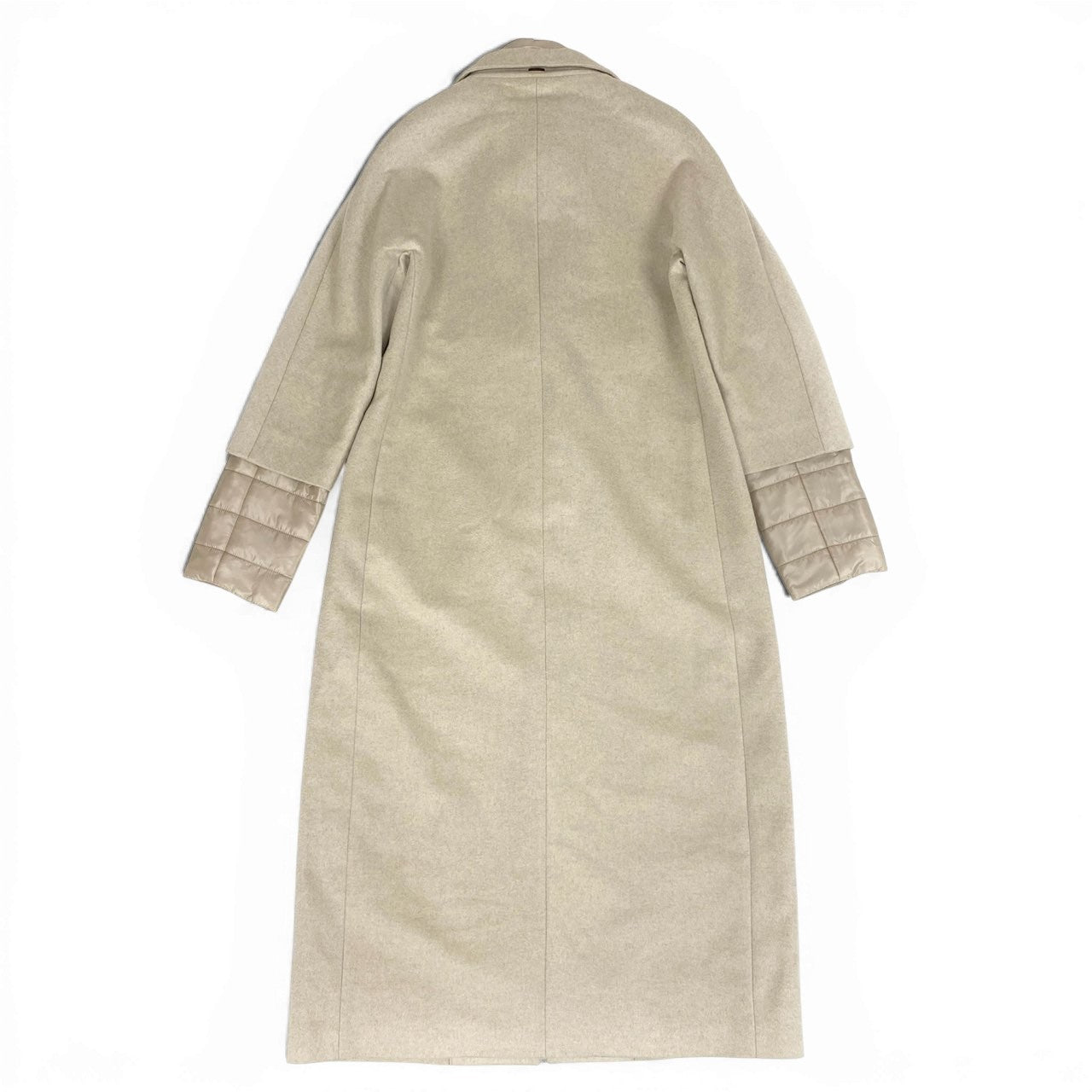 ヘルノの上質さが際立つ、ピュアカシミア×ナイロンウルトラライトの2wayコートです。カラーは上品なライトベージュ系で、マットなカシミア素材と、内側の軽量ナイロンキルティングのコントラストが特徴です。インナーのナイロンライナーは取り外し可能で、秋冬〜端境期まで幅広く対応します。フォーマルな通勤スタイルから、きれいめカジュアルまで汎用性が高く、長く愛用できる一着です。