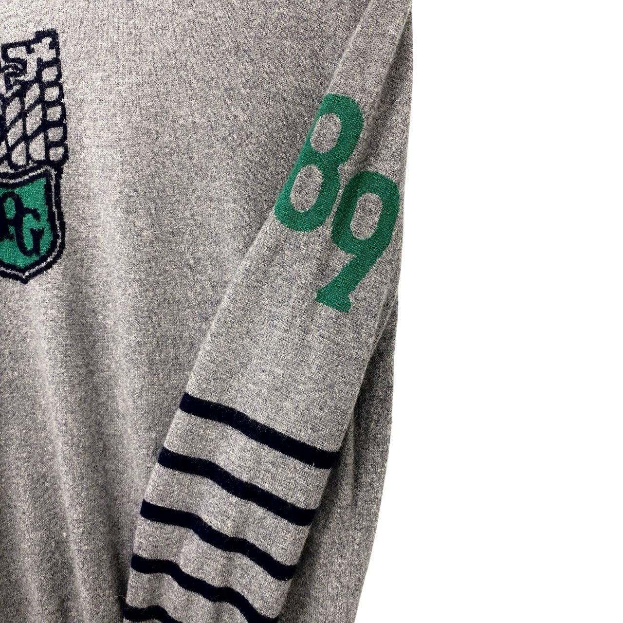 上品なライトグレーのカシミヤ100%ニットセーターです。やわらかく毛足のある上質素材で、軽やかな着心地が魅力です。フロントには立体感のあるワッペンロゴ、袖にはグリーンの「8」パッチとネイビーストライプが施され、スポーティーなアクセントをプラス。ゴルフウェアとしてはもちろん、タウンユースにも映える洗練された一着です。