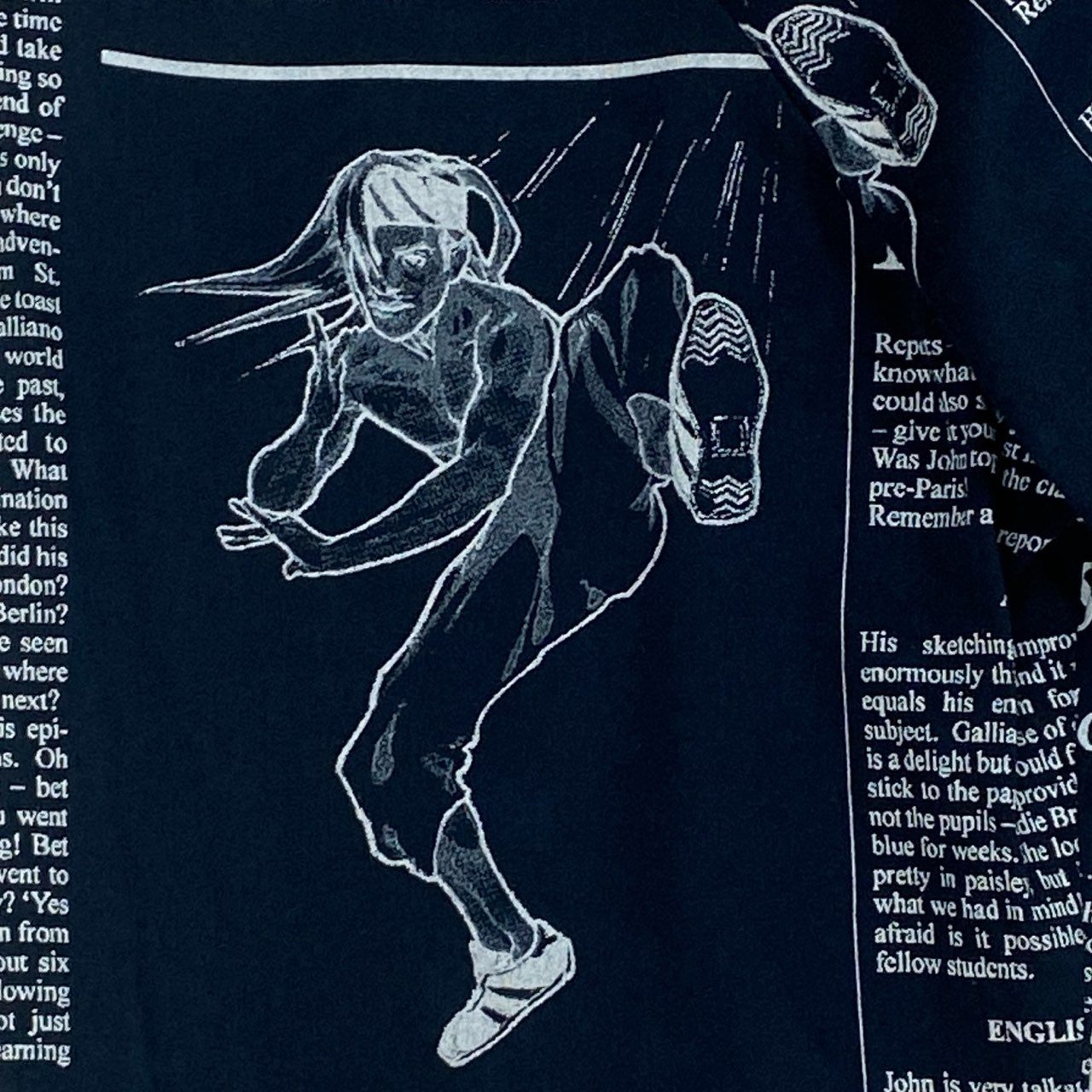 John Gallianoらしい世界観が際立つ、ニュースペーパー柄ロングスリーブシャツです。 ミッドナイトネイビーに近いブラックベースにホワイトプリントを全面配した総柄デザイン。 マットで軽さのあるコットン素材に、ボタンダウン仕様と細身シルエットが特徴です。 1枚で主役としても、ジャケットのインナーとしても映える、モード感の強いアイテムです。