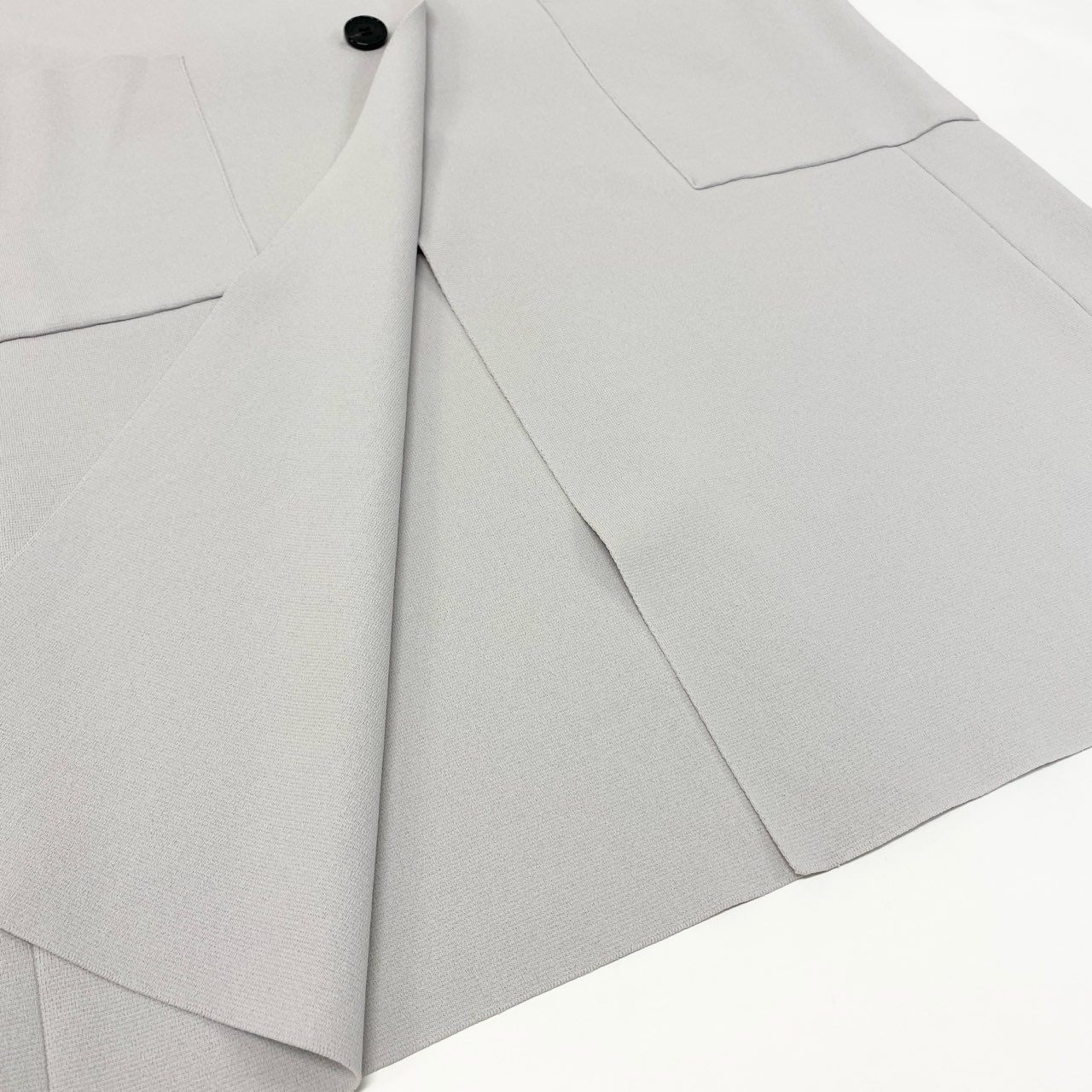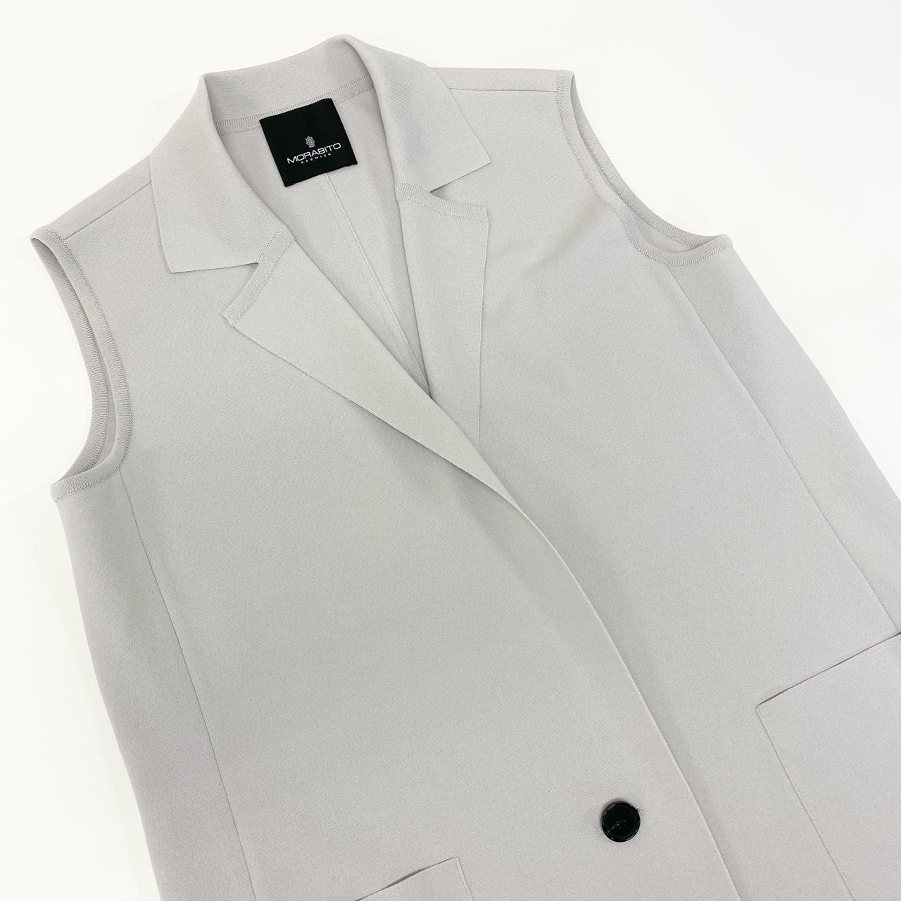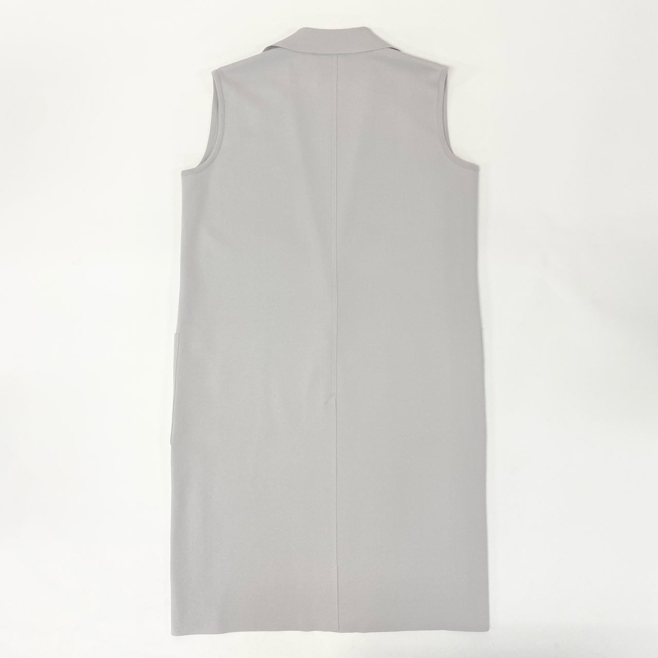 モラビトのスリーブレスロングジレ(品番9049-31203)です。カラーは上品なグレーで、マットな質感が落ち着いた印象を与えます。大きめのパッチポケットとシングルボタンがデザインポイントとなり、シンプルながらモードな雰囲気を演出。ワンピースやパンツスタイルに重ねることで、スタイルアップと洗練された印象を両立できます。ビジネスシーンからお出かけまで幅広く活躍する一着です。