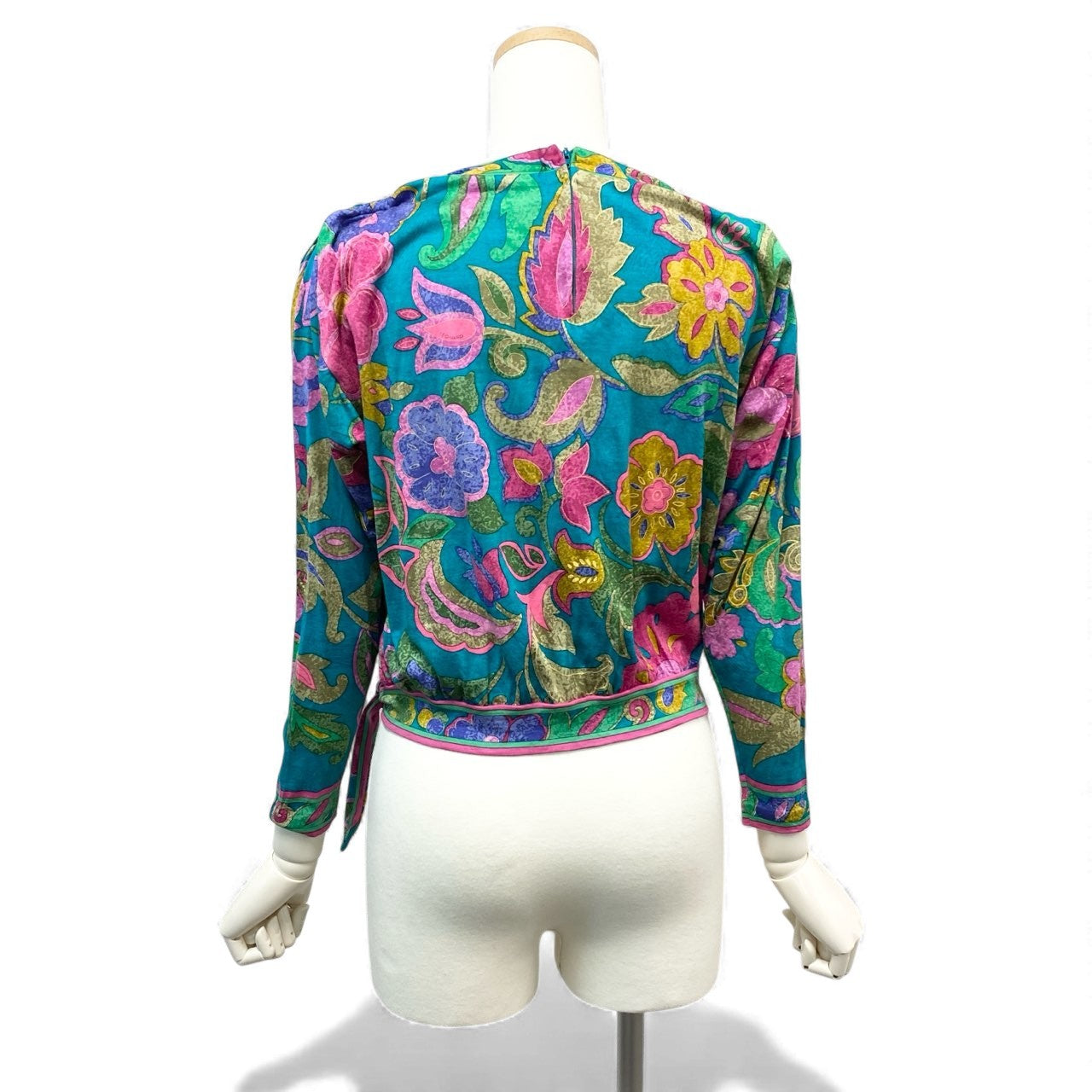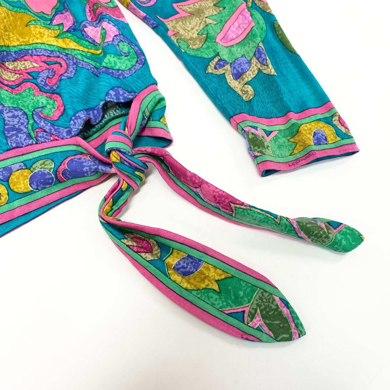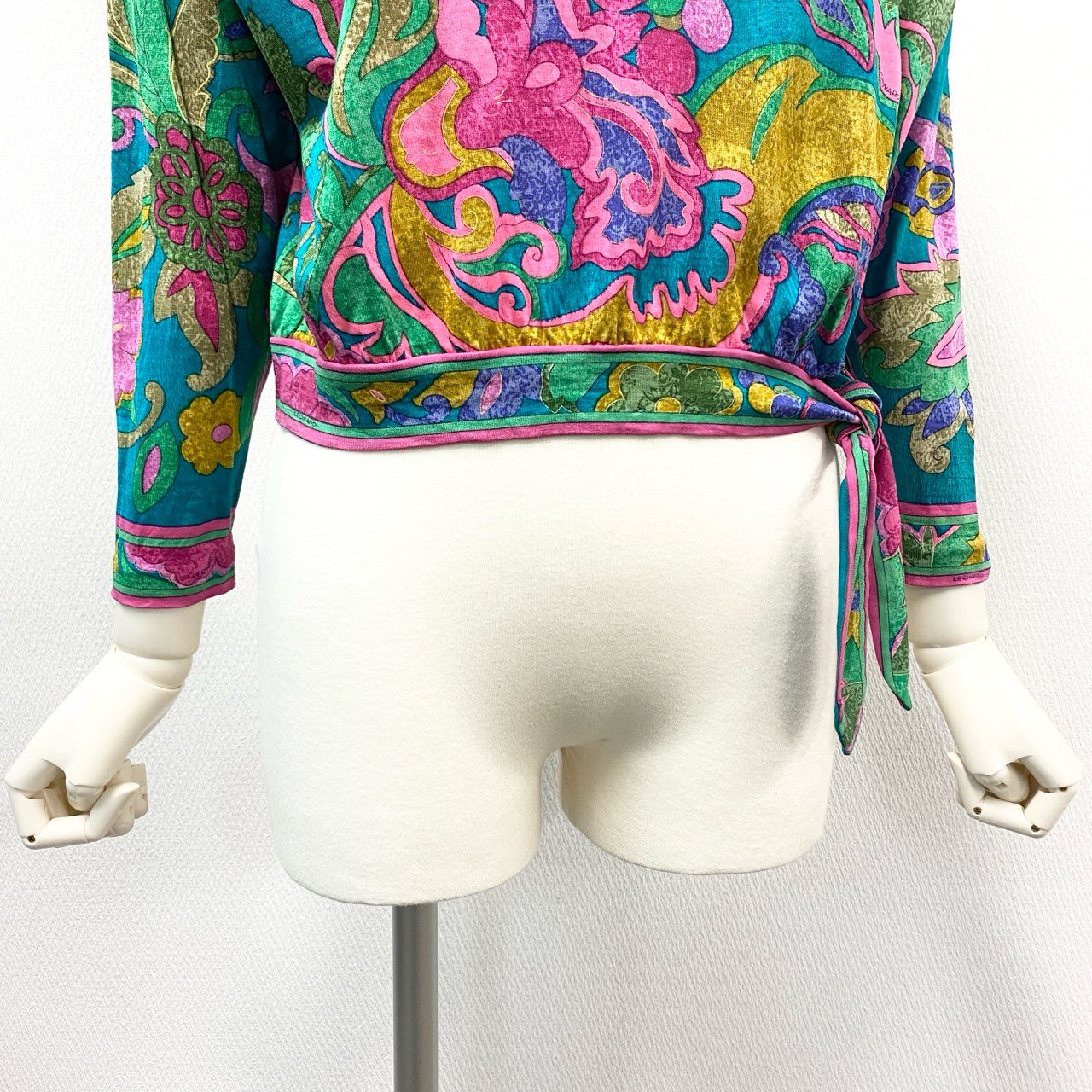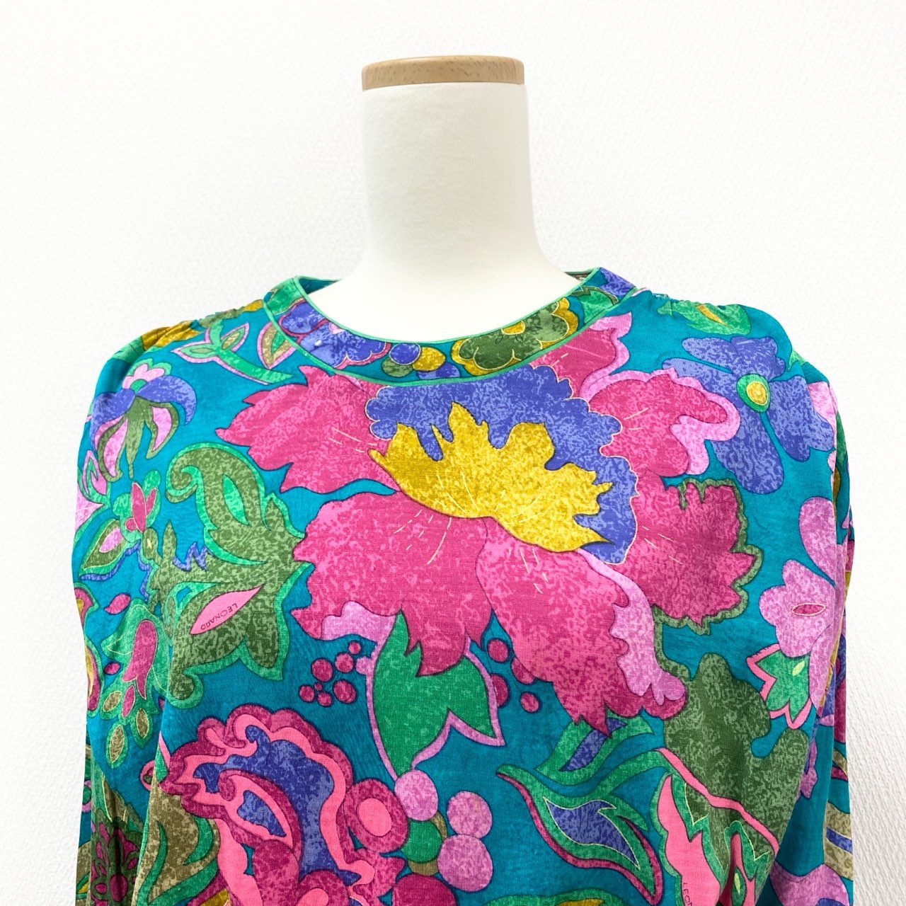 21k11 LEONARD レオナール ロングスリーブ カットソー 美しい花柄プリント ドルマンスリーブ 裾リボン レディース S グリーン系 ウールシルクu02t