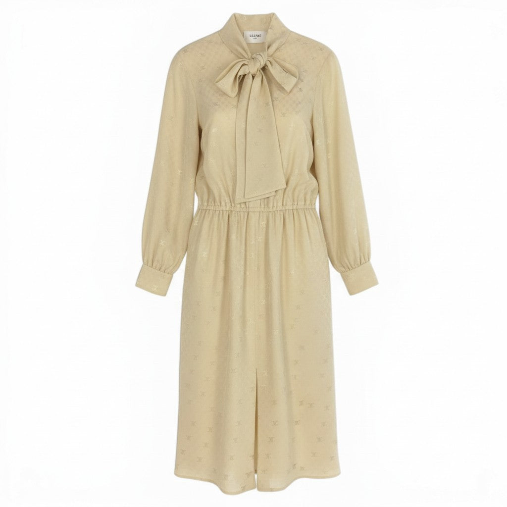 セリーヌのシャンパンベージュが上品なシルクワンピースです。無地に見えながら、さりげない総柄のロゴジャカードが施された光沢感のある素材が高級感を演出。大きなボウタイリボンとウエストギャザーが女性らしいシルエットを際立たせます。フォーマルシーンやお食事会、ジャケット合わせのきれいめスタイルにも最適なエレガントな一着です。