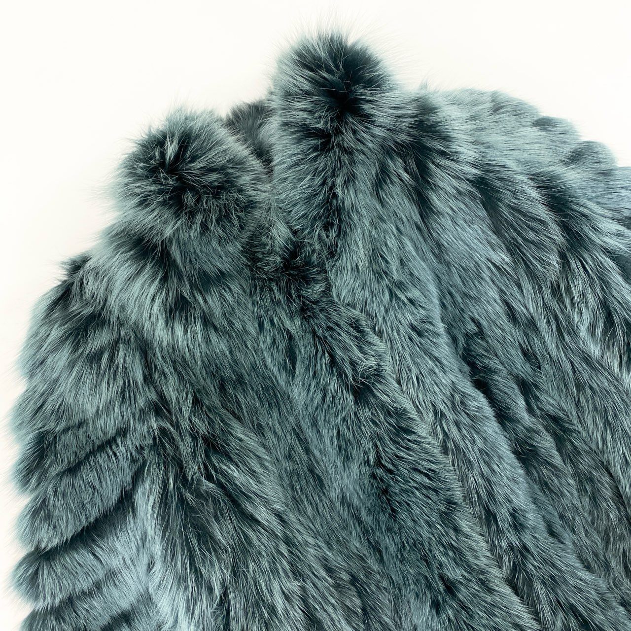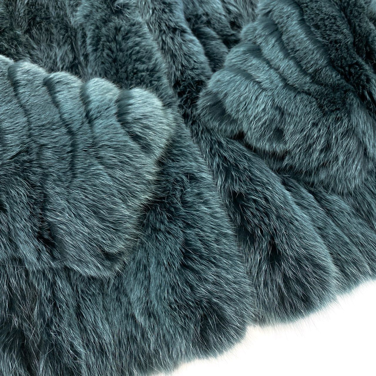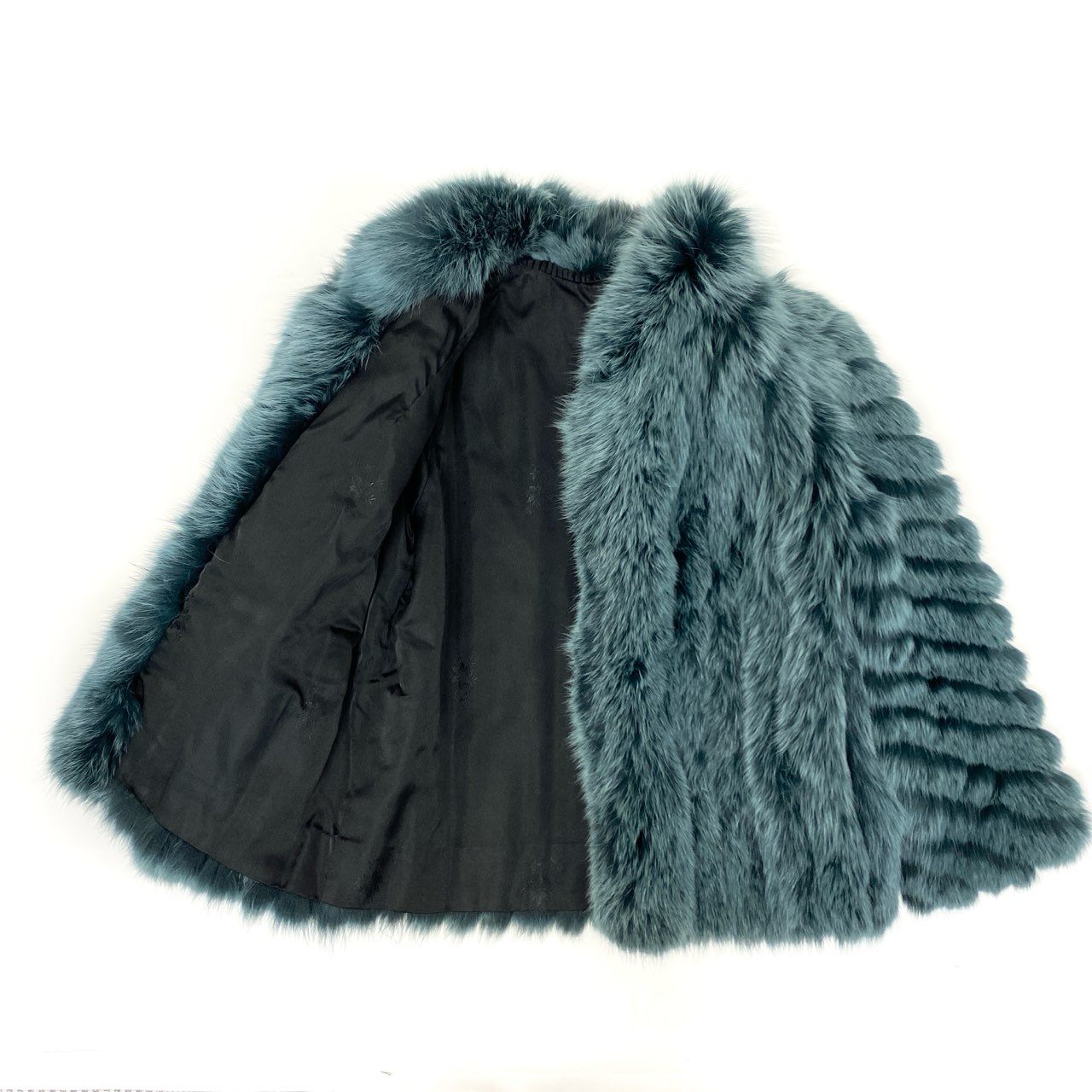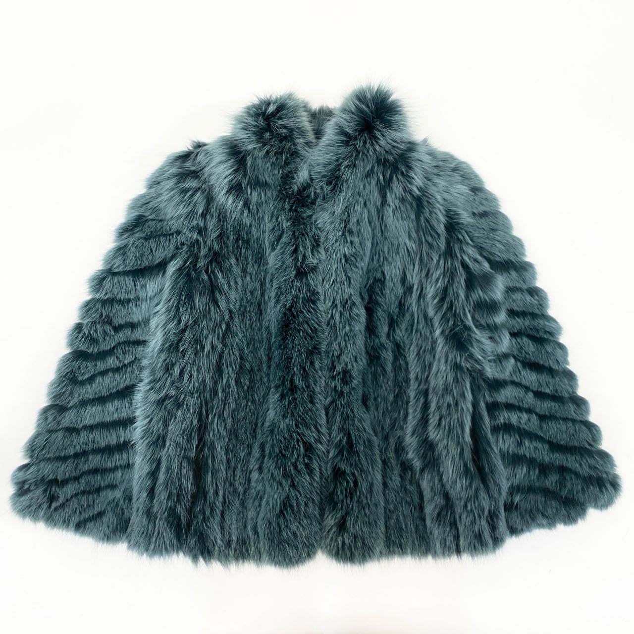深みのある**ブルーグリーン(フォレストティール)**カラーが印象的な、最高級フォックスファーのショートコート。毛足の長いフォックス特有のふんわりとしたボリューム感に、染め加工による艶やかな光沢が高級感を際立たせます。立体的なパネル仕立てでシルエットも美しく、軽やかな羽織り心地。パーティーやディナー、特別な外出シーンにぴったりの一着です。
