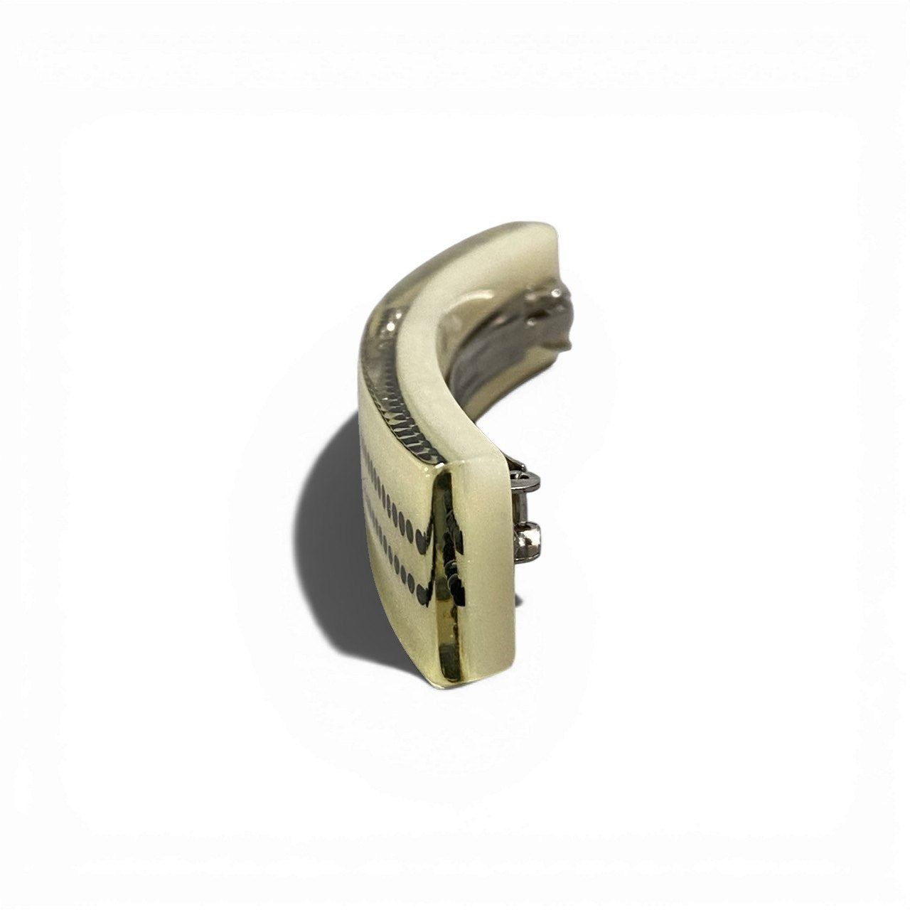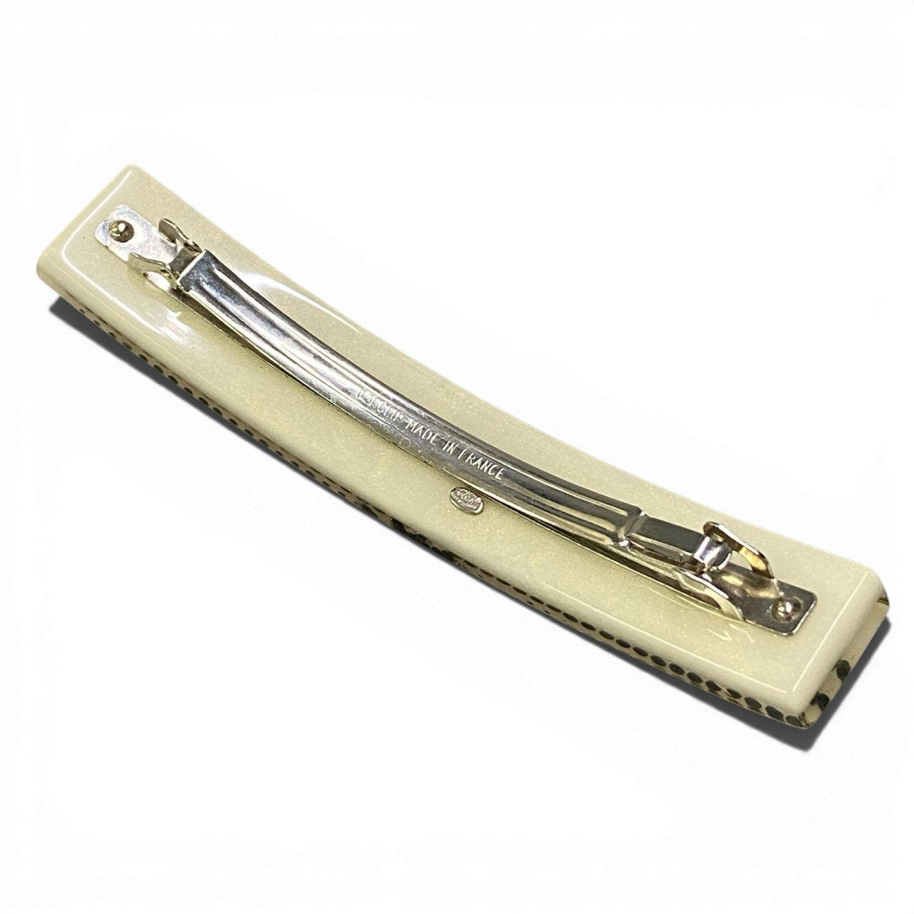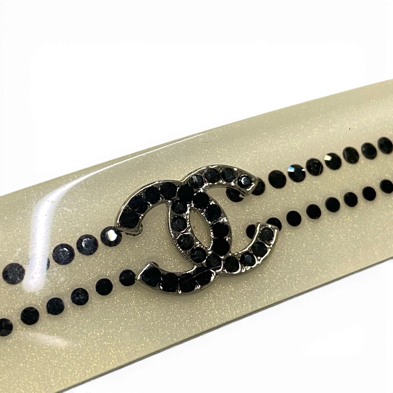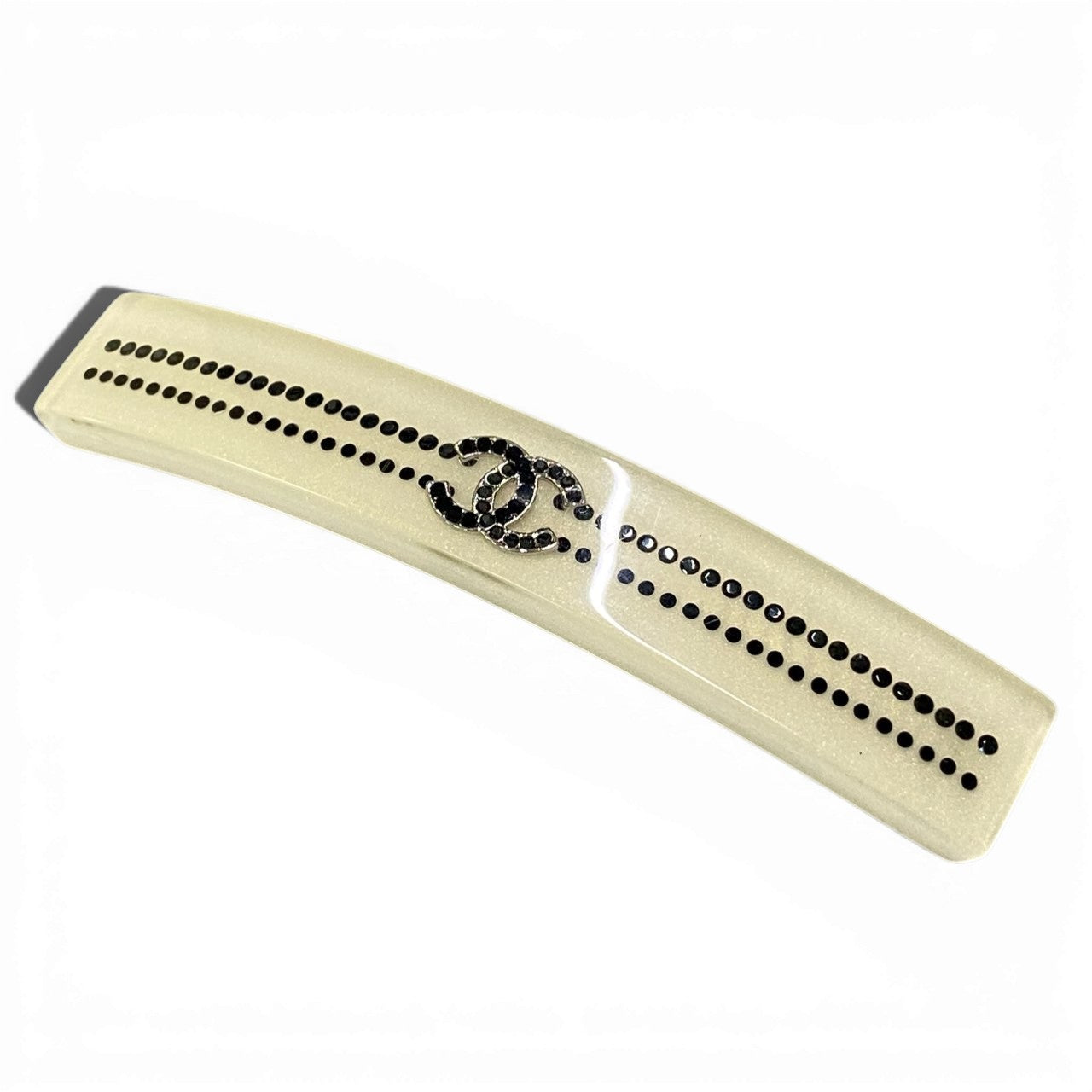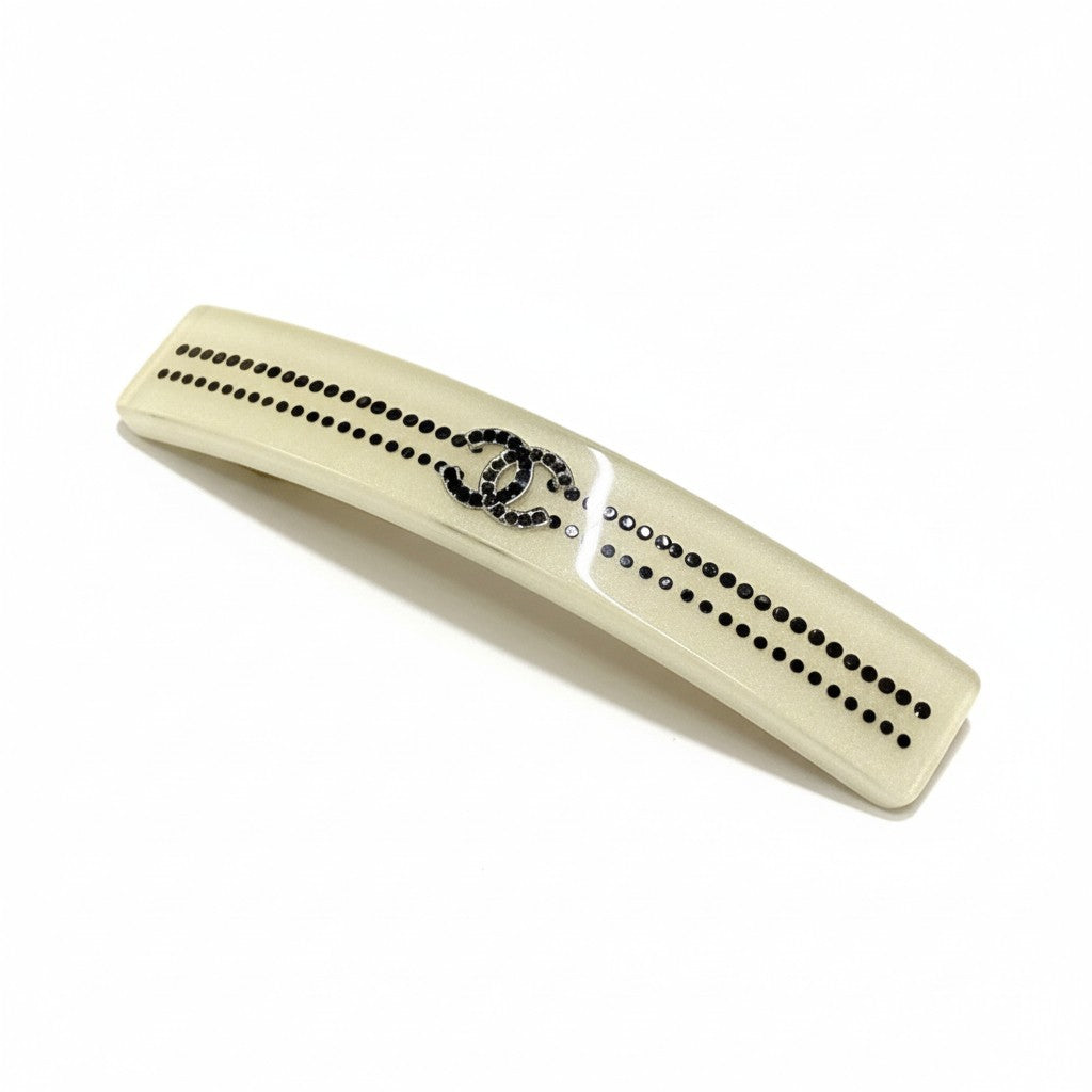 パールアイボリー(シャンパンベージュ系)の上品なベースに、ブラックラインストーンでストライプ状のドット装飾をあしらった華やかなデザイン。中央にはブラックストーンで彩られたココマークが配され、ラグジュアリーな存在感を放ちます。艶感のある樹脂素材が光を柔らかく反射し、洗練された印象に。きれいめスタイルやオケージョンコーデのアクセントとして活躍するシャネルらしいエレガントなバレッタです。