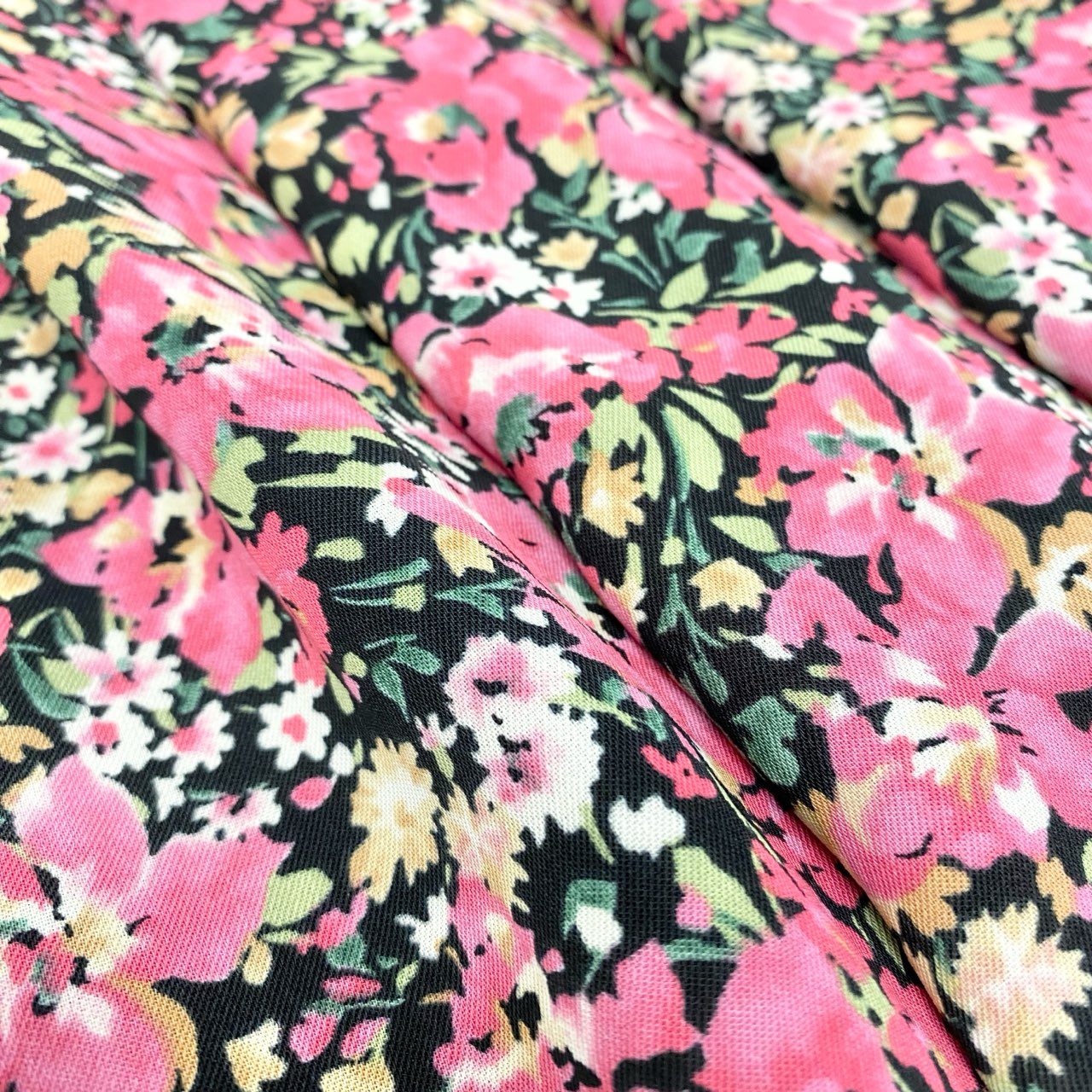 組曲のツイルスカートで、鮮やかなピンクを基調としたフラワープリントが華やかさを演出します。ブラックやベージュを差し色にした小花柄が全体に広がり、フェミニンで存在感のあるデザインです。タック入りのフレアシルエットで、動くたびに軽やかに揺れる表情が魅力です。春夏のお出かけやデイリーコーデはもちろん、シンプルなトップスと合わせれば上品なお出かけスタイルにも活躍する一着です。