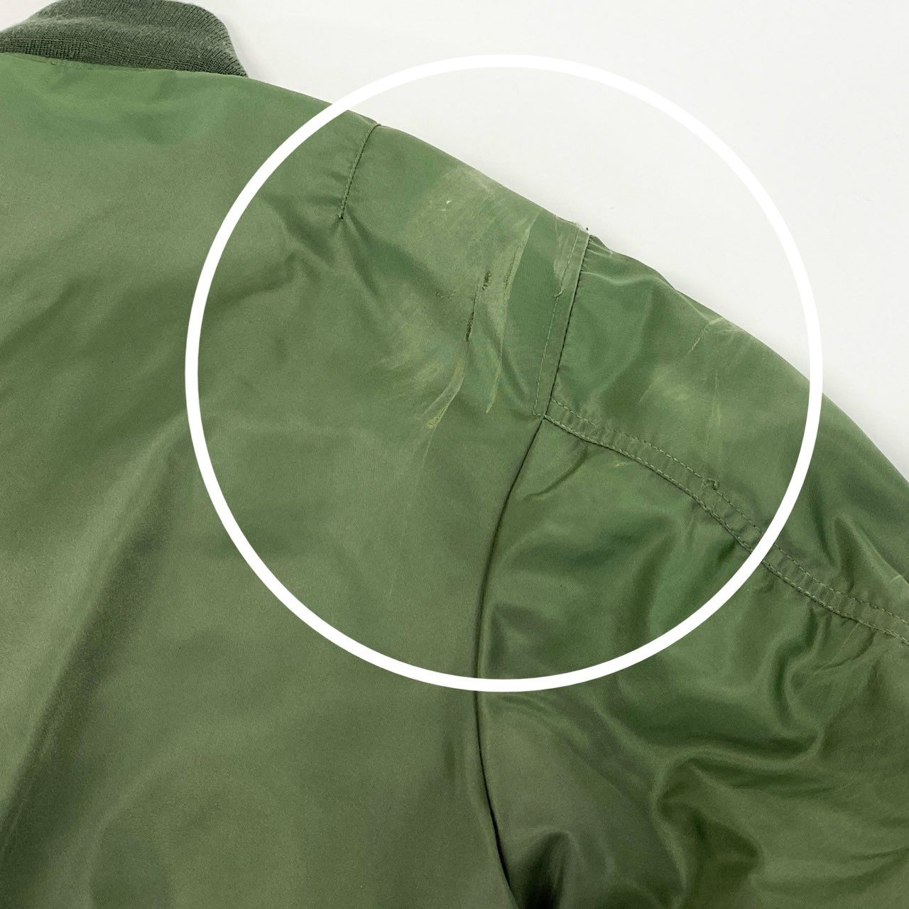 表記サイズL、実寸は着丈63cm・肩幅50cm・身幅63cm・袖丈71cmのため、身長170〜180cm前後の方で腰丈バランスのフライトジャケットです。