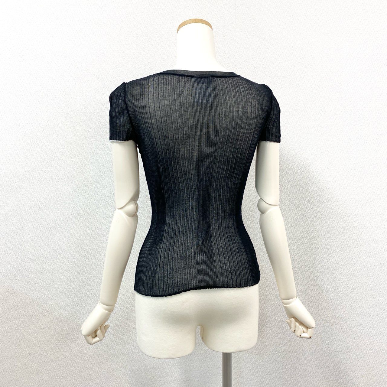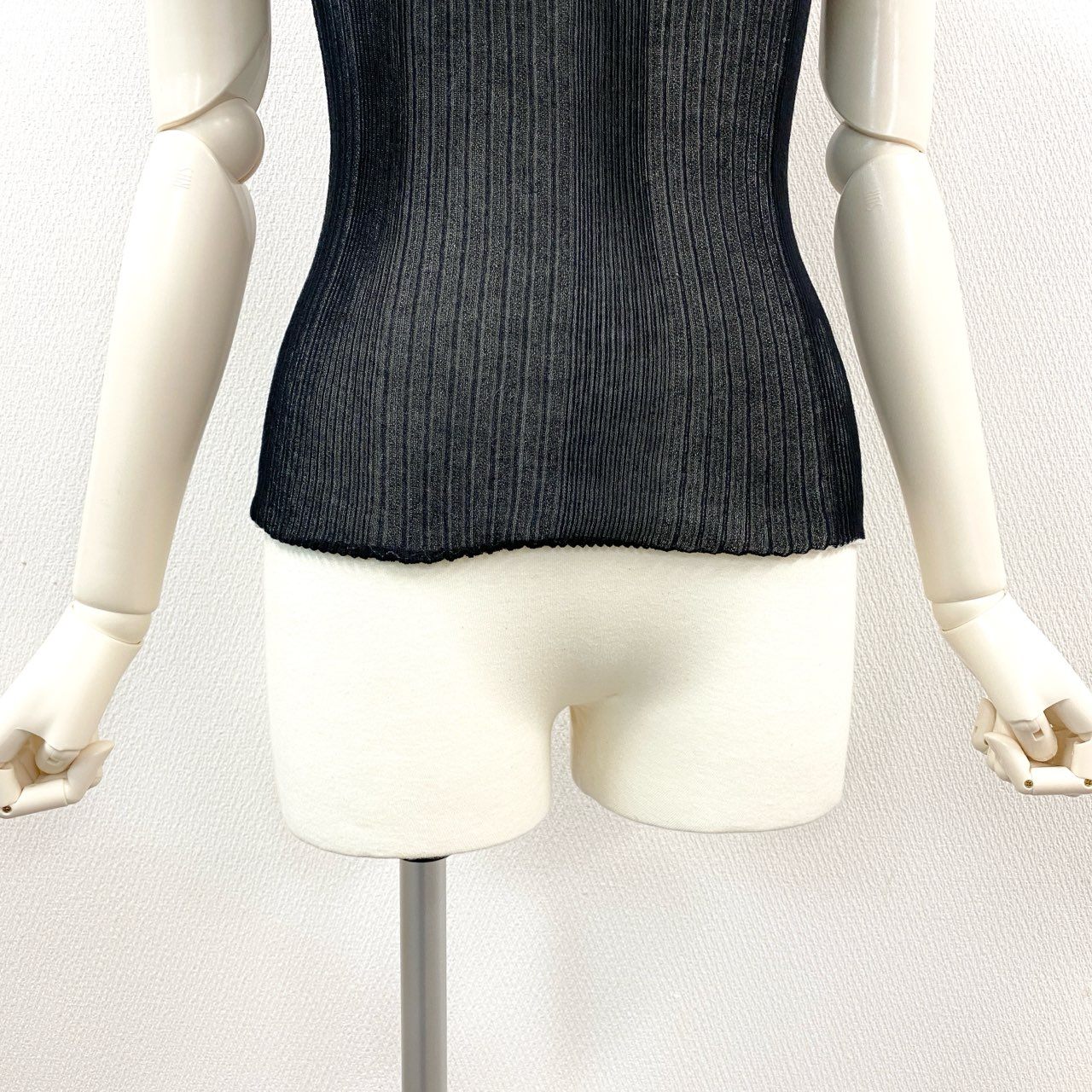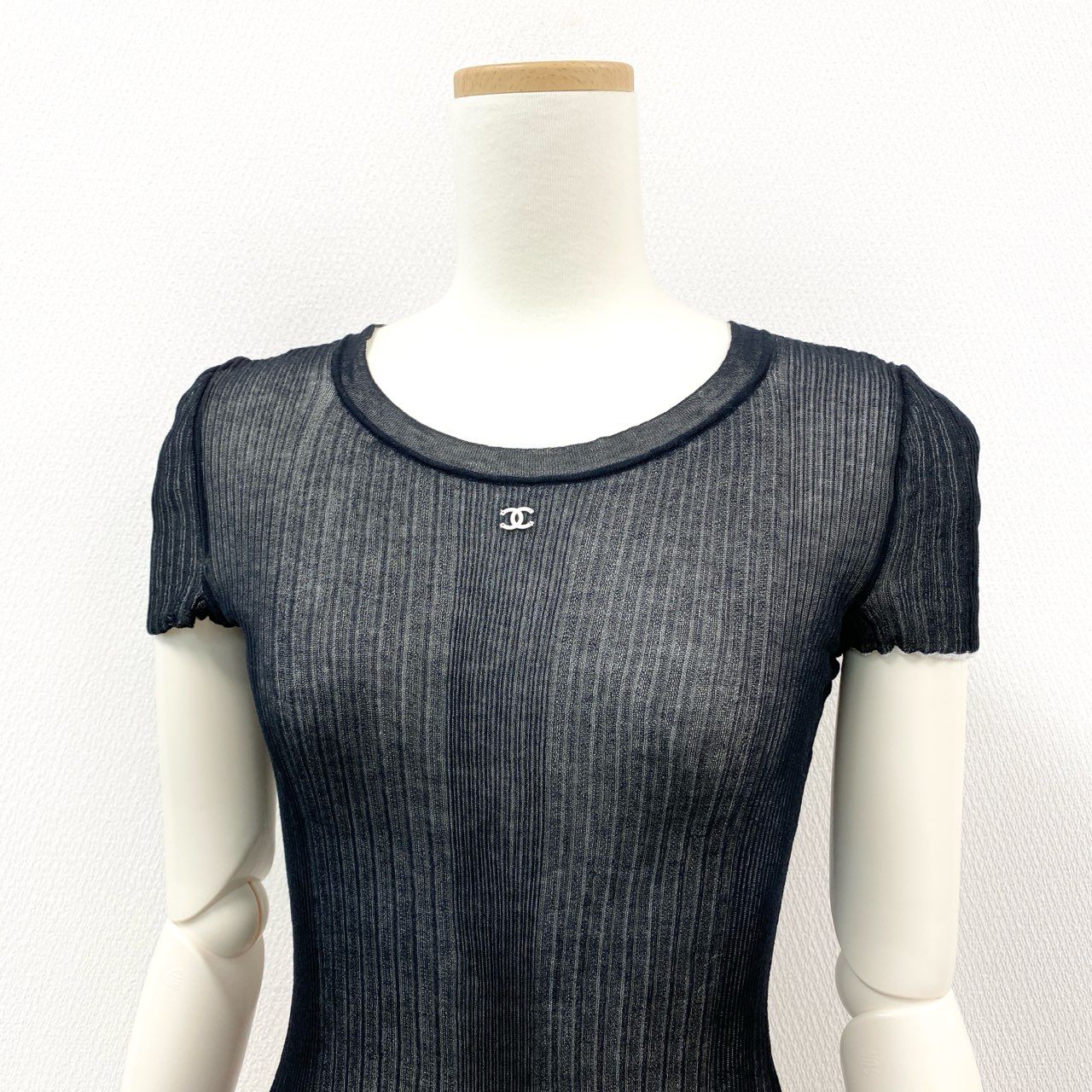 シャネルのリブ編みニットTシャツで、チャコールブラック×細リブのシアーな透け感が上品で大人らしい印象です。フロントのココマークメタル装飾がワンポイントで映え、シンプルながら存在感のあるデザイン。身体の曲線に自然に沿うタイトシルエットで、ジャケットインから単体コーデまで幅広く使えます。リバーシブル仕様のため、スタイリングの幅が広がる実用性の高いアイテムです。
