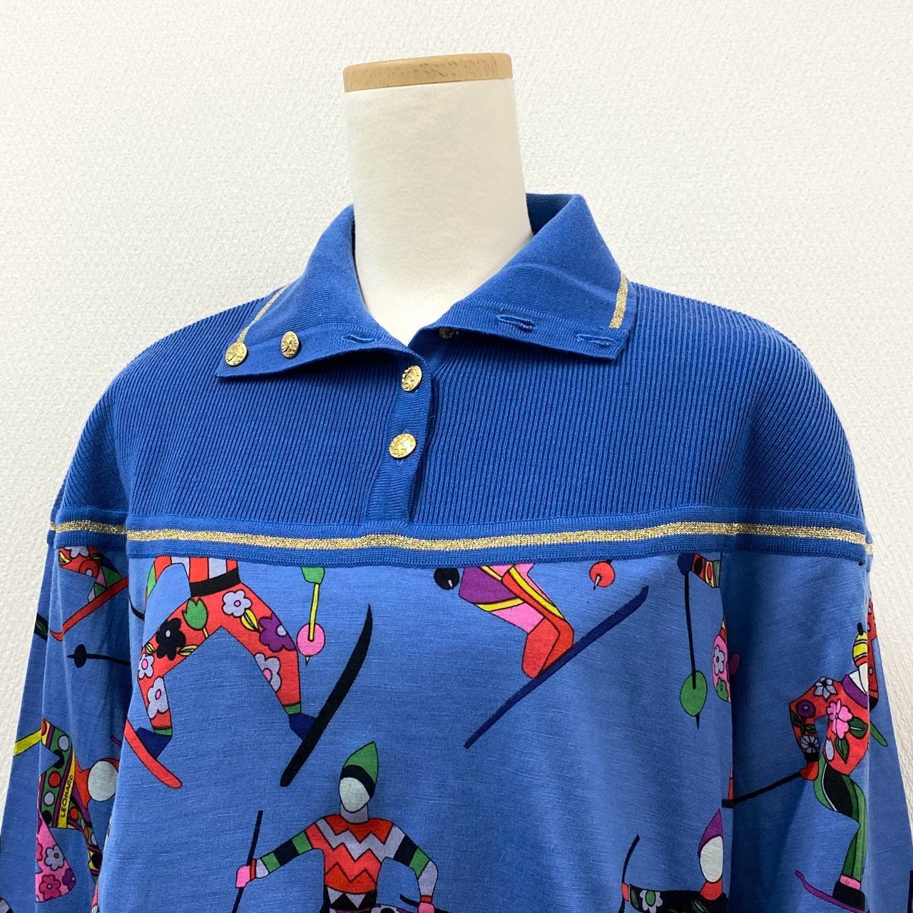 76i12 LEONARD レオナール 襟付きニットポロシャツ セーター トップス ロゴ金ボタン M ブルー ウール レディースu02t