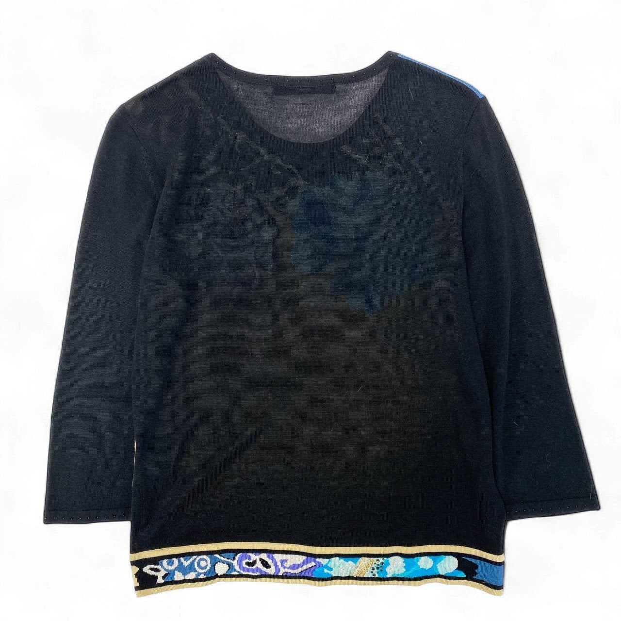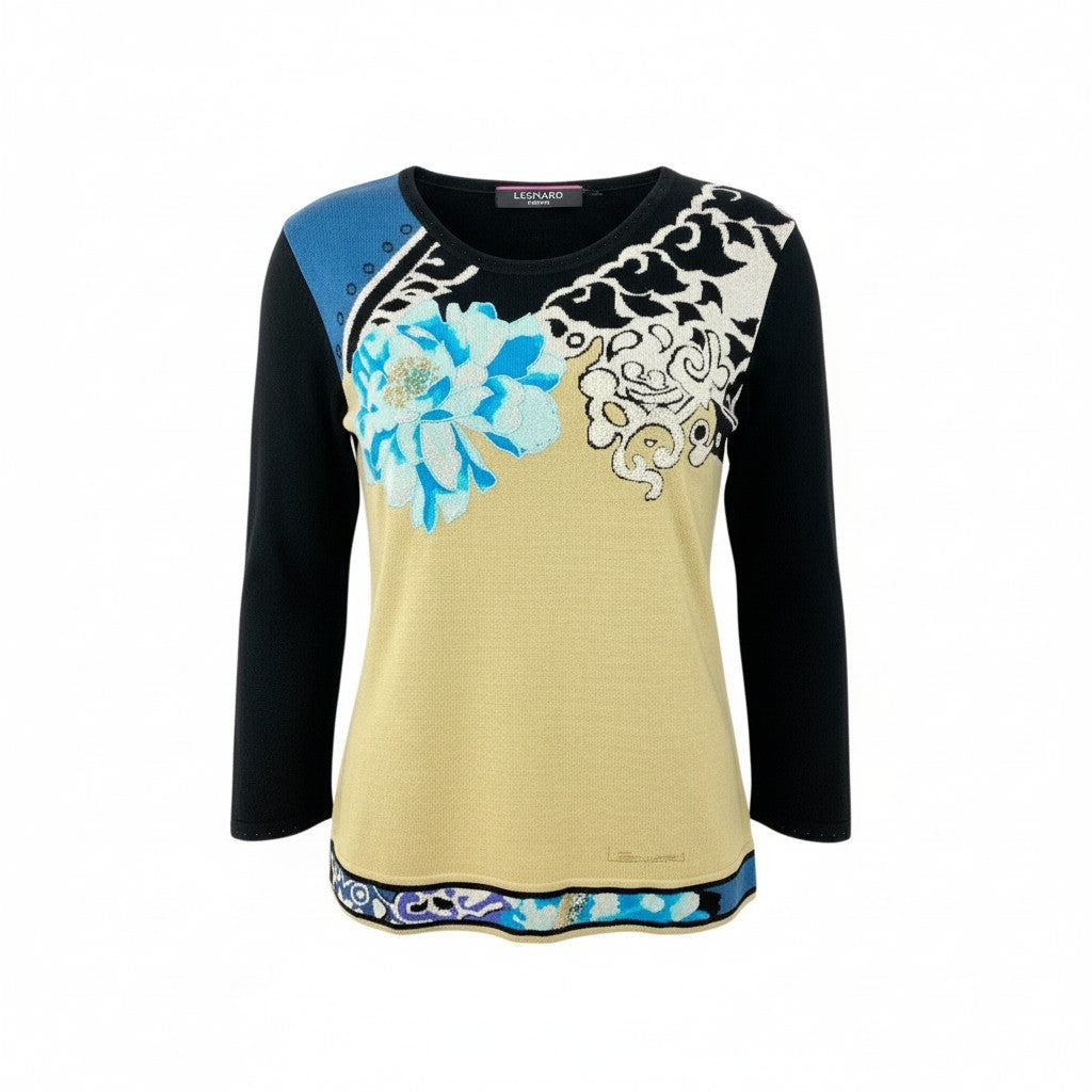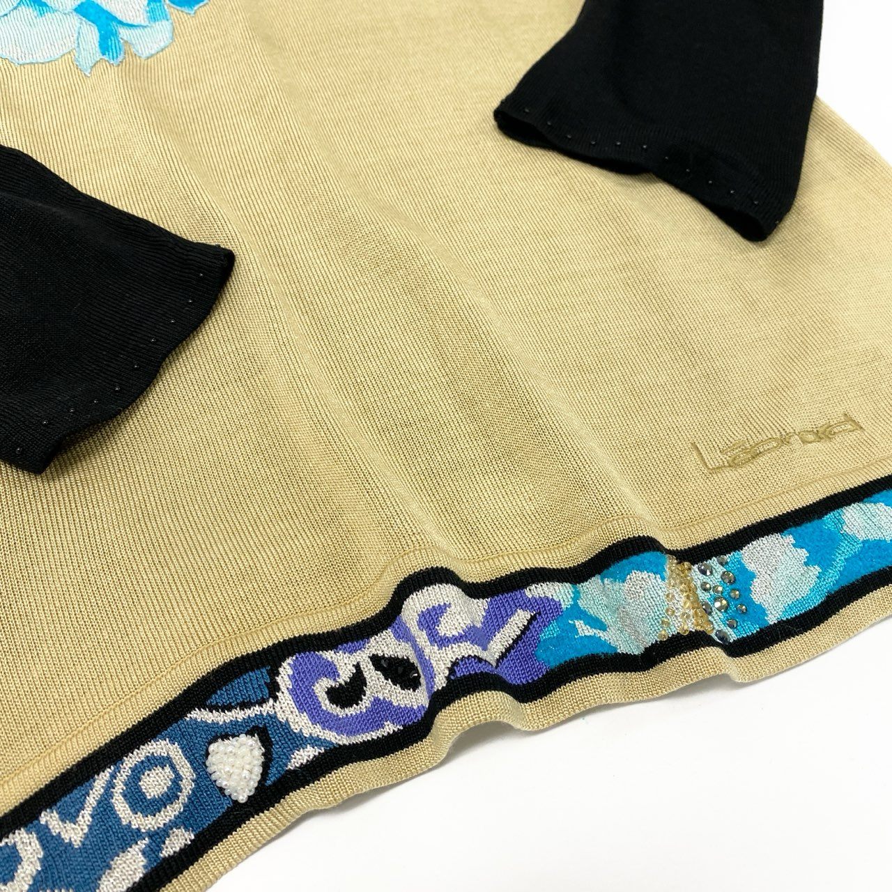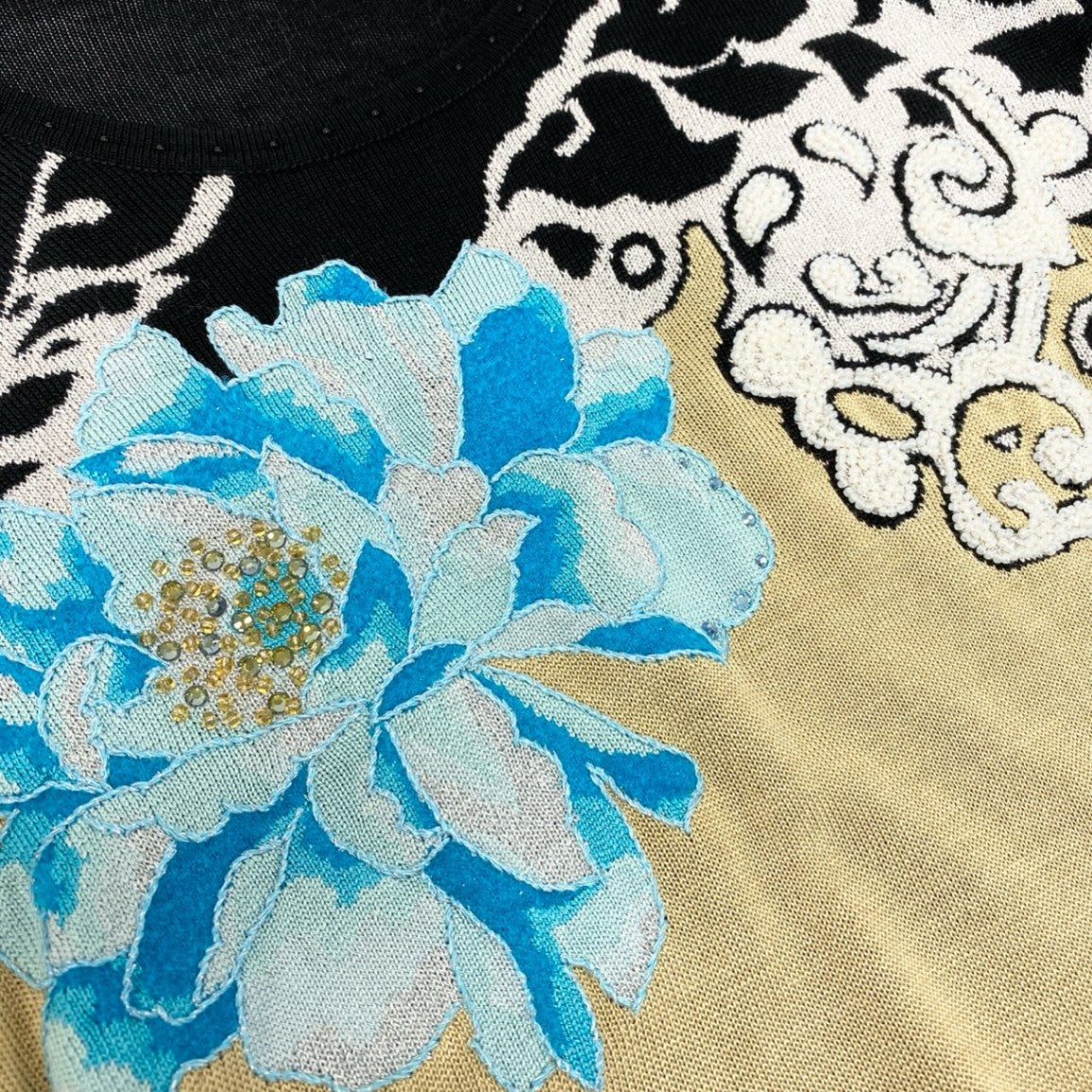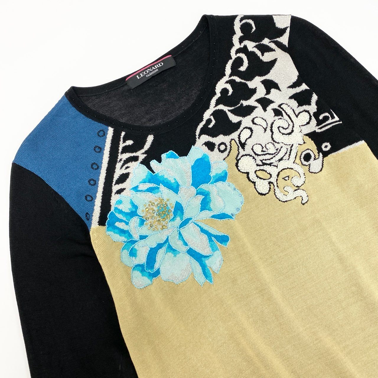 LEONARDらしいアート性の高い配色が魅力のシルクニットセーターで、ブラック×ベージュをベースに、ターコイズブルーの大輪フラワーが美しく映えるデザインです。滑らかで上品な光沢を持つシルクニット素材は、薄手ながら暖かく、肌あたりが非常に柔らかい高級質感。胸元や裾にはエレガントな抽象柄が配置され、1枚でコーディネートの主役になる華やかさを持ちます。七分袖寄りの軽さで春・秋・冬の3シーズン活躍し、ジャケットインにも相性抜群。上品さと存在感を両立した、LEONARDらしい一着です。