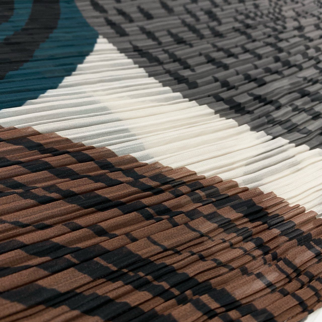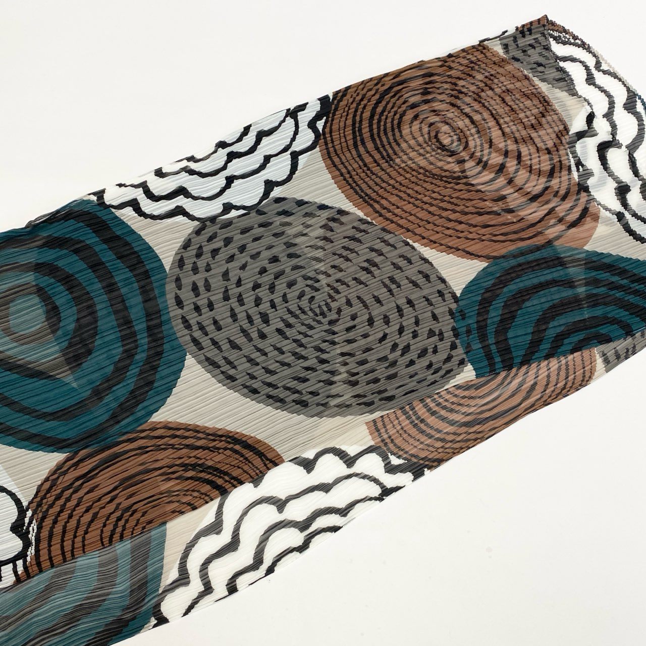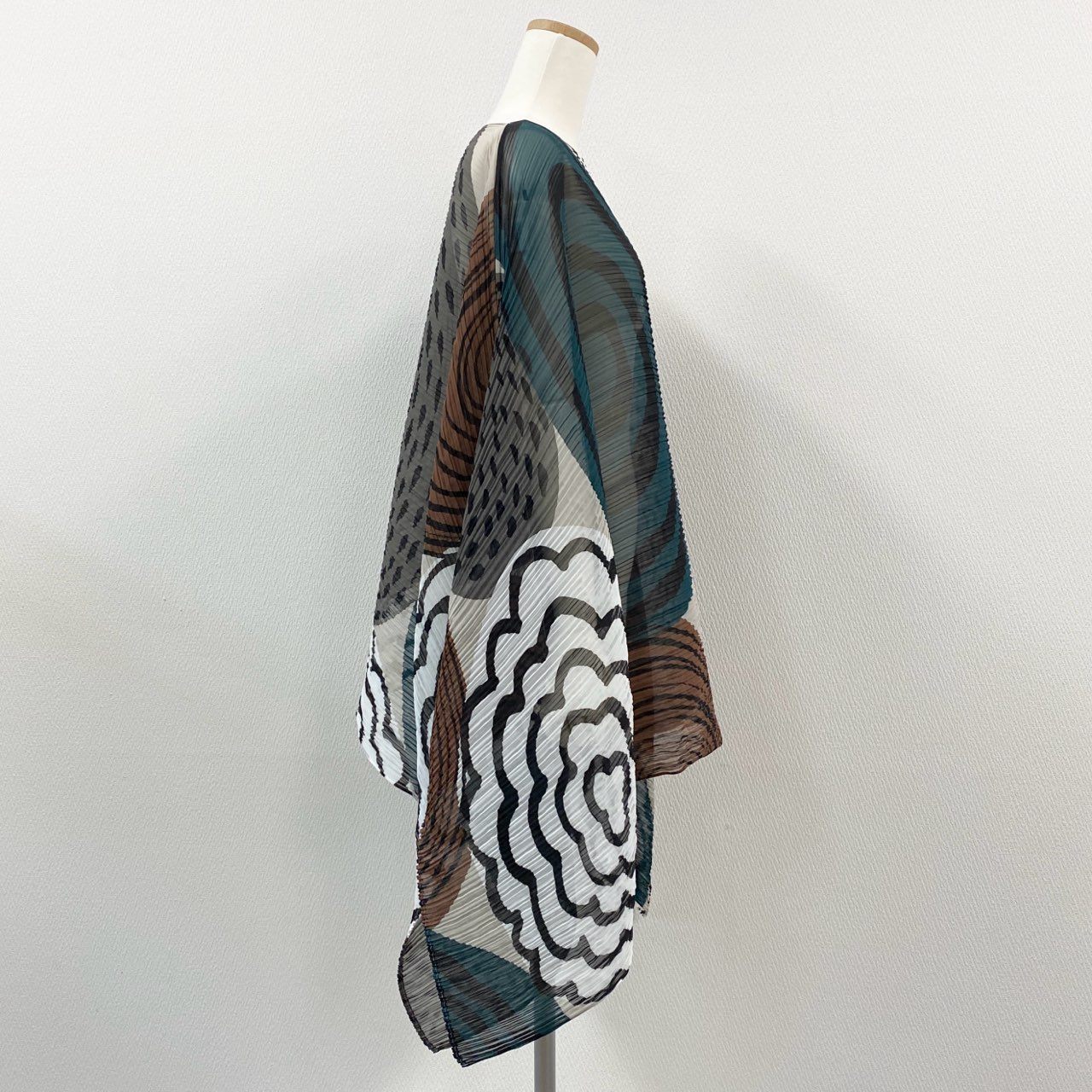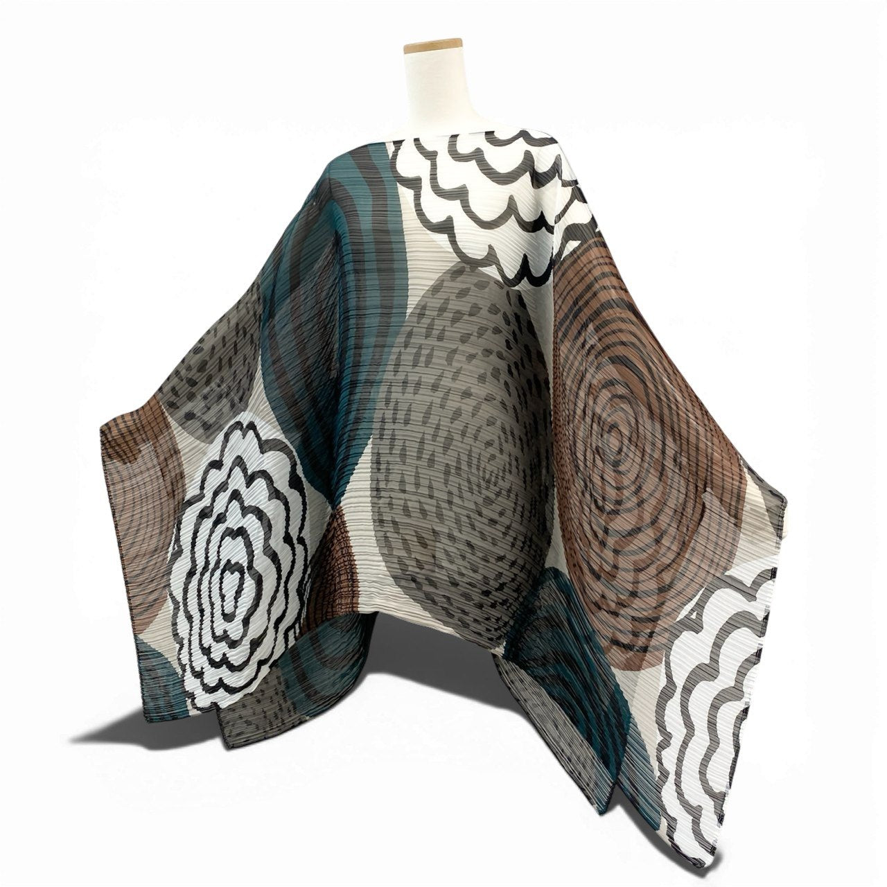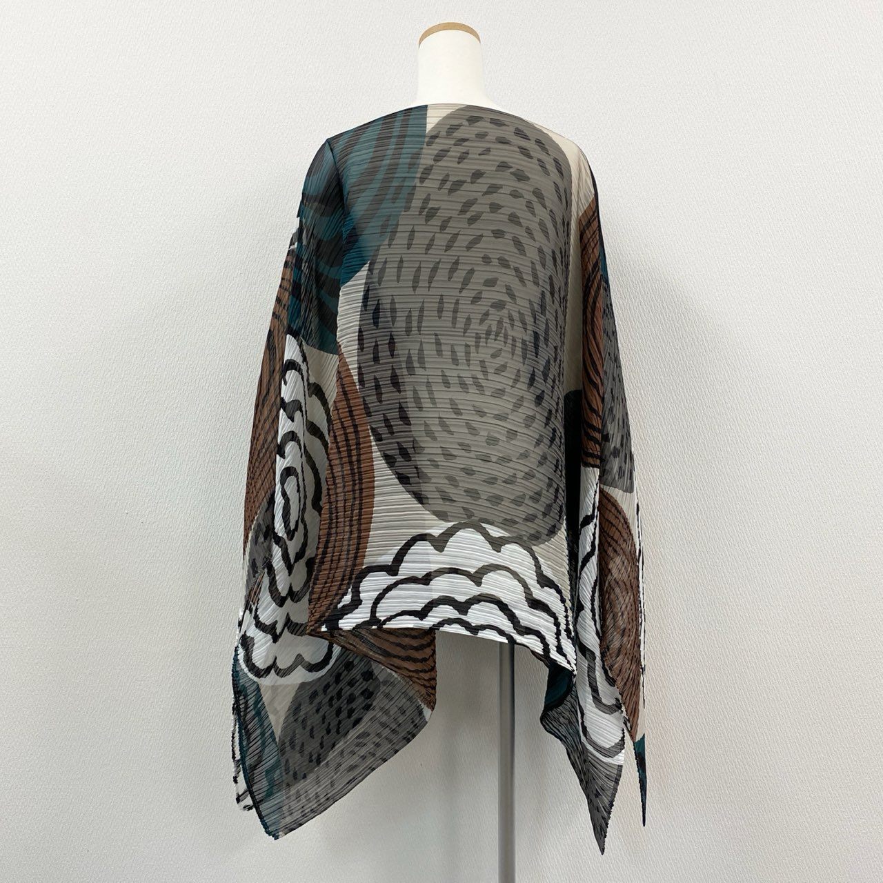 **PLEATS PLEASE**らしいアート性が際立つ、プリーツ仕様の変形ポンチョです。アイボリーをベースに、ブルーグリーンやブラウン、ブラックを組み合わせたジオメトリック柄が印象的。細かなプリーツによる立体感と、スカーフのような流れるシルエットがコーディネートに動きを与えます。シンプルなインナーやパンツに合わせるだけで映え、日常使いから旅行先まで活躍する一着です。