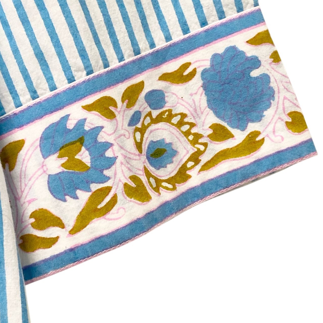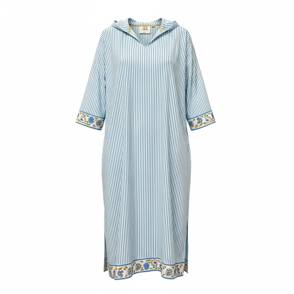 ホワイトベースにスカイブルーのストライプ柄が爽やかなロングワンピースです。 裾と袖口にはボタニカル調の装飾ボーダーが入り、リゾート感のあるデザイン。 マットなコットン素材で軽やかな着心地が魅力です。 一枚でリラックススタイルが完成し、夏のタウンユースやリゾートシーンにもおすすめの一着です。