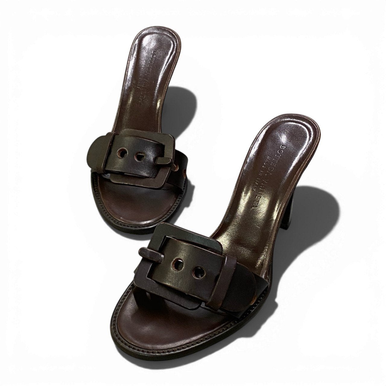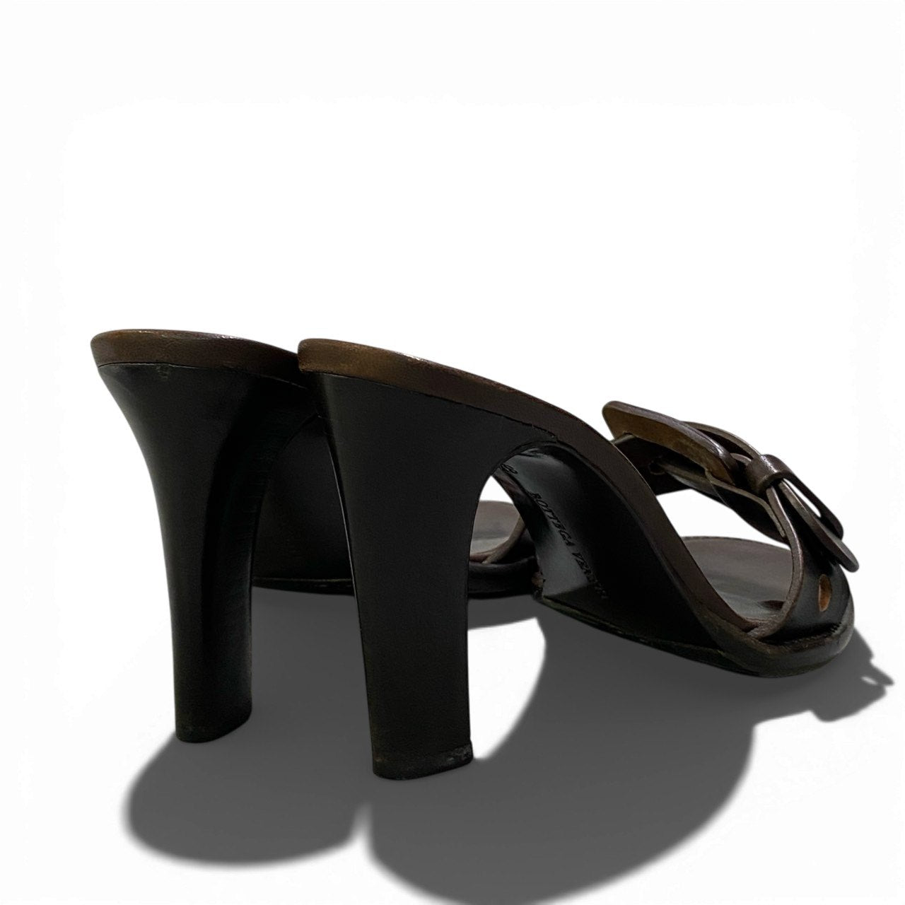1b12 BOTTEGA VENETA ボッテガヴェネタ バックルベルト レザーサンダル ヒールパンプス 37 ブラウン カーフレザー レディースk02i