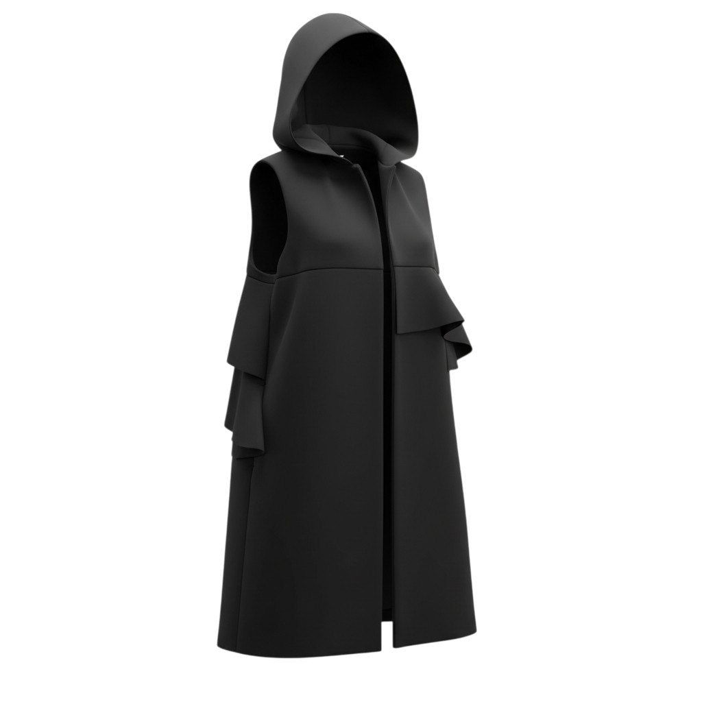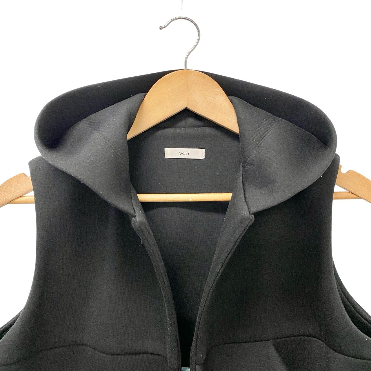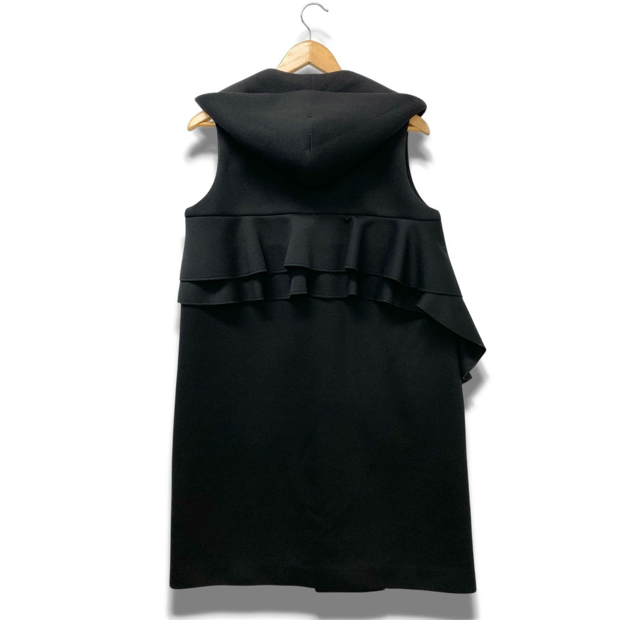 深みのあるブラックカラーの無地ロングジレです。 マットでハリのあるボンディング素材が構築的なシルエットを演出し、フード付きデザインが程よいカジュアル感をプラス。 フロントのアシンメトリーフリルが印象的で、シンプルながら存在感のある一着です。 パンツスタイルやワンピースとの重ね着で、モードにもきれいめにも着回せる万能アイテムです。