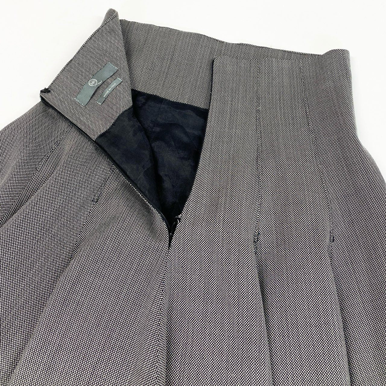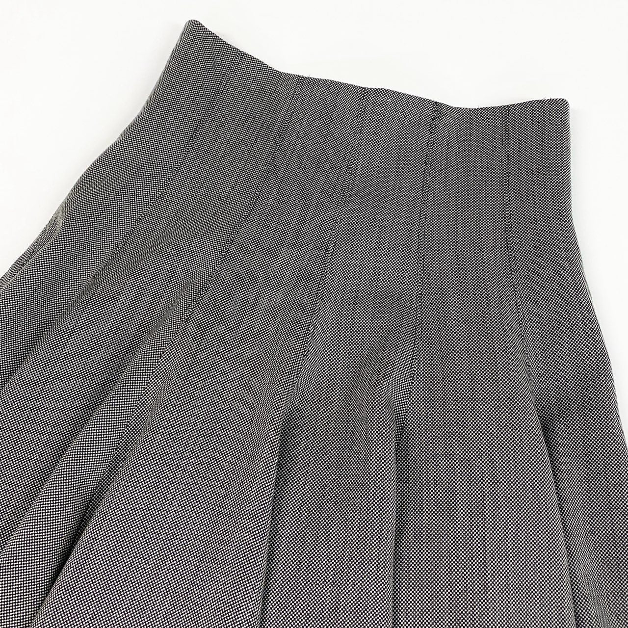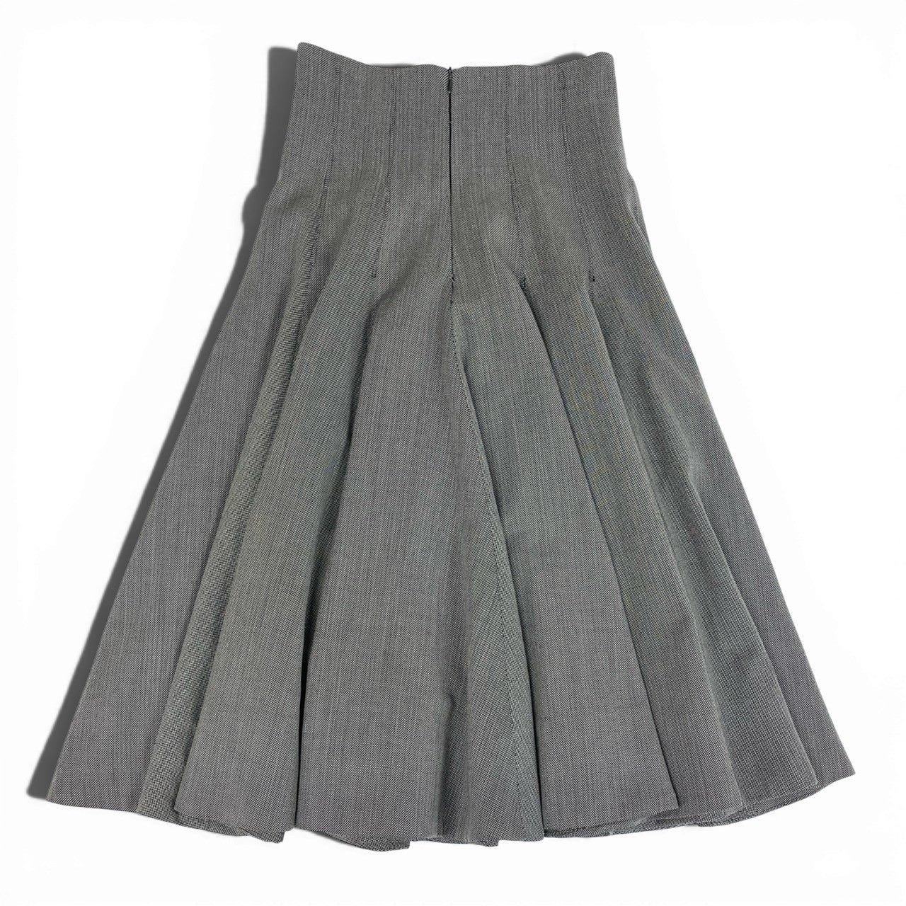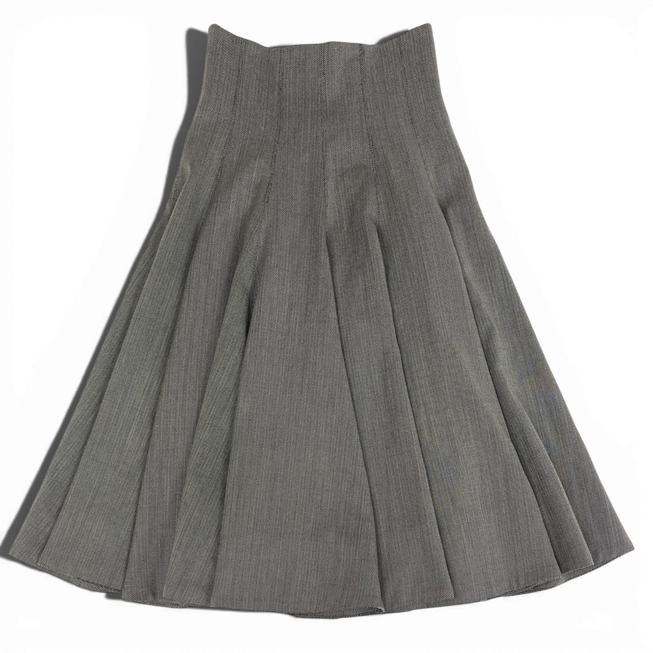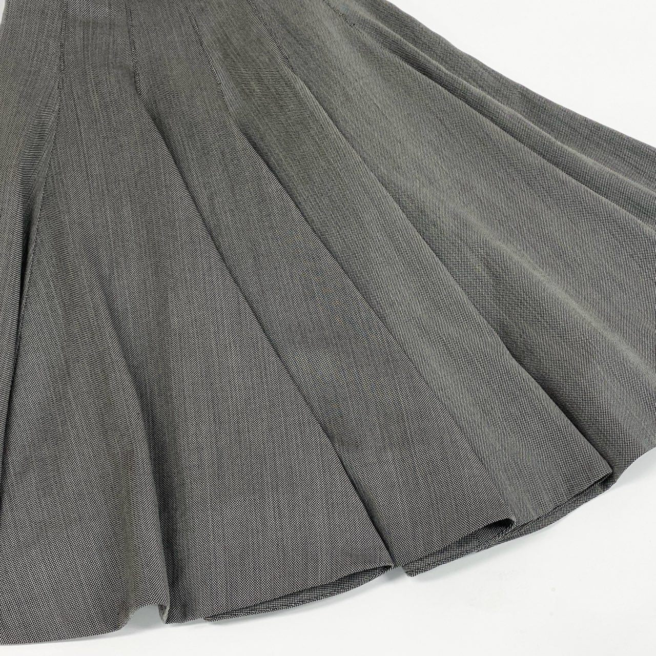 落ち着いたチャコールグレー系カラーが印象的な、アレキサンダーマックイーンのフレアスカートです。マットでハリ感のあるウール系素材に、立体的に構築されたプリーツが美しいシルエットを生み出します。こちらは希少性の高いバスストップ期らしい、彫刻的で存在感のあるデザインが魅力。シンプルなトップスと合わせるだけで主役になる、モード感あふれる一着です。