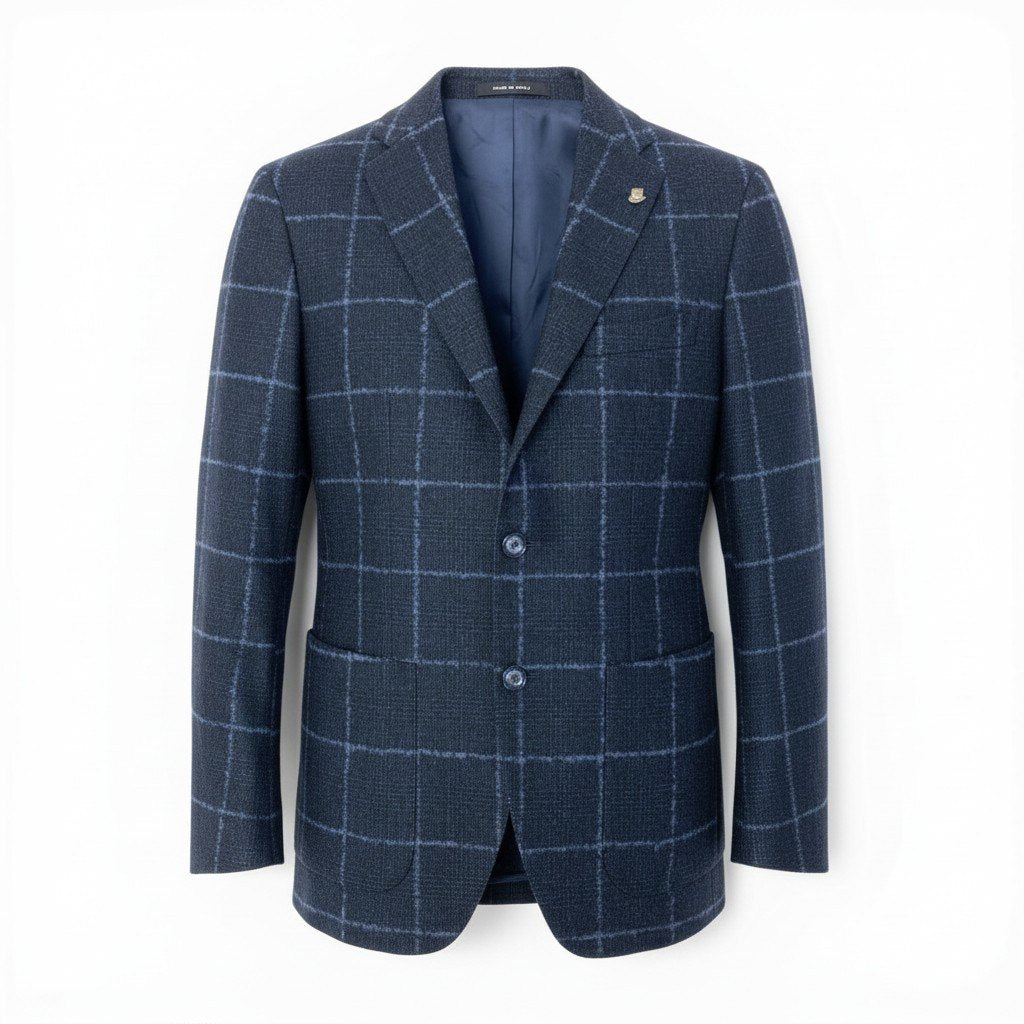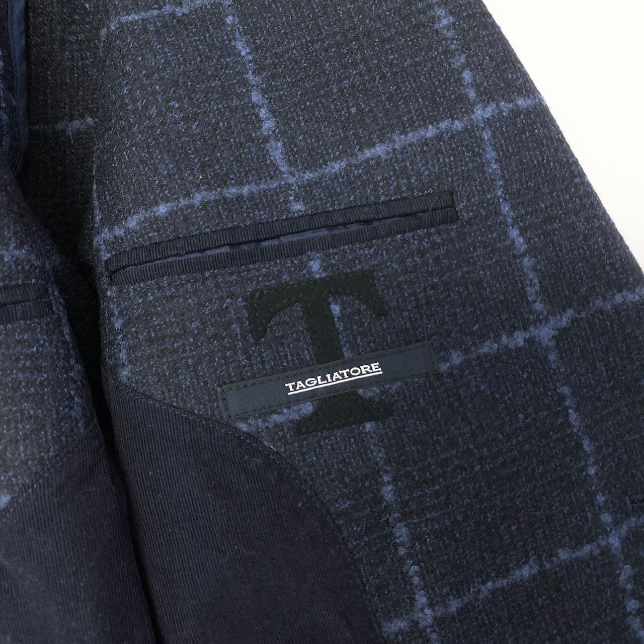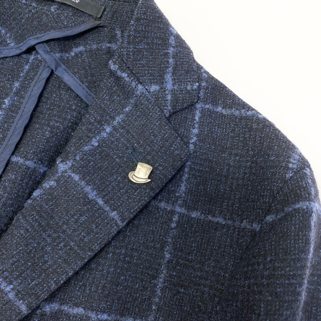 落ち着いたミッドナイトネイビーにウィンドウペンチェック柄が映えるTAGLIATOREのテーラードジャケットです。マットで上質なウール素材を使用し、軽やかで洗練された着心地が魅力。ラペルにあしらわれたメタルラベルピンがさりげないアクセントとなり、イタリアンテーラードらしい上品さを演出します。ビジネスからスマートカジュアルまで幅広く活躍する一着です。