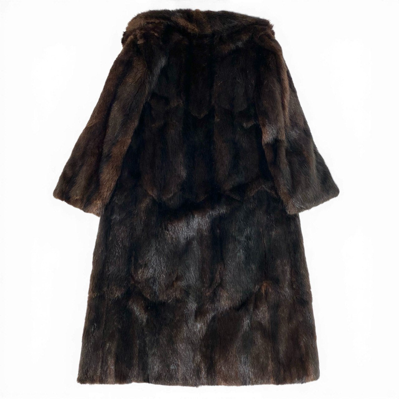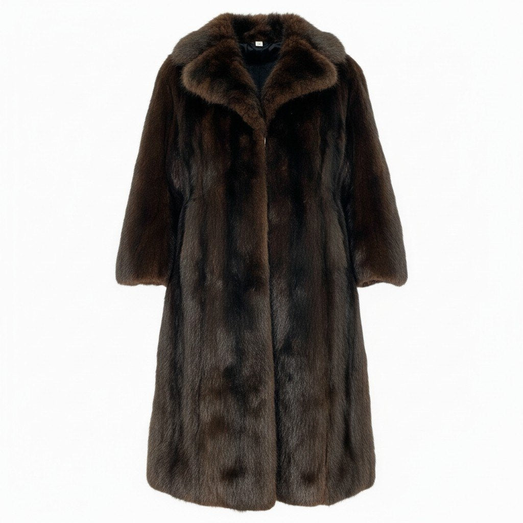深みのあるダークブラウンカラーが上品な印象を与える、本毛皮仕様のロングコートです。 柄のない無地デザインで、毛足の揃ったなめらかな質感と自然な艶感が高級感を引き立てます。 ひざ下まで届くロング丈で、防寒性が高くエレガントなシルエットが魅力です。 冬のお出かけ、フォーマル寄りの外出シーンまで幅広く活躍する一着です。